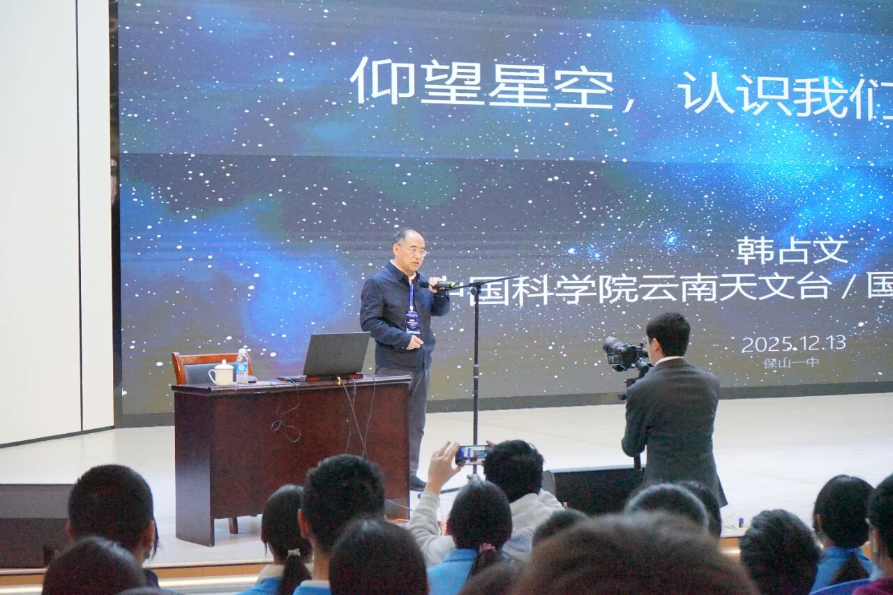 12月13日,“科学与中国”西部行——“千名院士·千场科普”首场启动报告在保山第一中学开讲。中国科学院院士、中国科学院云南天文台研究员韩占文,以《仰望星空,认识我们的宇宙家园》为题,为高一、高二全体学生、教师以及初一、初二年级四个科学实验班1700余人带来了一场别开生面的科普报告。