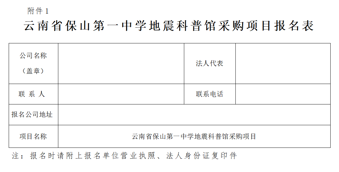 3.报名方式:填写附件1(云南省保山第一中学地震科普馆采购项目报名表),提供报名单位营业执照、法人身份证复印件在规定时间内交至指定地点,或转换为PDF格式文件发送至邮箱:1344809715@qq.com。
