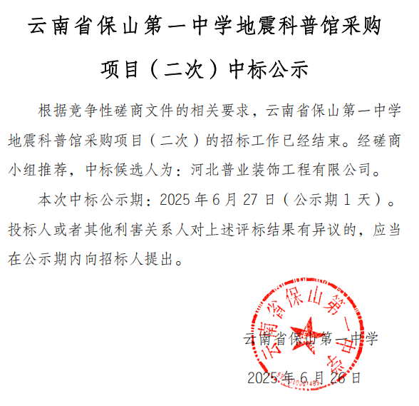 云南省保山第一中学地震科普馆采购项目(二次)中标公示
