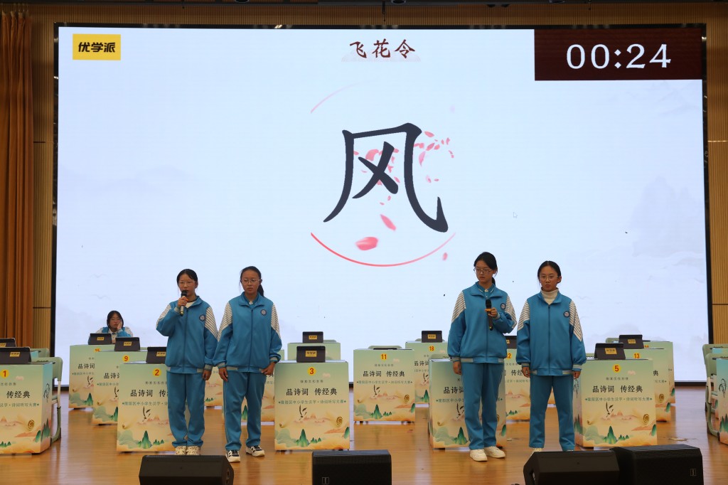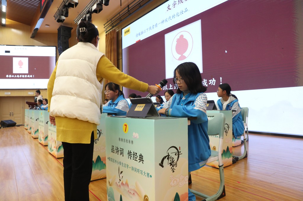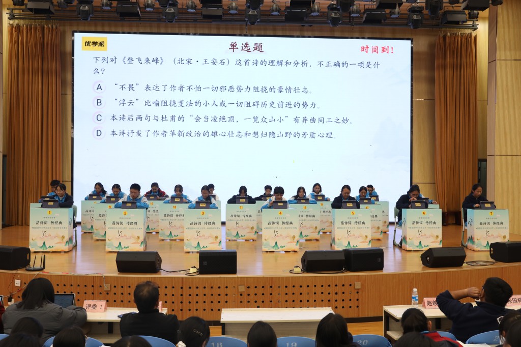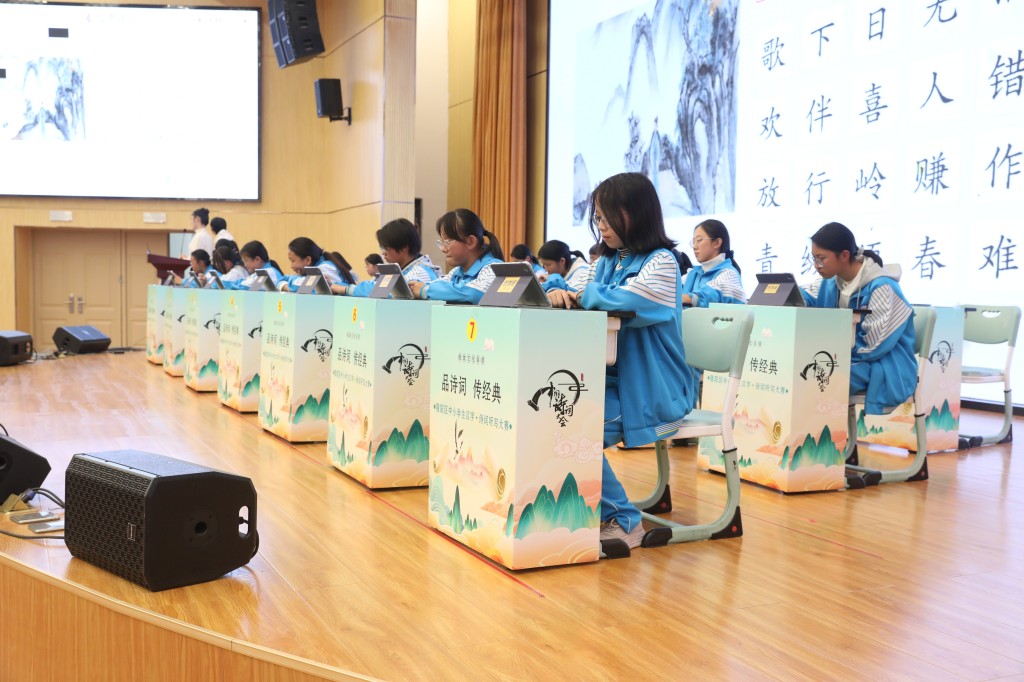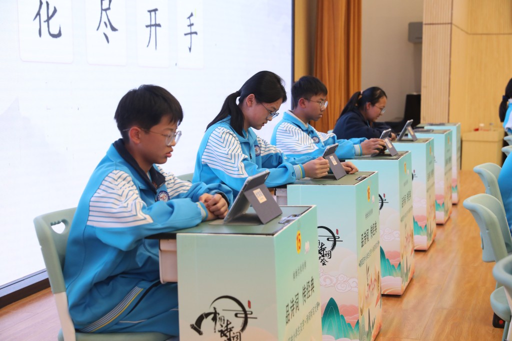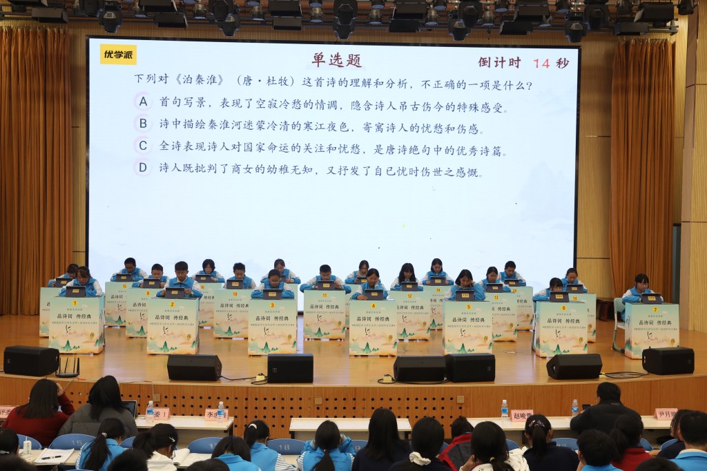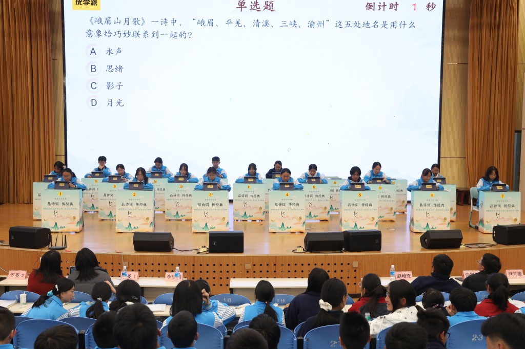 本次擂台赛以“弘扬经典,浸润书香”为核心,题目涵盖初中课内必背古诗词及课外积累篇目,设置诗词接龙、点字成诗、飞花令等七大题型,通过晋级赛与决赛两大阶段层层筛选,全方位考验选手的诗词积累与临场应变能力。中国汉字听写大会技术支持方、优学派公司提供的专业设备与题库,更让比赛兼具专业性与趣味性。