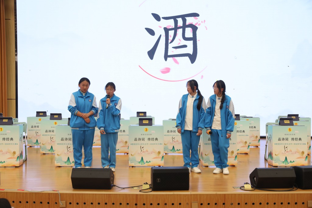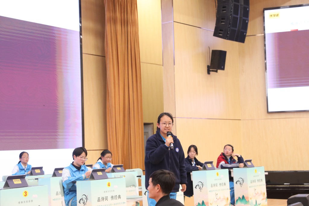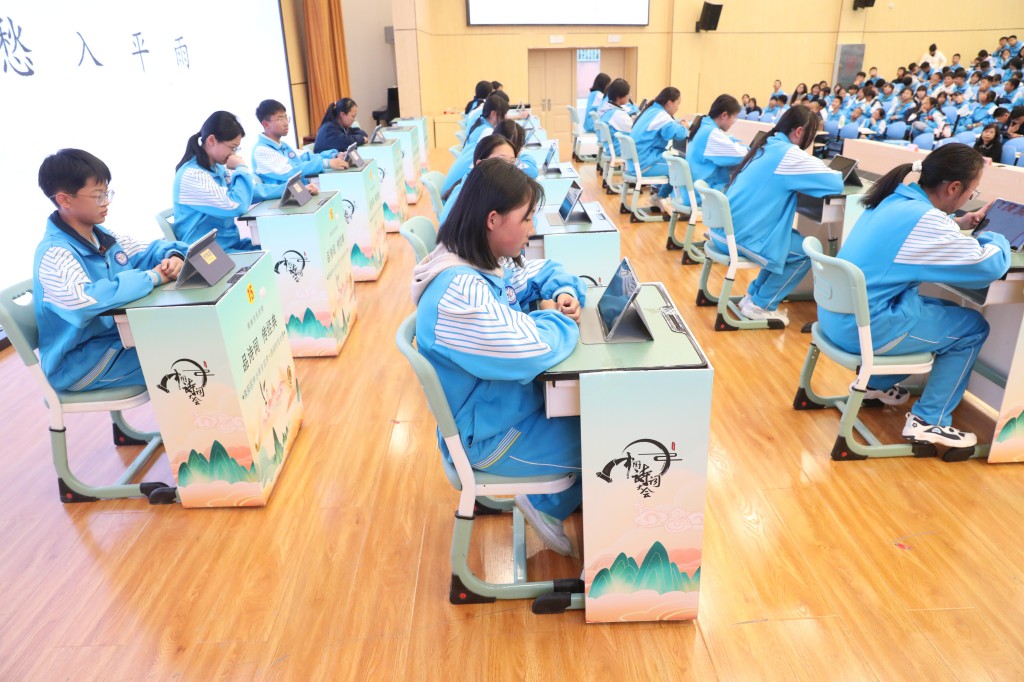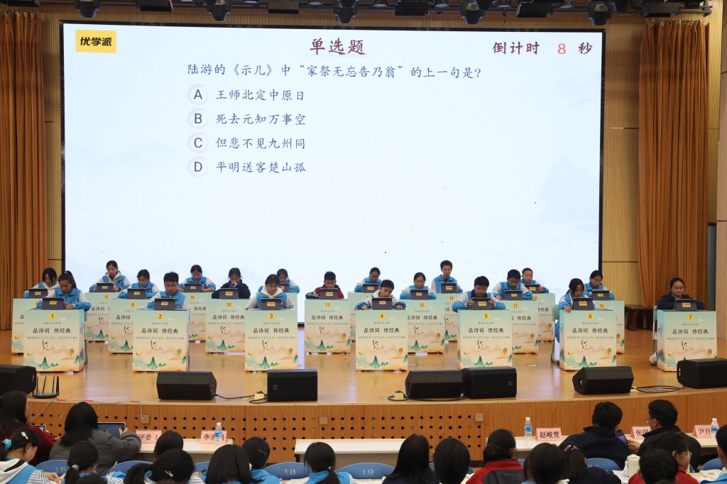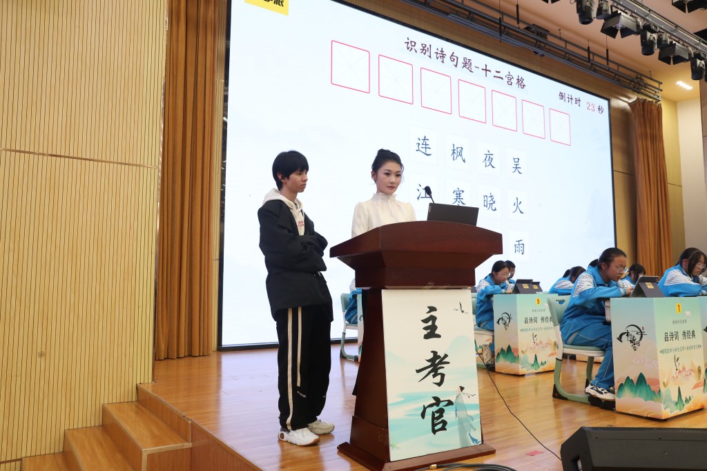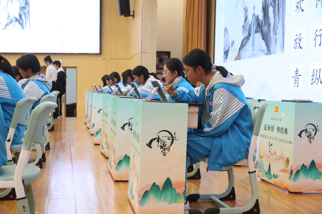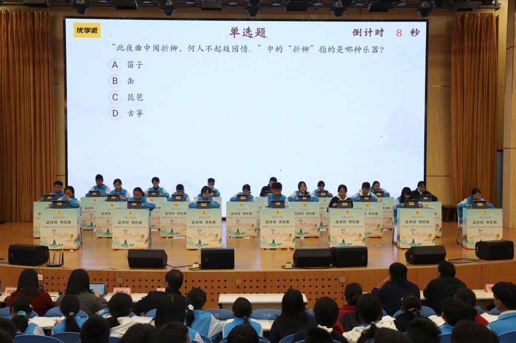 本次擂台赛以“弘扬经典,浸润书香”为核心,题目涵盖初中课内必背古诗词及课外积累篇目,设置诗词接龙、点字成诗、飞花令等七大题型,通过晋级赛与决赛两大阶段层层筛选,全方位考验选手的诗词积累与临场应变能力。中国汉字听写大会技术支持方、优学派公司提供的专业设备与题库,更让比赛兼具专业性与趣味性。