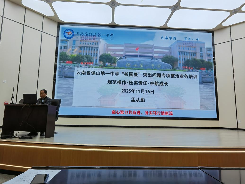 为深入贯彻落实全市中小学“校园餐”专项整治工作要求,切实筑牢食品安全防线,保障师生饮食健康与生命安全,保山一中以“小切口”破解“大问题”,2025年11月16日,学校及时召开食品安全突出问题整治工作部署动员会,开展食堂规范管理培训、组织食堂从业人员到保山智源初级中学现场观摩,针对学校高中校区食堂承包经营问题整改进行专题研究,全链条、多维度推动校园食品安全管理工作走深走实。陈顺忠副校长主持相关会议。