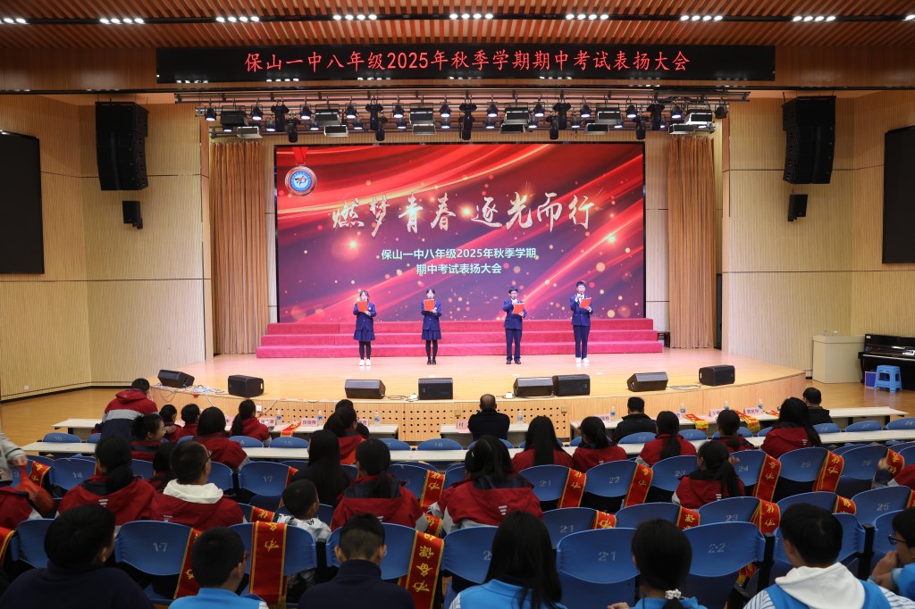 为表扬优秀,激励那些逐梦远航的奋进者,2025年11月22日下午,保山一中在树人堂隆重举行八年级期中区统测表扬大会。