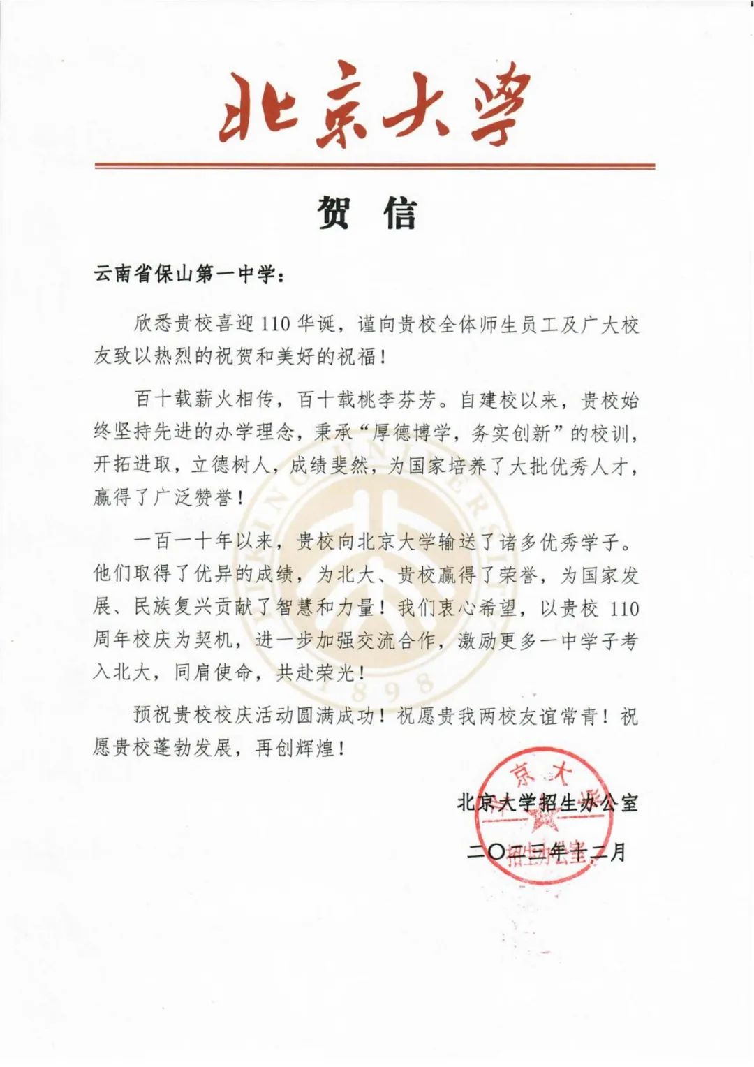 在保山一中建校110周年之际,北京大学惠赐贺信,勖勉学子,为我校110周年校庆增光添彩;给我校求索奋进,砥砺前行及勉励师生注入精神动力;激励我校更多莘莘学子求实进取,力争桂冠。