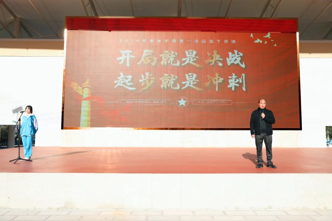 升旗仪式上,党委书记、校长付飞为师生们上了一堂题为《开局就是决战 起步就是冲刺》的新学期思政课。付飞校长以最近热映的电影《热辣滚烫》,启迪师生要珍爱自己,努力做最好的自己。面对新的学期、新的任务、新的挑战、付飞校长向大家提出八点希望和要求:一是及时收心。人到、心至、神聚、力尽、学勤;二是瞄准靶心。树立目标,瞄准方向,拼搏到底;三是狠下决心。人生从未被定义,改变自己,一切都来得及,只要咬牙坚持努力向上,一切都会水到渠成;四是务必用心。认真做事只能把事做对,用心做事才能把事做好;五是怀揣爱心。爱国、爱校、爱师、爱己、爱学;六是坚守初心。坚守到保山一中好好学习、好好做人的初心,守好让身边人因我而幸福的做人底线,守住遵规守纪、利人利己,违规违纪、害人害己的纪律红线;七是保持舒心。青春没烦恼,开心每一天;八是坚定信心。心中有信仰,脚下有力量!