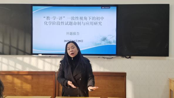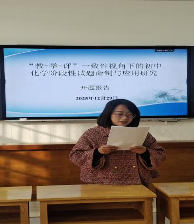 杨金老师主持的课题为《“教—学—评”一致性视角下的初中化学阶段性试题命制与应用研究》。在开题论证过程中,她主要从研究背景与价值、概念界定、步骤举措、成果预期四大维度展开汇报。在论证环节,评审专家结合汇报内容深入研讨,提出建设性指导意见,经集中合议形成《专家评议要点》并现场签字确认。负责人作表态发言,对专家精准指导表示诚挚感谢,明确将全面梳理、充分吸收意见建议,进一步优化完善研究方案。