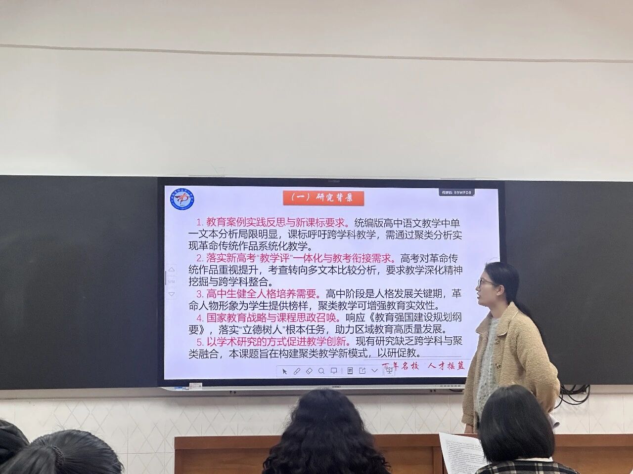 邵祺老师主持的课题为《跨学科教学:课程思政视域下高中语文革命人物形象聚类教学探析》,在开题论证过程中,她主要从研究背景与价值、概念界定、步骤举措、成果预期、创新点五大维度展开汇报。该课题立足新课标与新高考要求,希望破解单一文本教学局限,通过跨学科整合与聚类分析,以革命人物形象为核心,深挖思政元素,计划形成论文、教学资源包、等可推广成果,兼具理论突破与实践价值,为高中语文革命传统教育提供新路径。