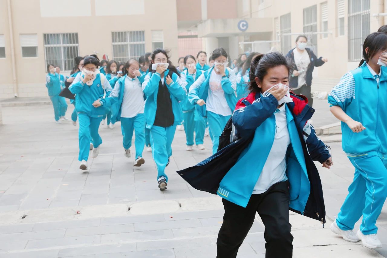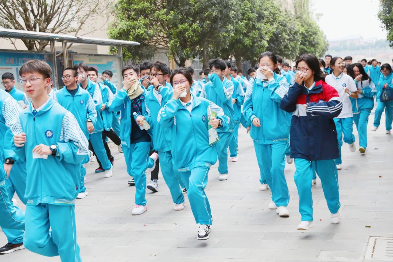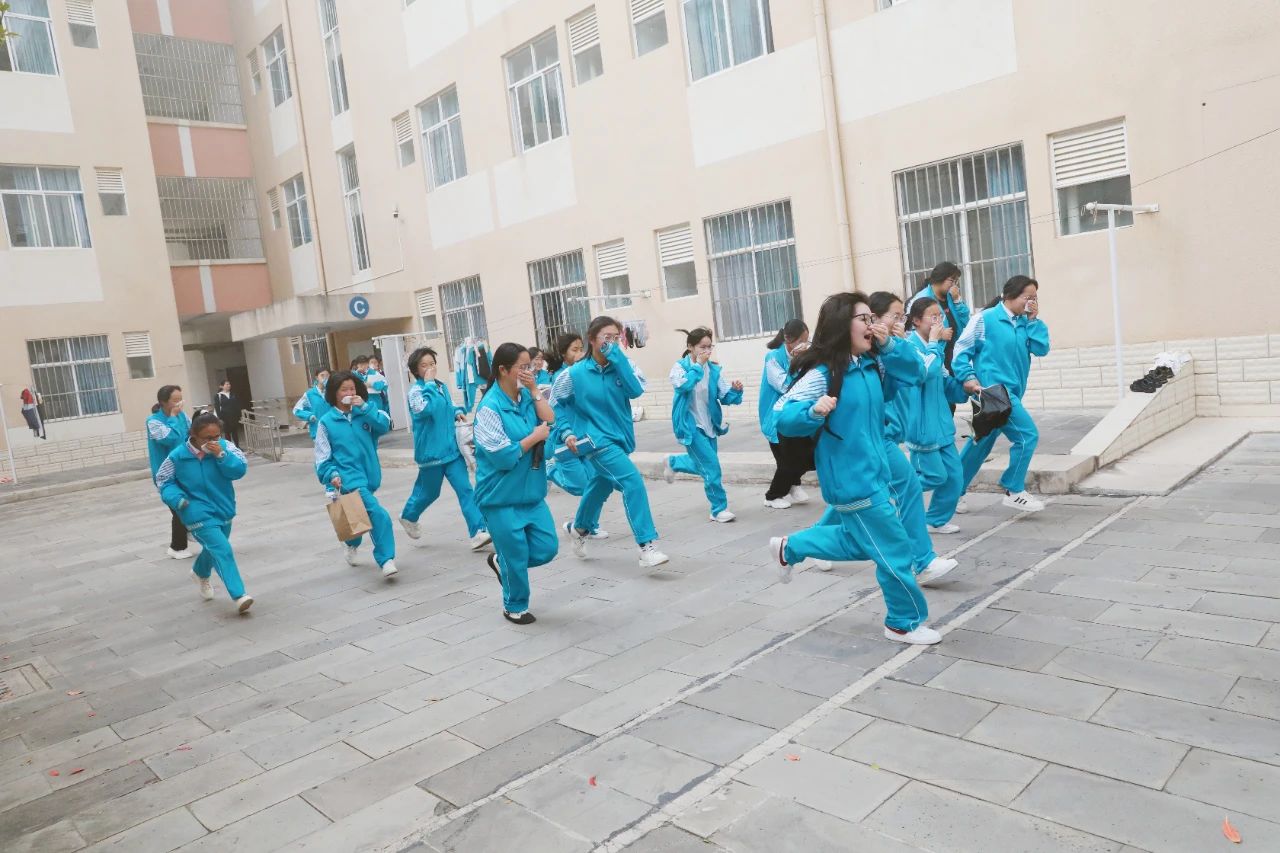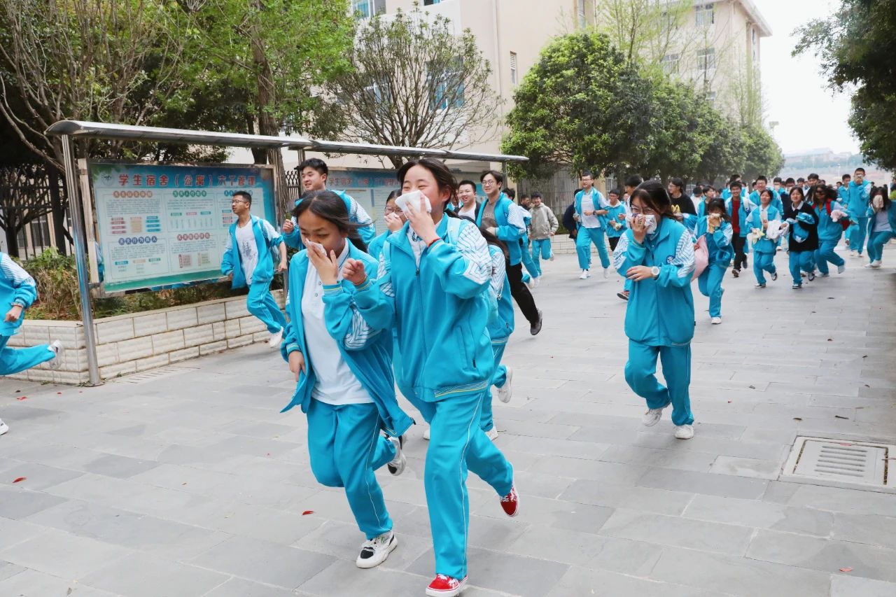 下午13时40分,演练正式开始,各楼层的负责教官、宿管员、各班班主任提前到达指定岗位,对疏散通道进行最后的检查。随着一阵急促的警报声响起,接到紧急疏散信号后,各班学生在老师的带领下,捂住口鼻,弯腰俯身,快速有序地往预定地点疏散。学生疏散完毕后,各楼层疏导老师认真负责地检査该层的所有宿舍,确保全部人员安全撤离。到达疏散地点后,各班迅速整队,班主任清点、统计人数,并及时向学校总指挥汇报。