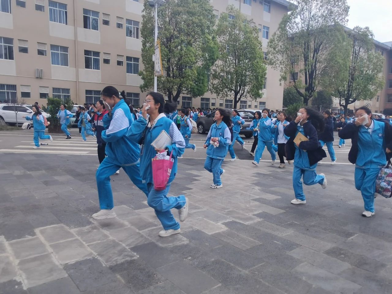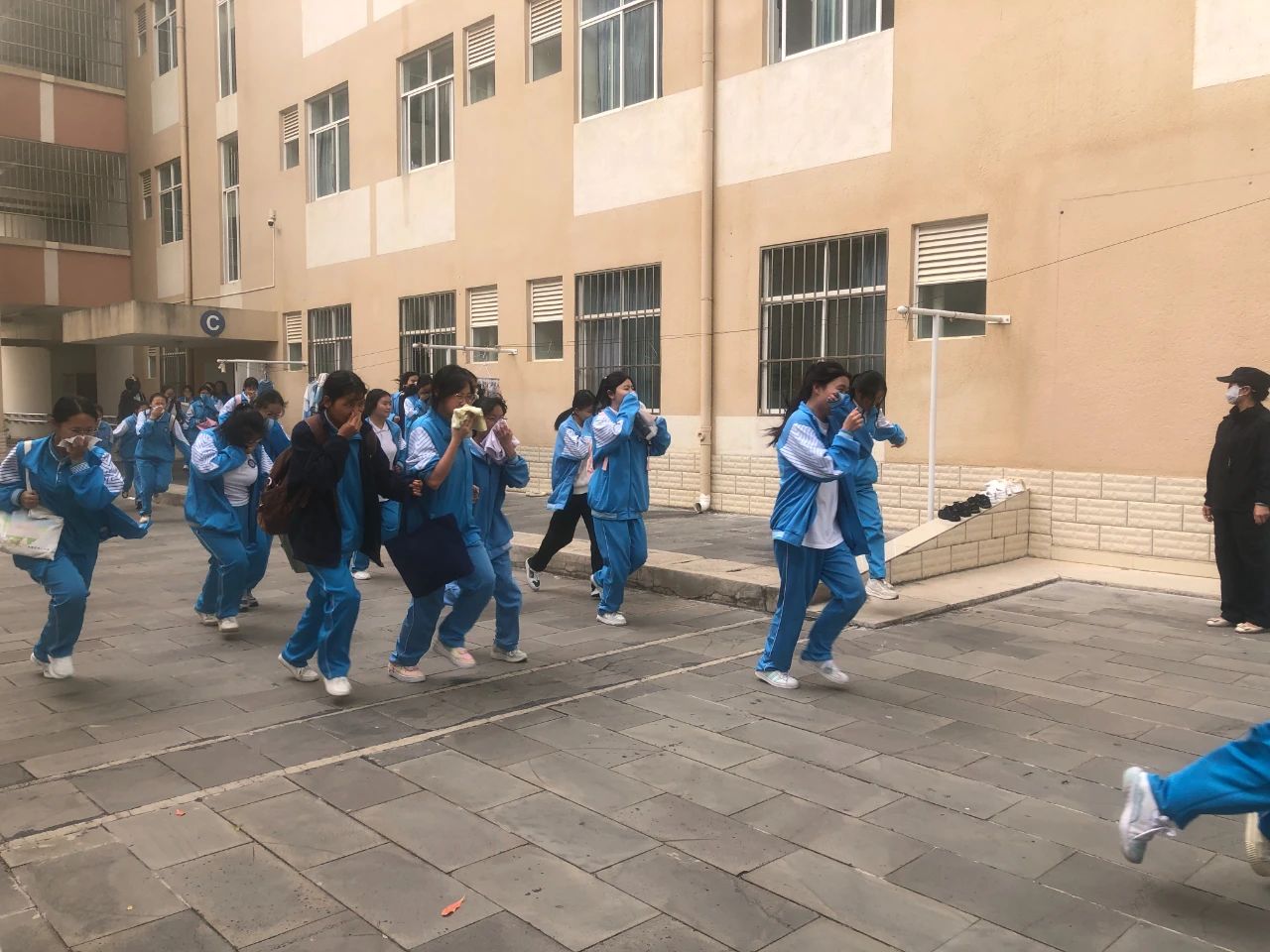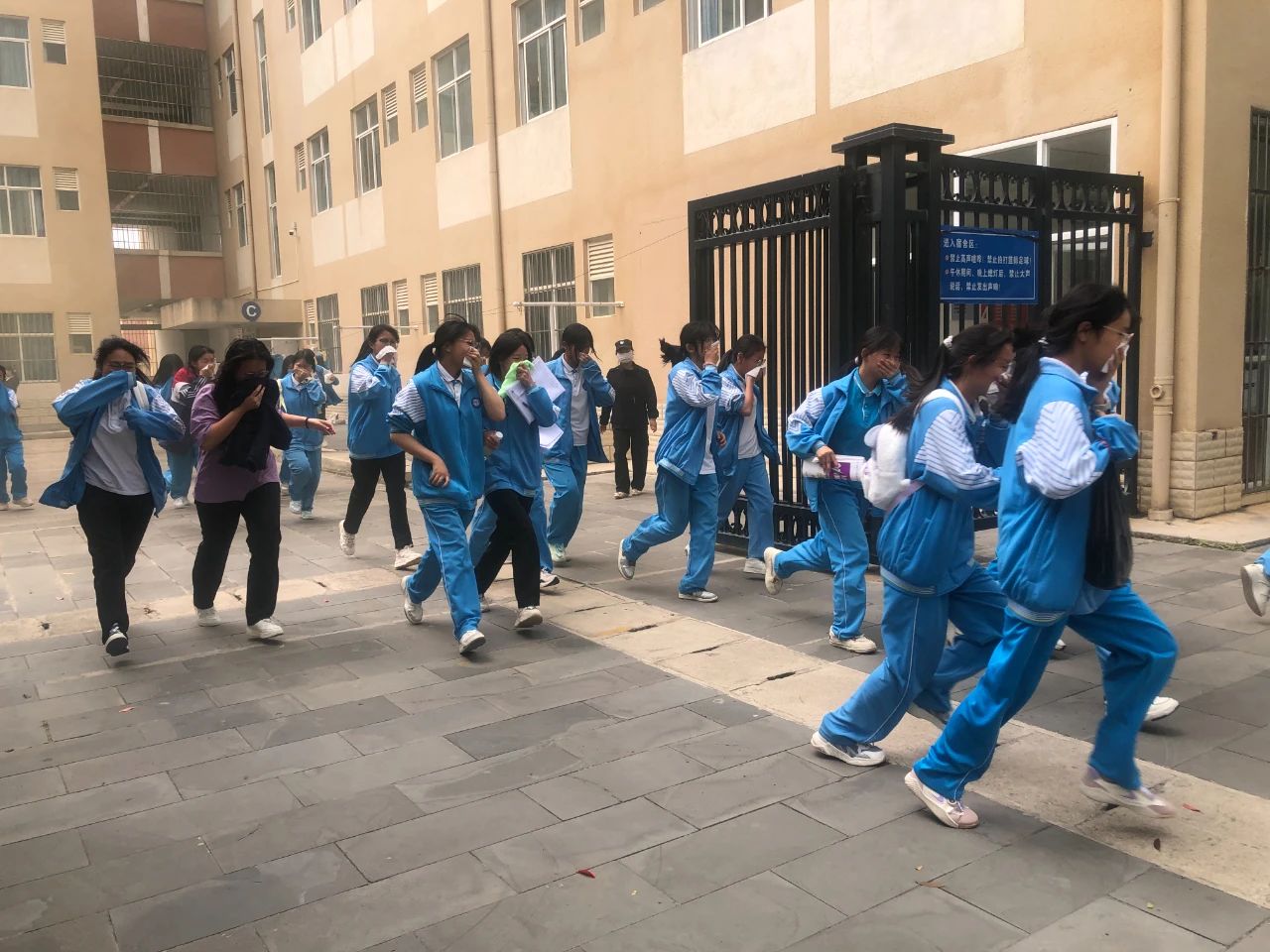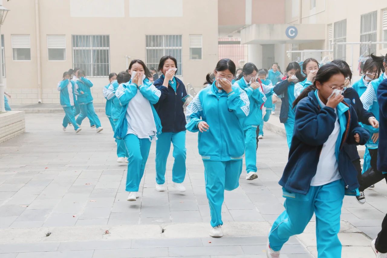 下午13时40分,演练正式开始,各楼层的负责教官、宿管员、各班班主任提前到达指定岗位,对疏散通道进行最后的检查。随着一阵急促的警报声响起,接到紧急疏散信号后,各班学生在老师的带领下,捂住口鼻,弯腰俯身,快速有序地往预定地点疏散。学生疏散完毕后,各楼层疏导老师认真负责地检査该层的所有宿舍,确保全部人员安全撤离。到达疏散地点后,各班迅速整队,班主任清点、统计人数,并及时向学校总指挥汇报。
