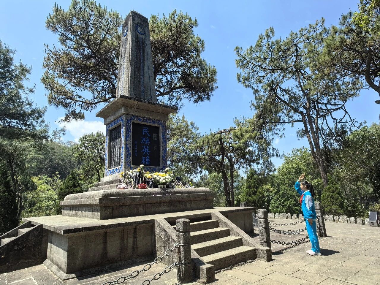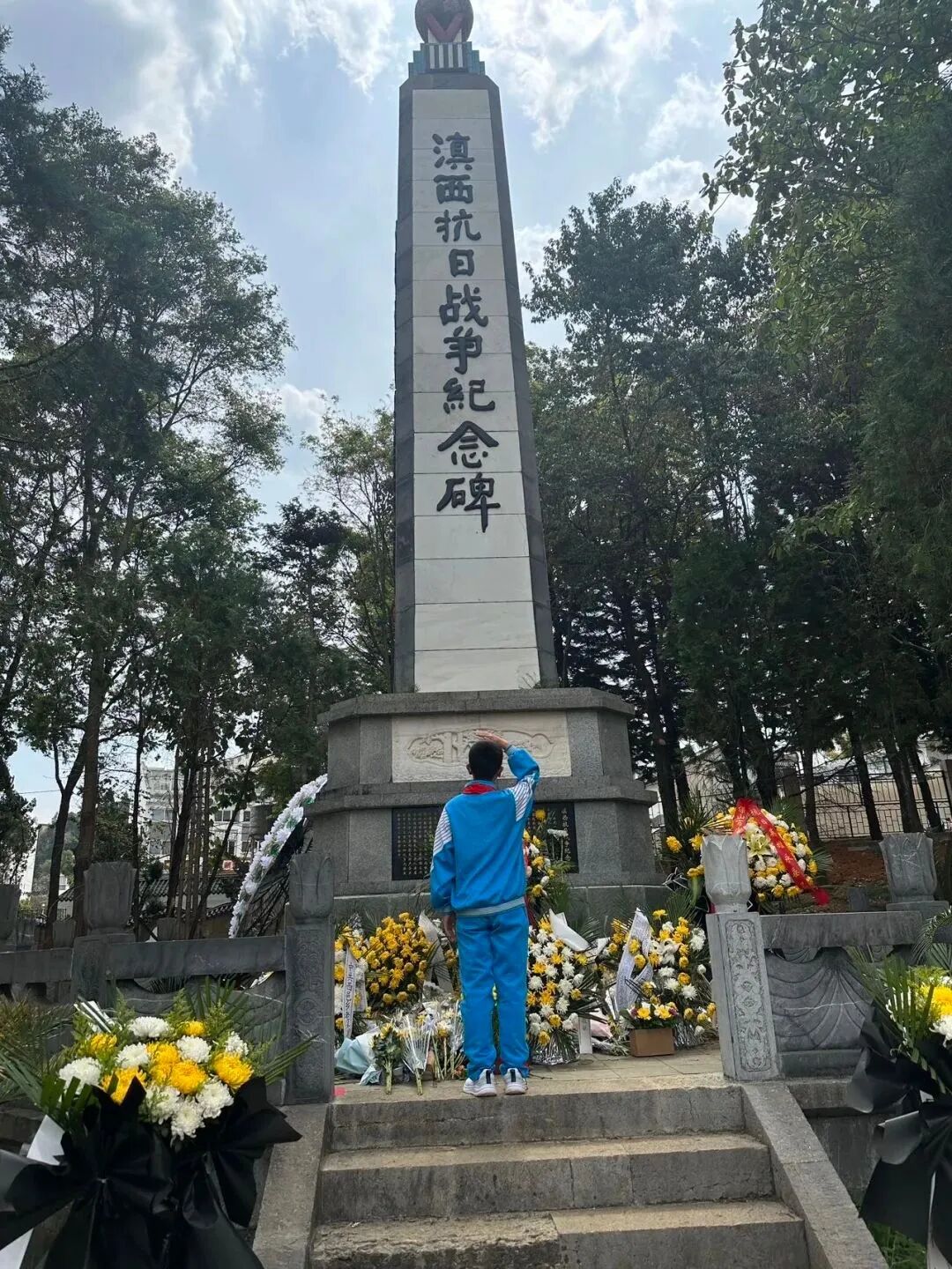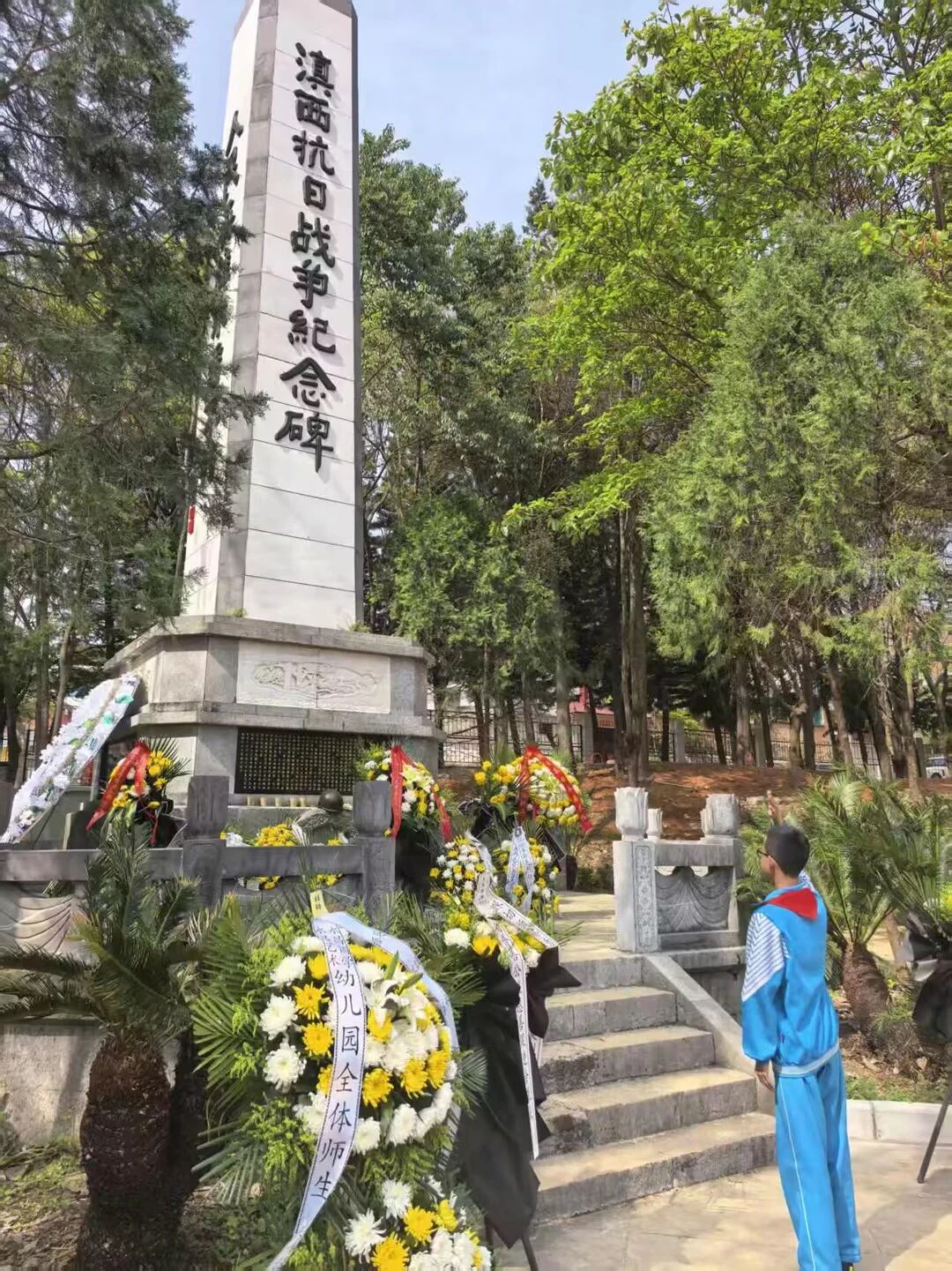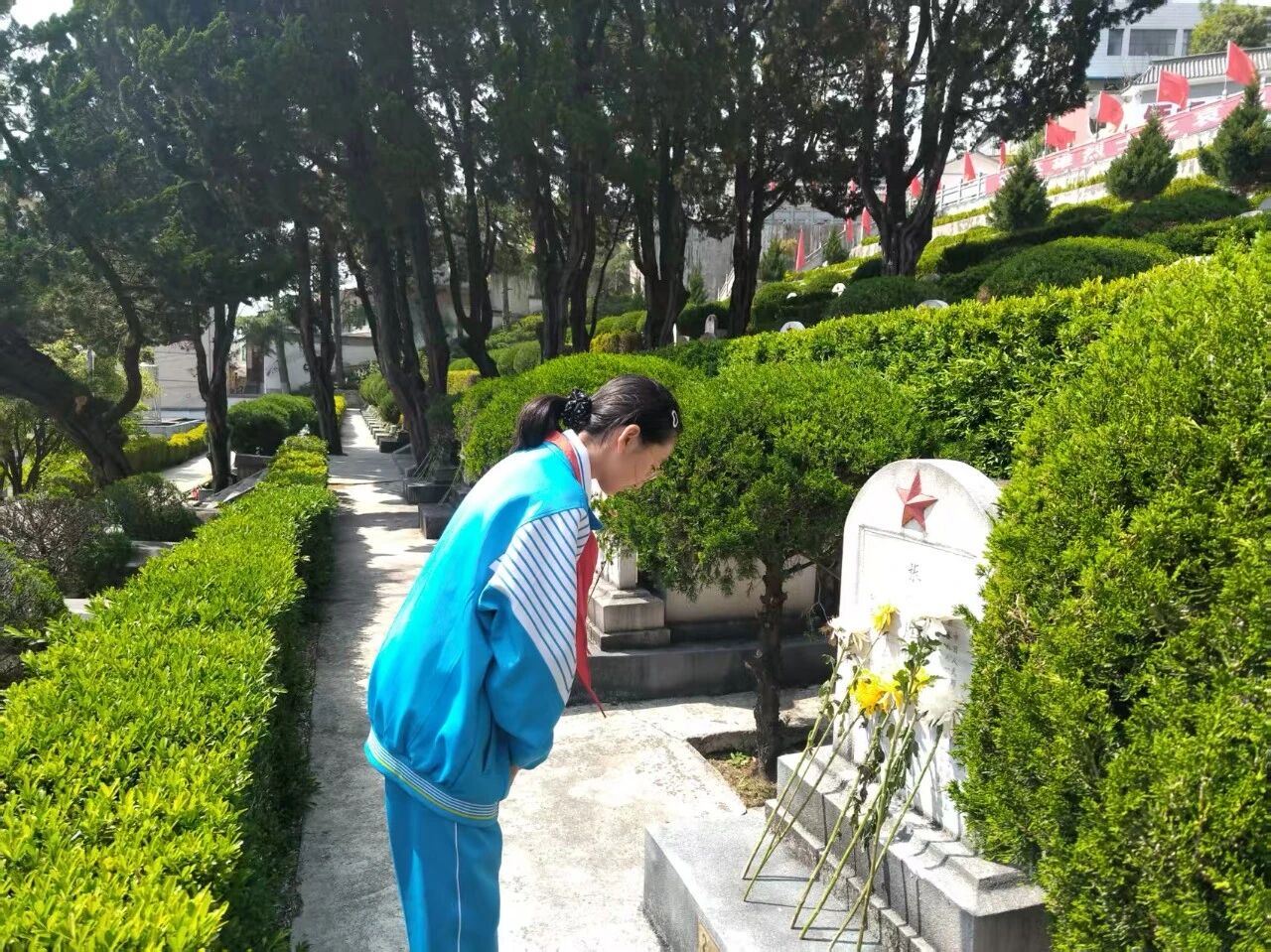 肃立默哀,一分钟的静默承载着无尽的敬意;敬献菊花或亲手制作的小白花,绿色文明祭扫传递着真挚的缅怀。队员们认真聆听讲解,学习滇西抗战的悲壮历史,在纪念碑前三鞠躬、行队礼,瞻仰纪念设施时安静肃穆,展现出“天南学府”学子良好的精神风貌。