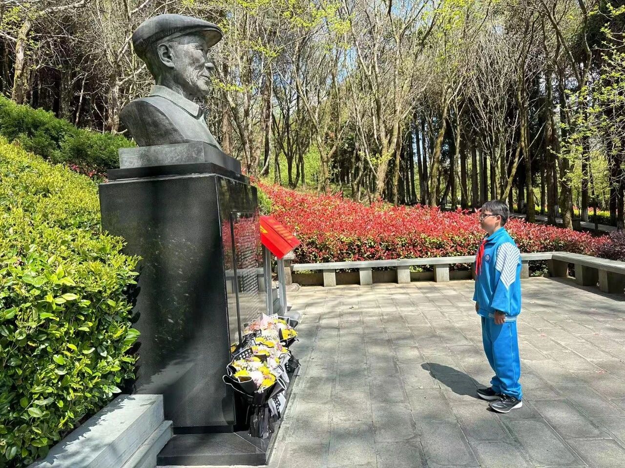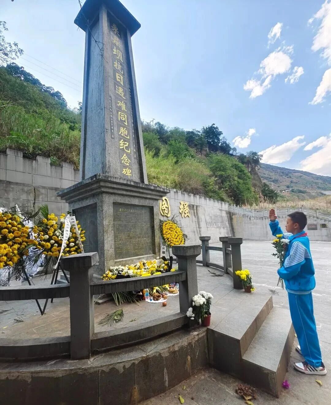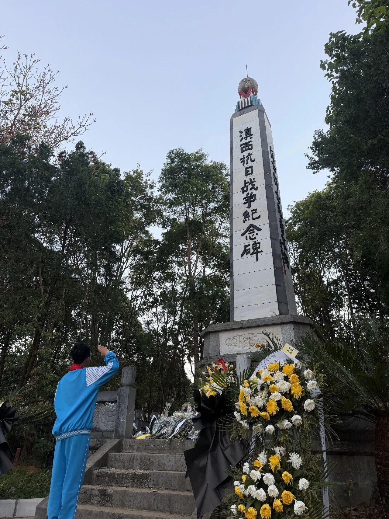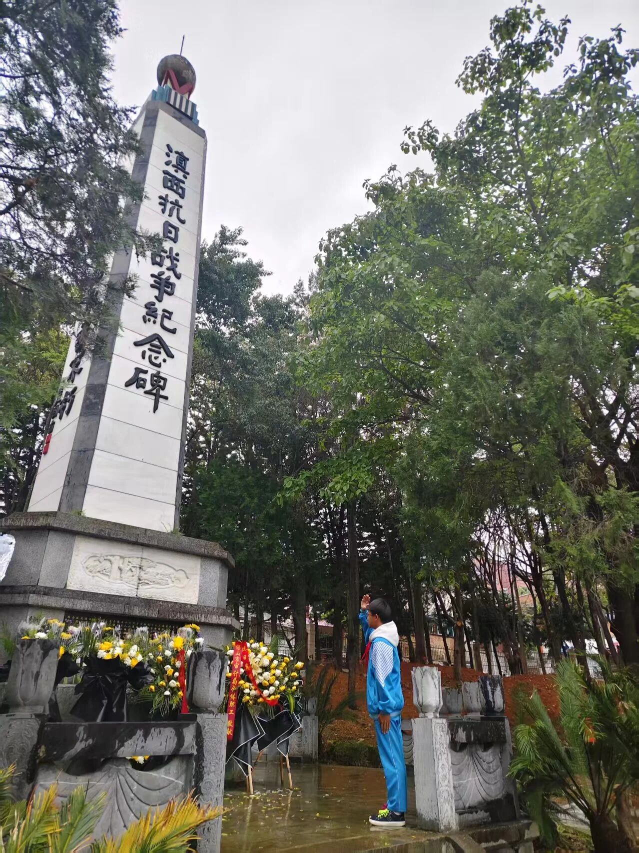 肃立默哀,一分钟的静默承载着无尽的敬意;敬献菊花或亲手制作的小白花,绿色文明祭扫传递着真挚的缅怀。队员们认真聆听讲解,学习滇西抗战的悲壮历史,在纪念碑前三鞠躬、行队礼,瞻仰纪念设施时安静肃穆,展现出“天南学府”学子良好的精神风貌。