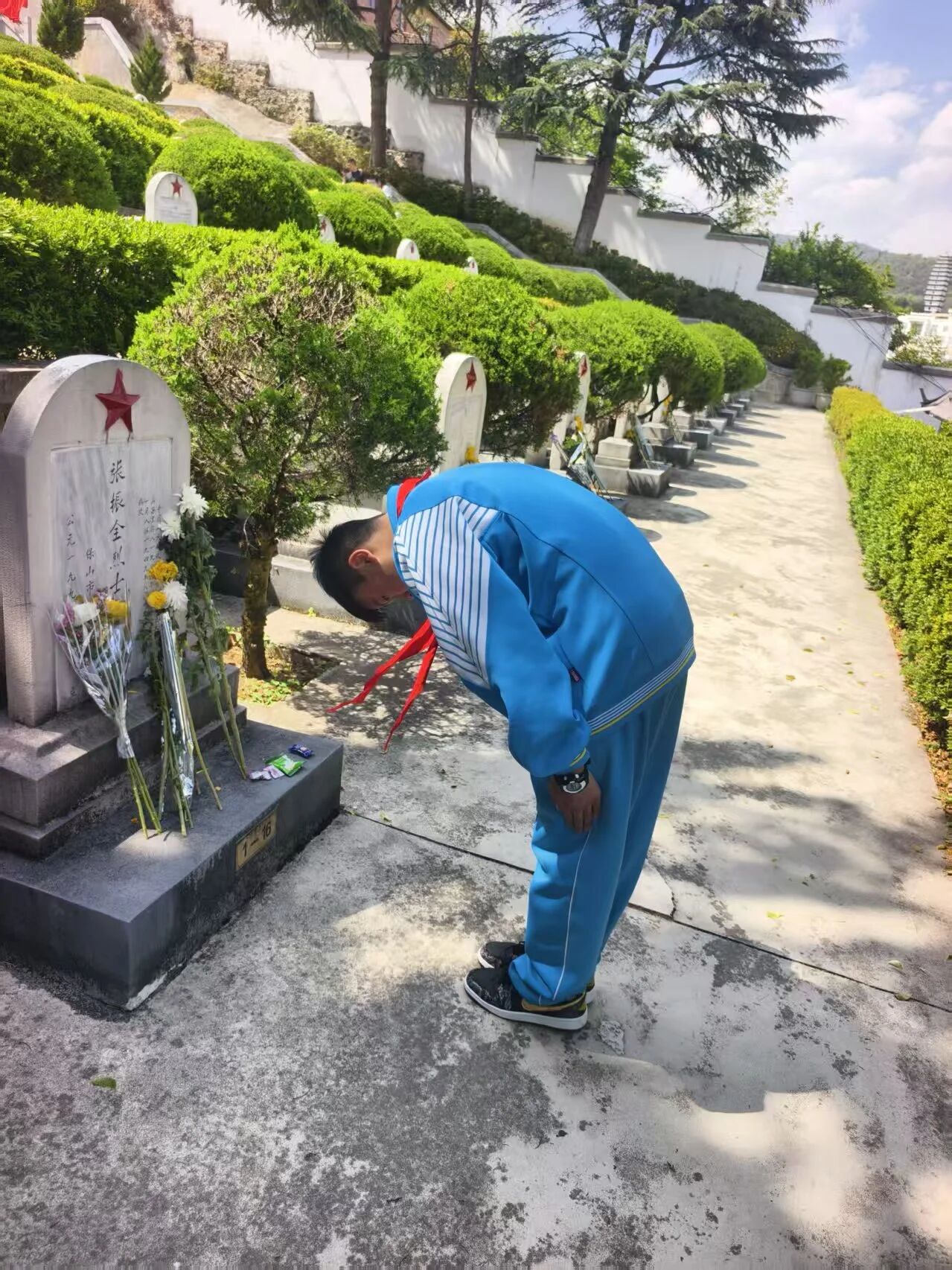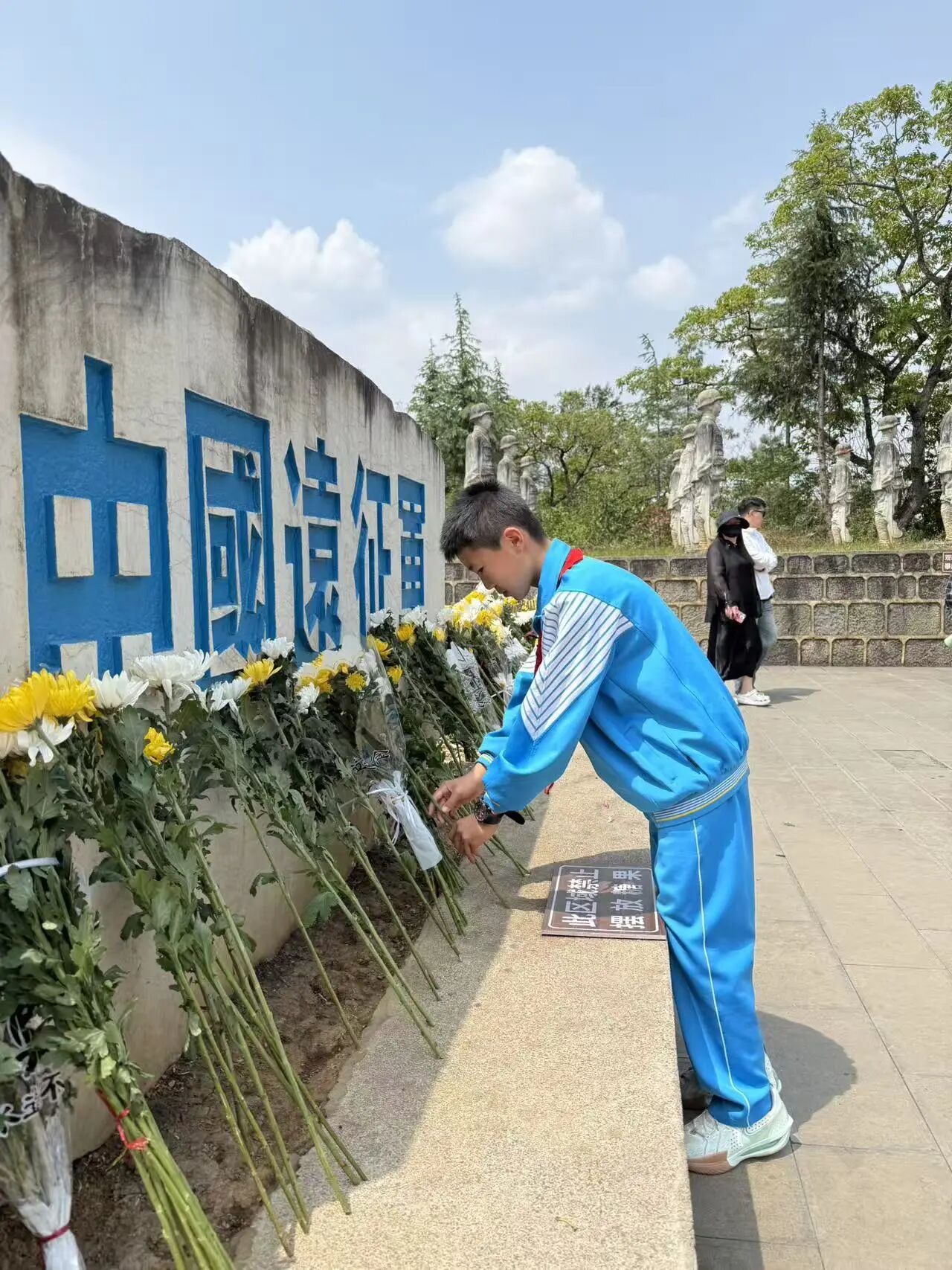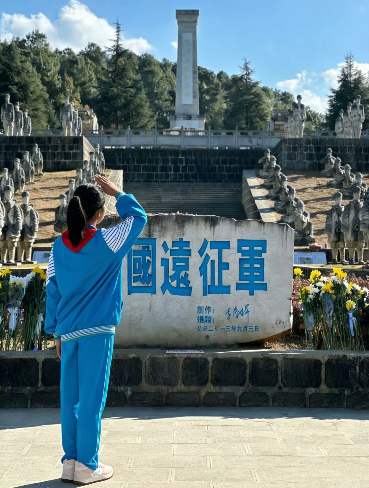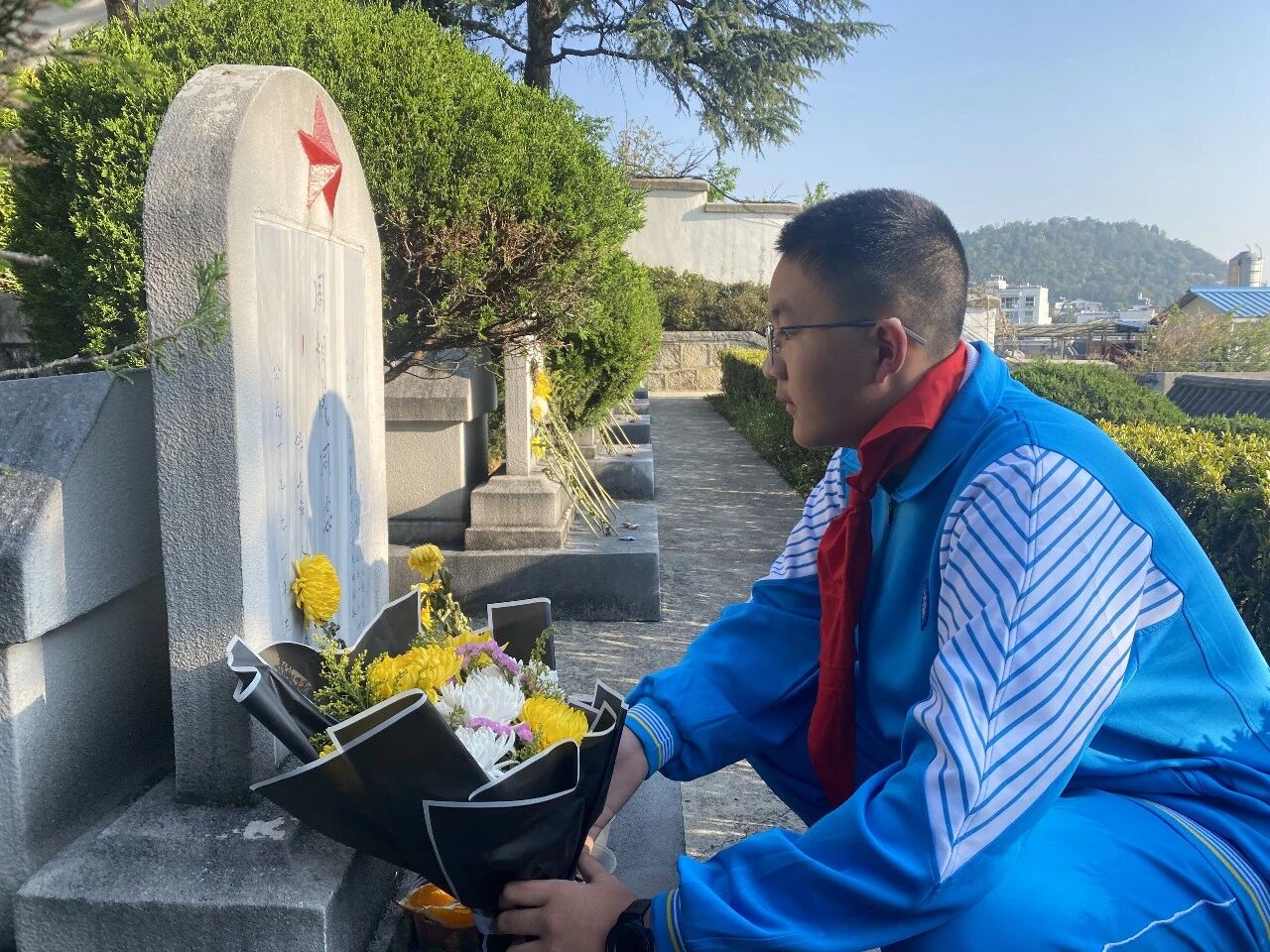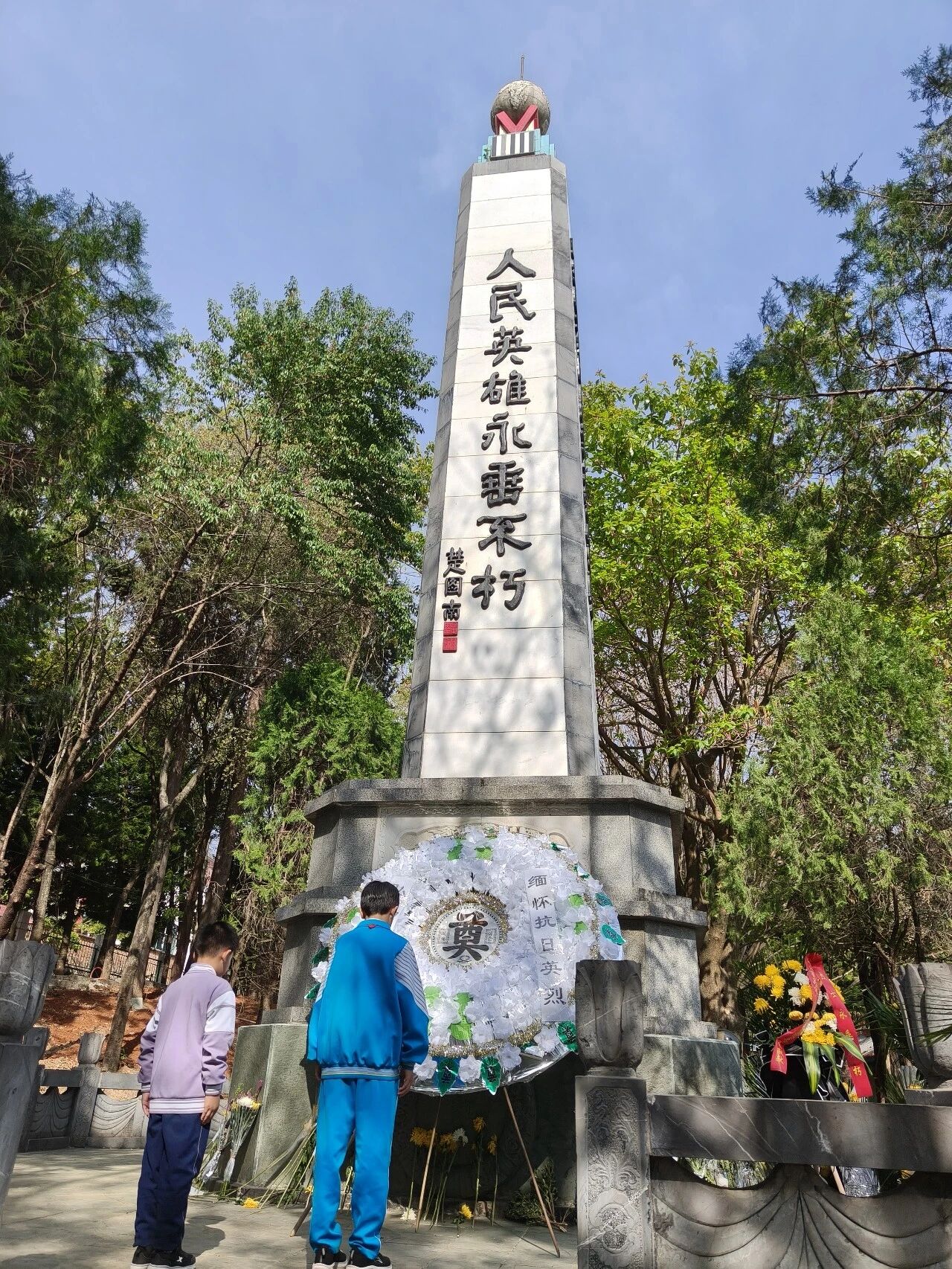 肃立默哀,一分钟的静默承载着无尽的敬意;敬献菊花或亲手制作的小白花,绿色文明祭扫传递着真挚的缅怀。队员们认真聆听讲解,学习滇西抗战的悲壮历史,在纪念碑前三鞠躬、行队礼,瞻仰纪念设施时安静肃穆,展现出“天南学府”学子良好的精神风貌。
