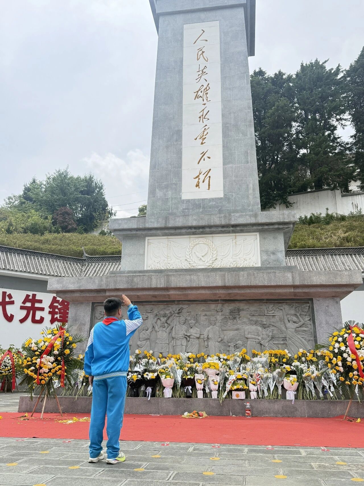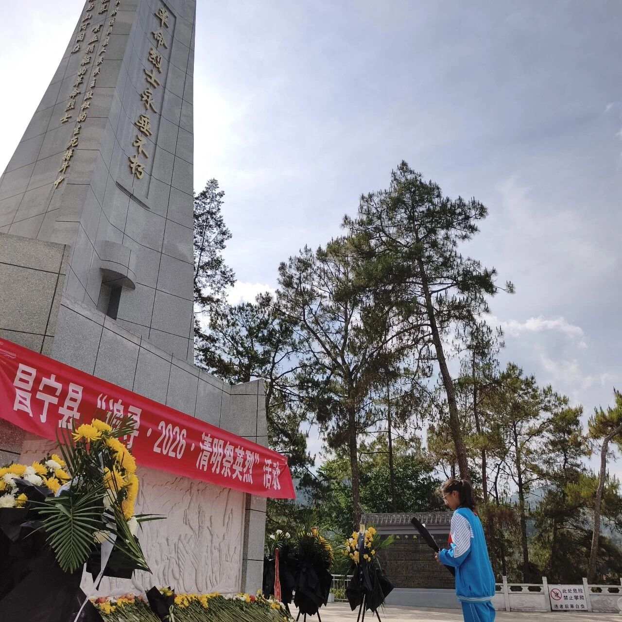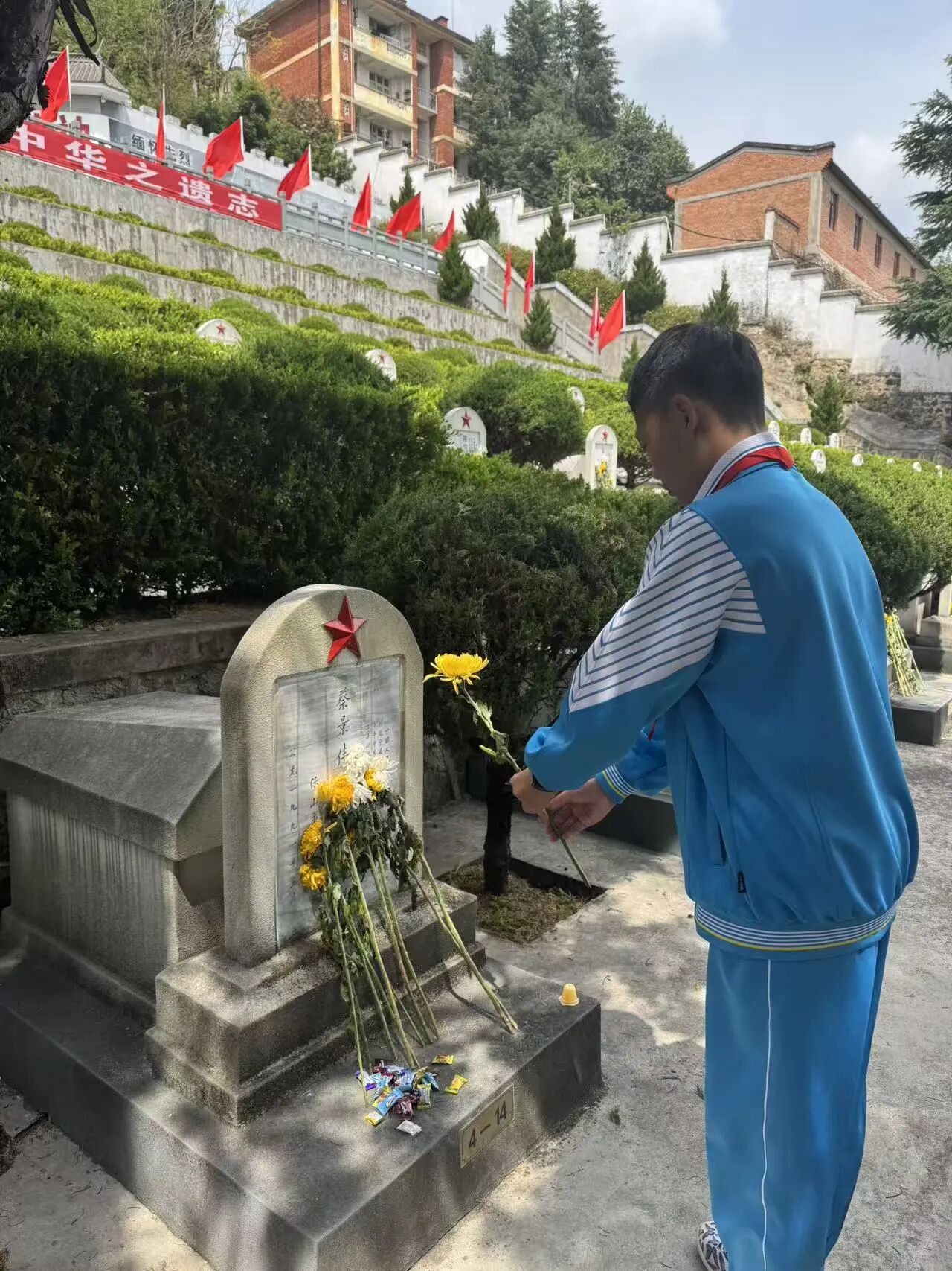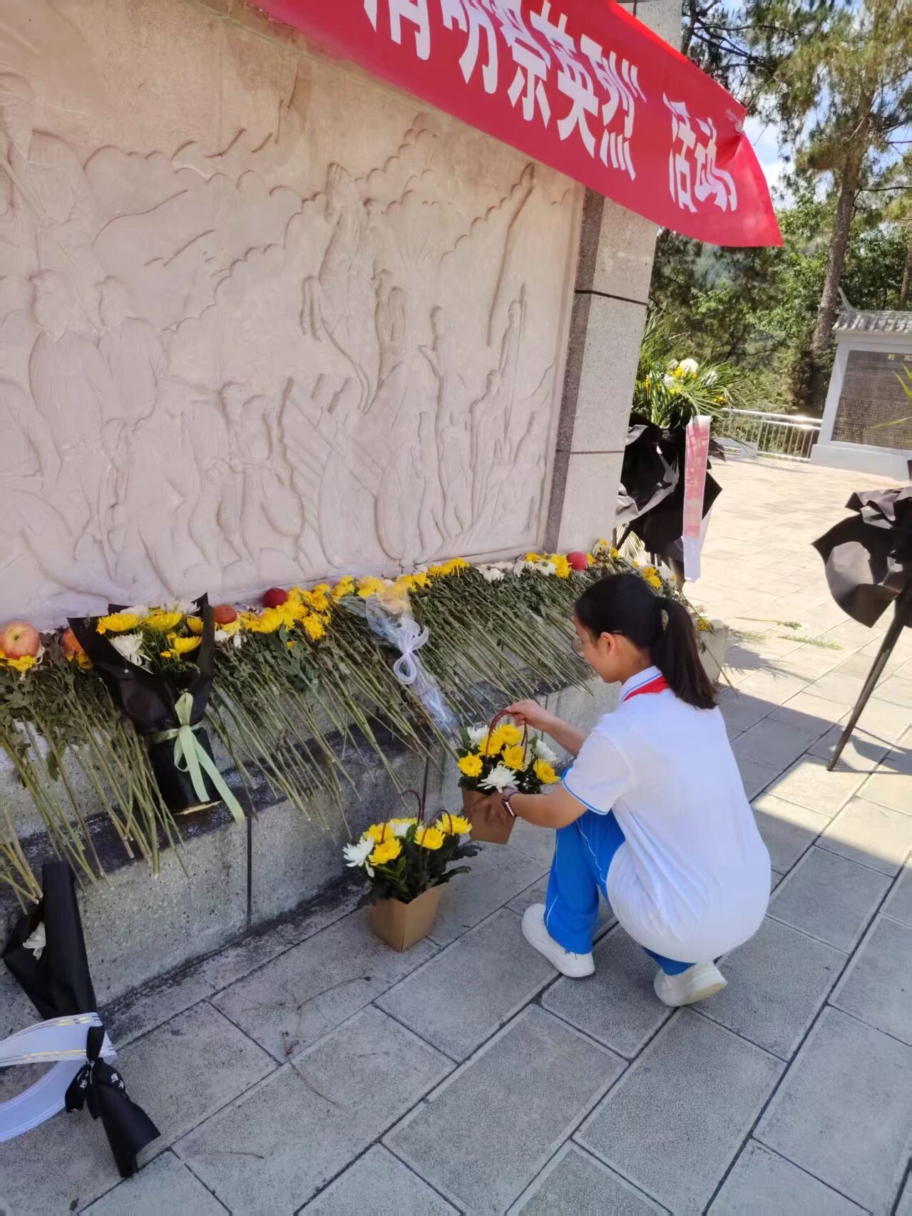 肃立默哀,一分钟的静默承载着无尽的敬意;敬献菊花或亲手制作的小白花,绿色文明祭扫传递着真挚的缅怀。队员们认真聆听讲解,学习滇西抗战的悲壮历史,在纪念碑前三鞠躬、行队礼,瞻仰纪念设施时安静肃穆,展现出“天南学府”学子良好的精神风貌。