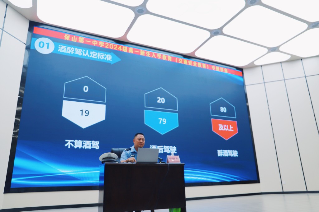 交通安全,重于泰山!为了让同学们对交通安全有更深刻的认识,引导新生们树立正确的交通安全观,增强自我保护意识,在今后的生活中严守交通规则,把交通安全知识牢记心中,为其高中生活开启安全、健康、有序的新篇章,共同营造一个安全和谐的校园环境和社会环境,学校邀请保山市公安局交警支队直属二大队队长李健杰给同学们做交通安全教育专题讲座。