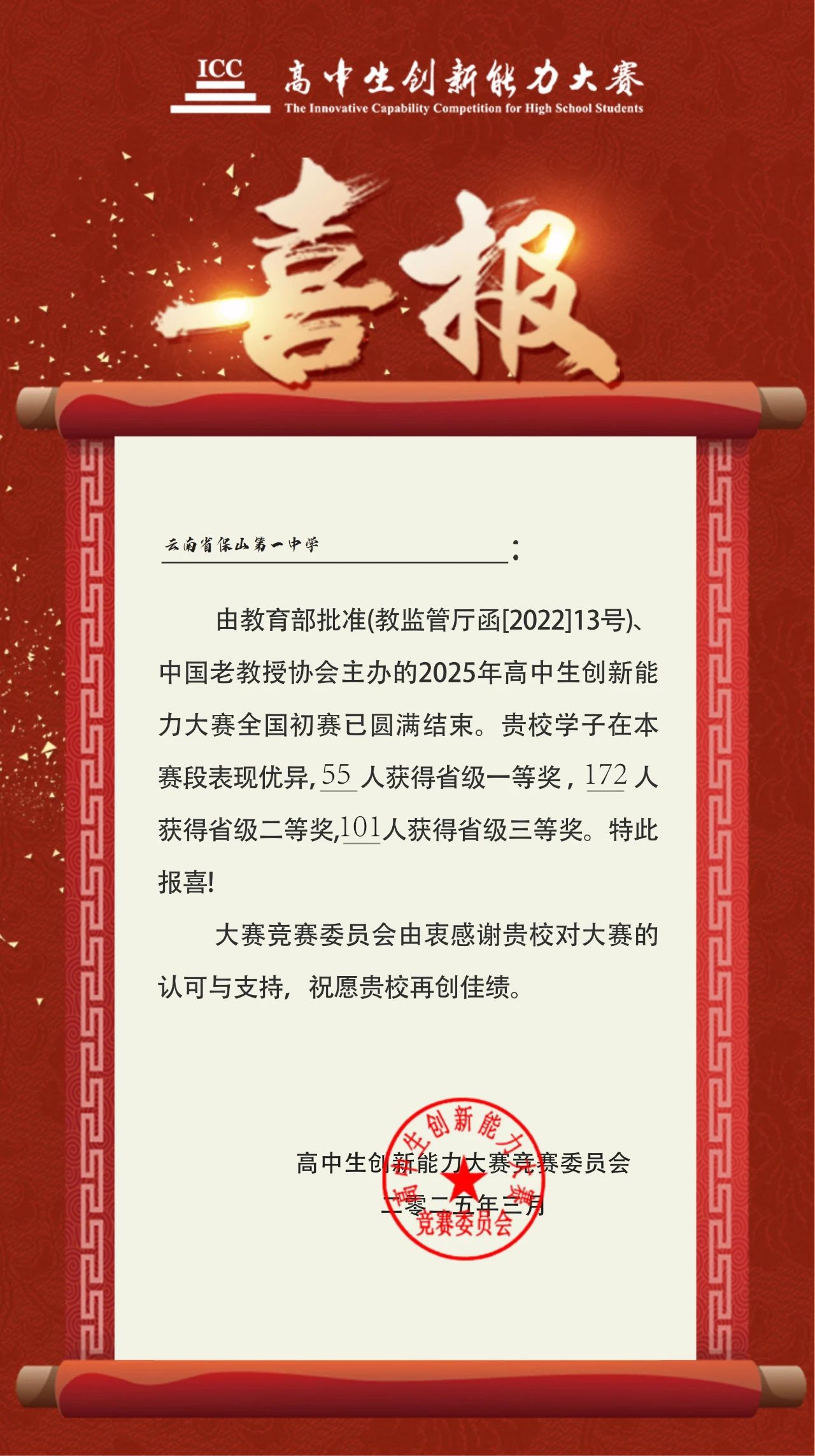 在刚刚结束的2025年高中生创新能力大赛全国初赛中,保山一中学子凭借扎实的知识基础和卓越的创新思维,一路过关斩将,取得了令人瞩目的优异成绩!在此,我们向全校师生、家长以及一直关心支持我校发展的各界人士报喜!
