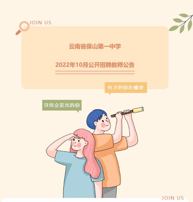根据《中共保山市委组织部 保山市人力资源和社会保障局保山市公安局转发<中共云南省委组织部 云南省人力资源和社会保障厅 云南省公安厅关于印发云南省事业单位公开招聘工作人员办法>的通知》(保人社联〔2016〕24号)、《中共保山市委组织部 中共保山市委机构编制委员会办公室 保山市人力资源和社会保障局关于进一步规范我市事业单位到校园公开招聘工作人员有关事项的通知》(保人社联〔2020〕18号)和《保山市教育体育局等五部门关于印发保山第一中学引进优秀教师实施方案的通知》(保教体发〔2021〕124号)等文件精神,经保山市教育体育局、保山市人力资源和社会保障局批准,现将云南省保山第一中学2022年10月公开招聘教师有关事宜公告如下: