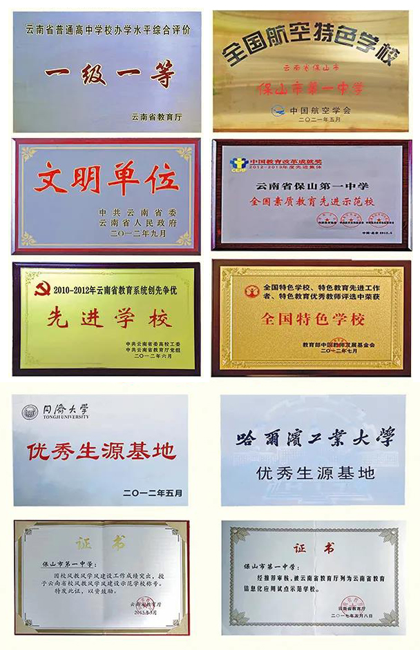 先后荣获全国素质教育先进示范学校、全国和谐校园先进学校、全国特色学校、全国消防安全教育示范学校、全国航空特色学校、全国中学生科普科幻作文大赛优秀生源基地、省文明单位、省文明学校、省校风教风学风建设示范学校、省绿色学校、省德育工作先进集体、省教育科研实验学校、省军训先进单位、云南省教育系统先进基层党组织等荣誉称号。