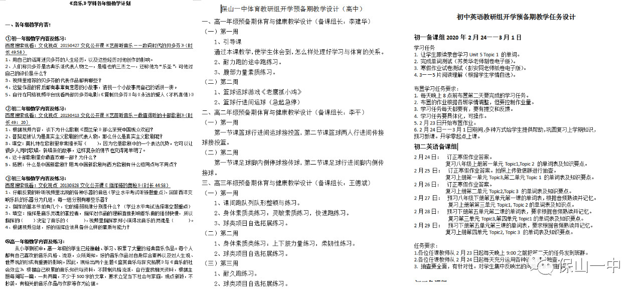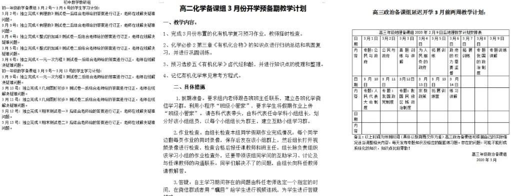 2月13日,教科处要求由各学科备课组长联络组内成员制定教学任务并上传给教研组长审核后实施,到目前为止各组已经设计并上传了4周的教学计划。这一工作得到了全体教师尤其是教研组长、备课组长的大力支持,各学科小组的教学设计都能够结合年级实际,做到非毕业年级以完成好假期作业和知识点的查缺补漏为主,毕业年级以积极引导学生自学复习、答疑解惑为主,力求育人为主、学科为辅,尊重规律、以人为本。
