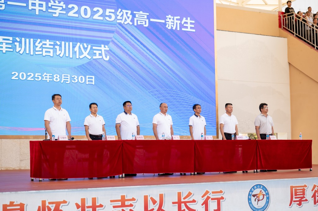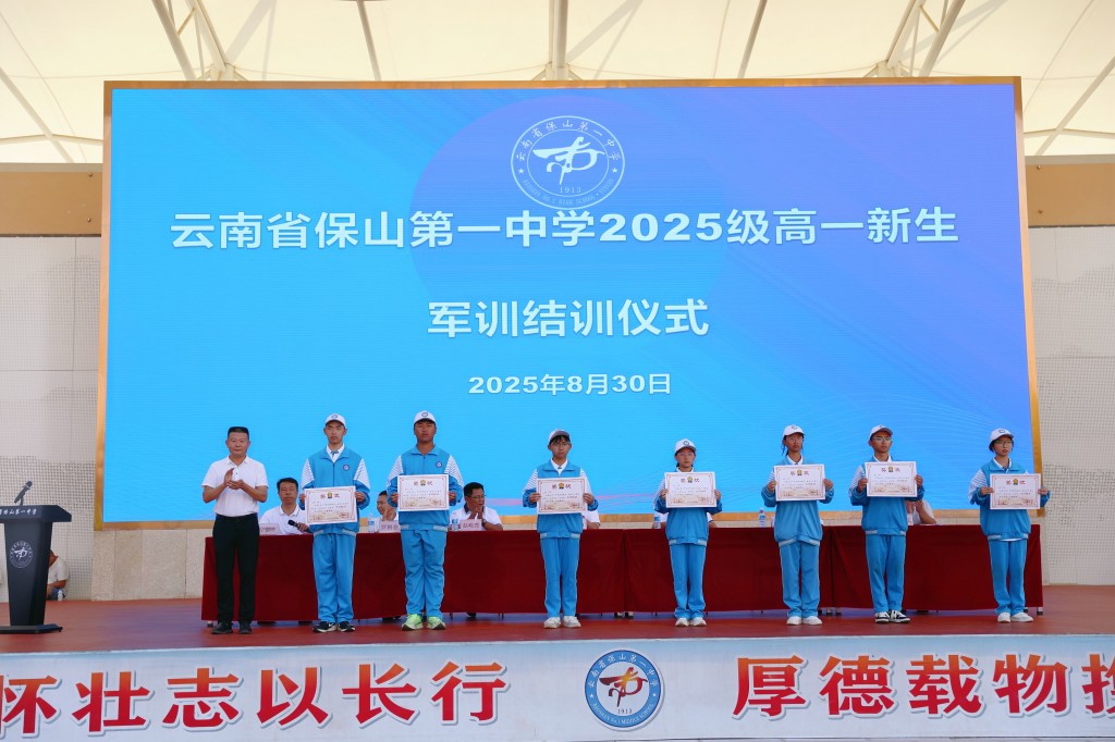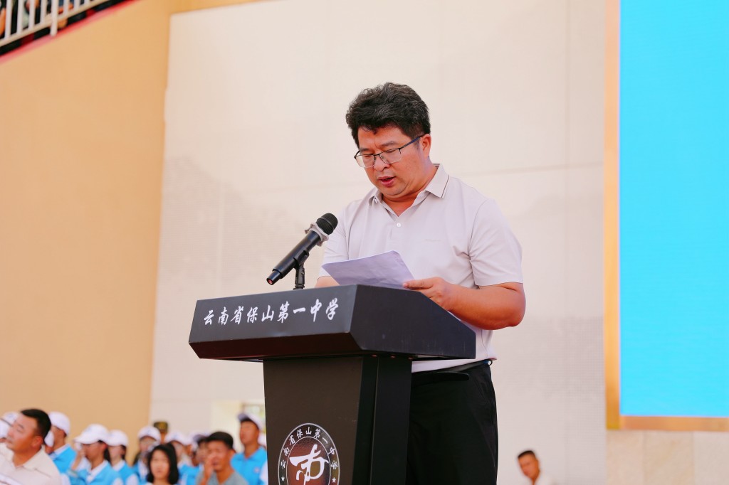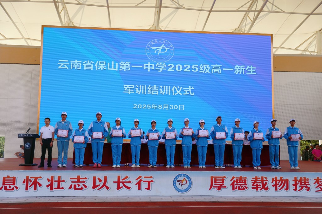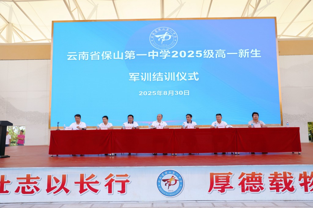 15时30分,保山一中2025级新生结训典礼开始,付飞校长等校领导在主席台就座,典礼由德育安全处主任宁德坤主持。