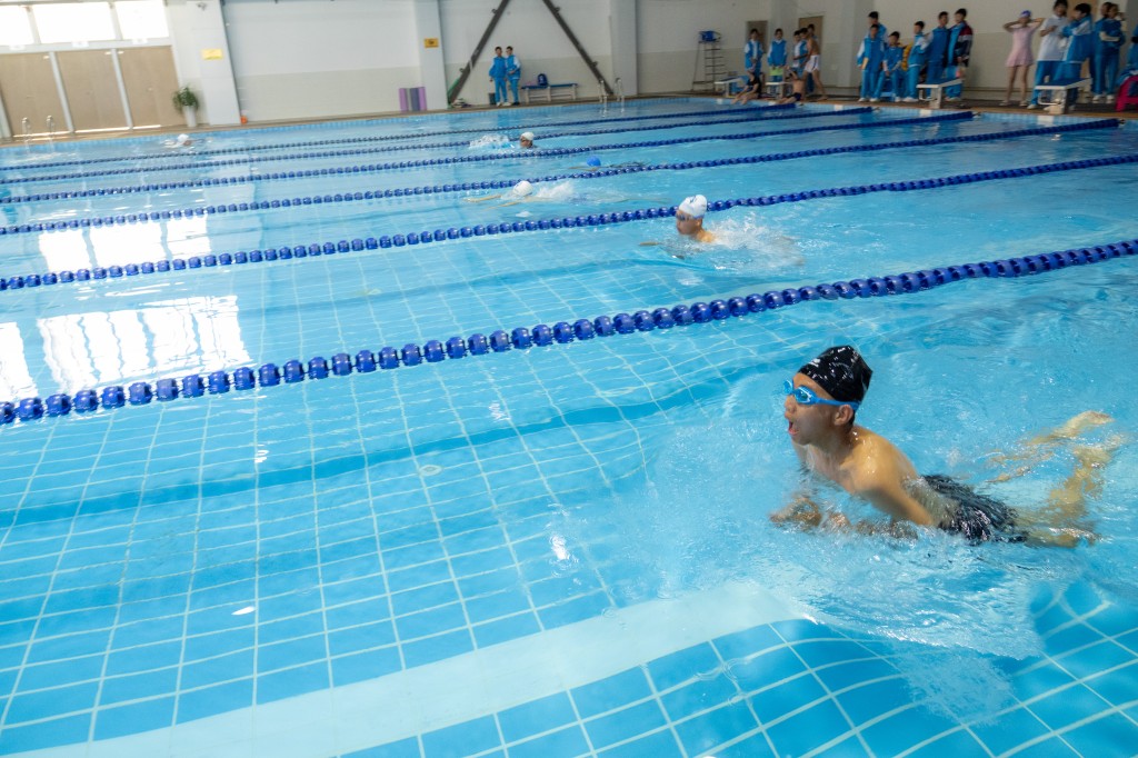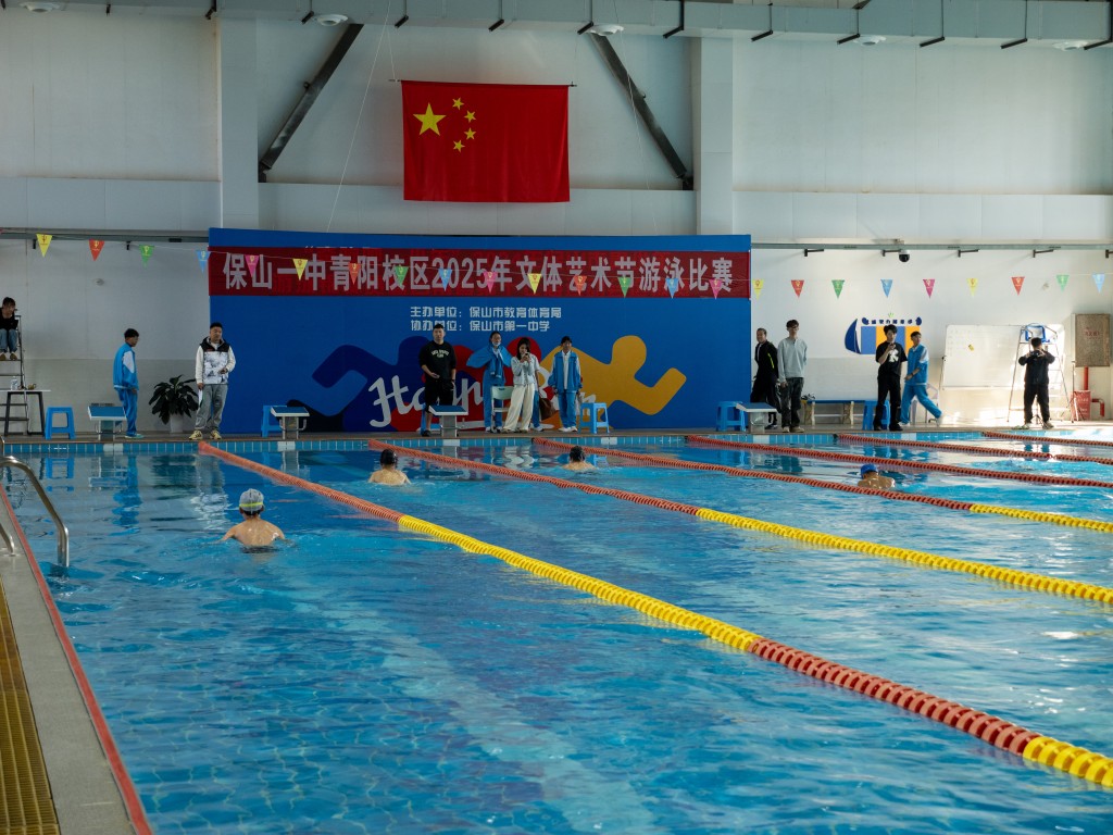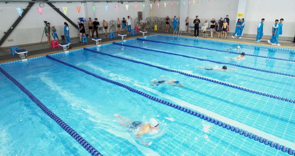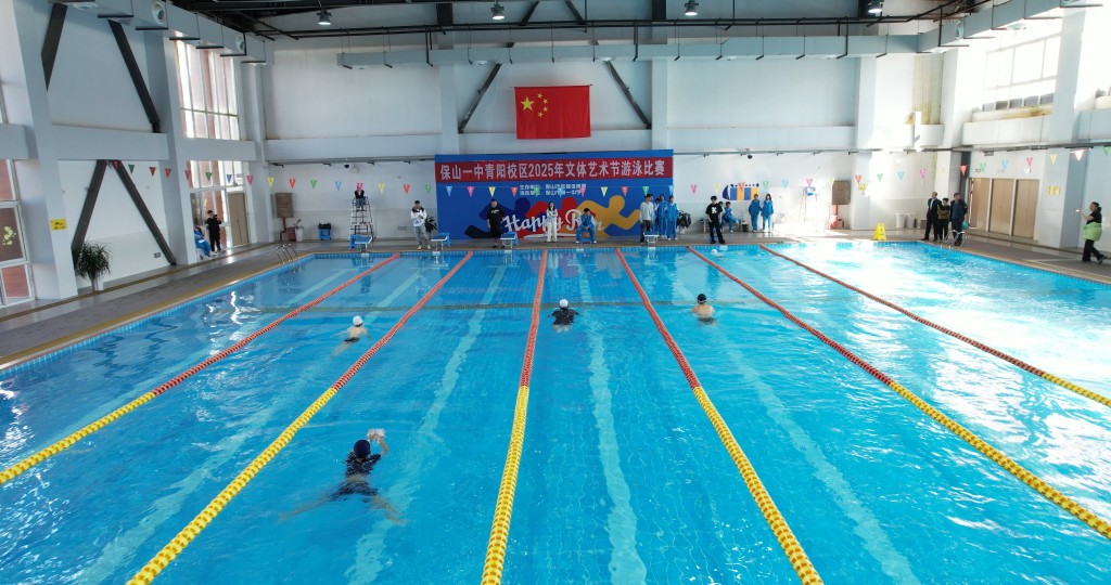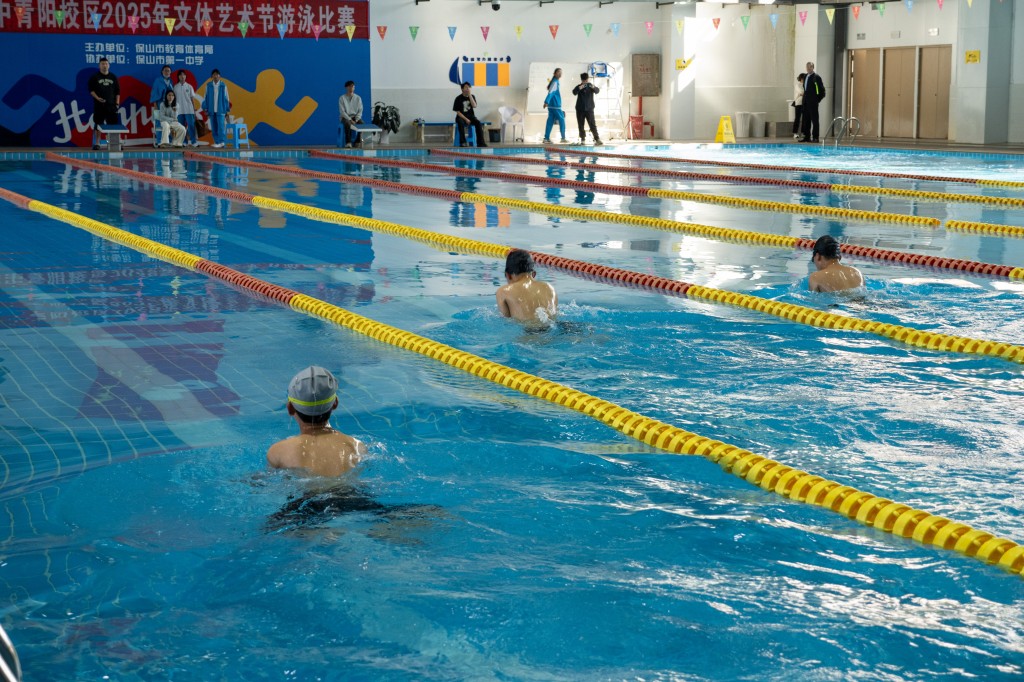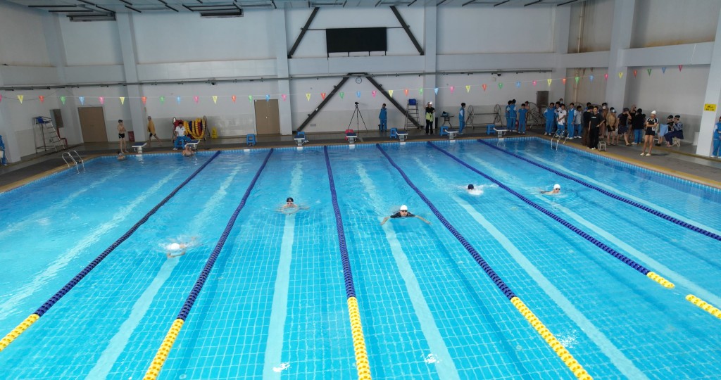 泳池之内,另有一番热血赛场。澄澈的池水泛起粼粼波光,与少年们跃动的身影相映成趣。发令哨声划破水面的宁静,参赛学子如游龙入水,双臂划开碧波,双腿蹬出浪花,在泳池中展开速度与耐力的较量。