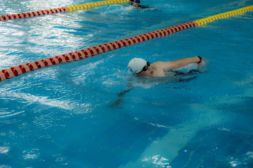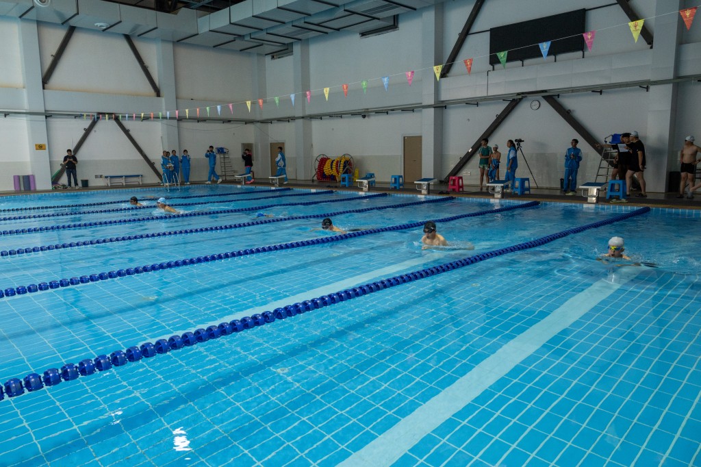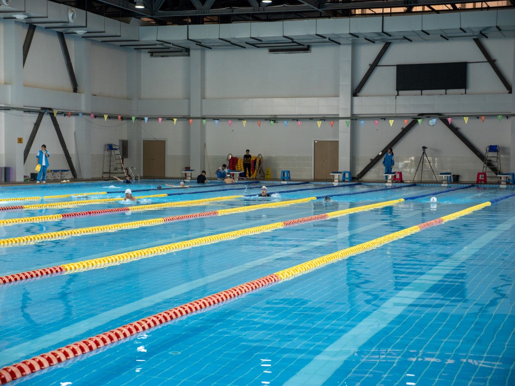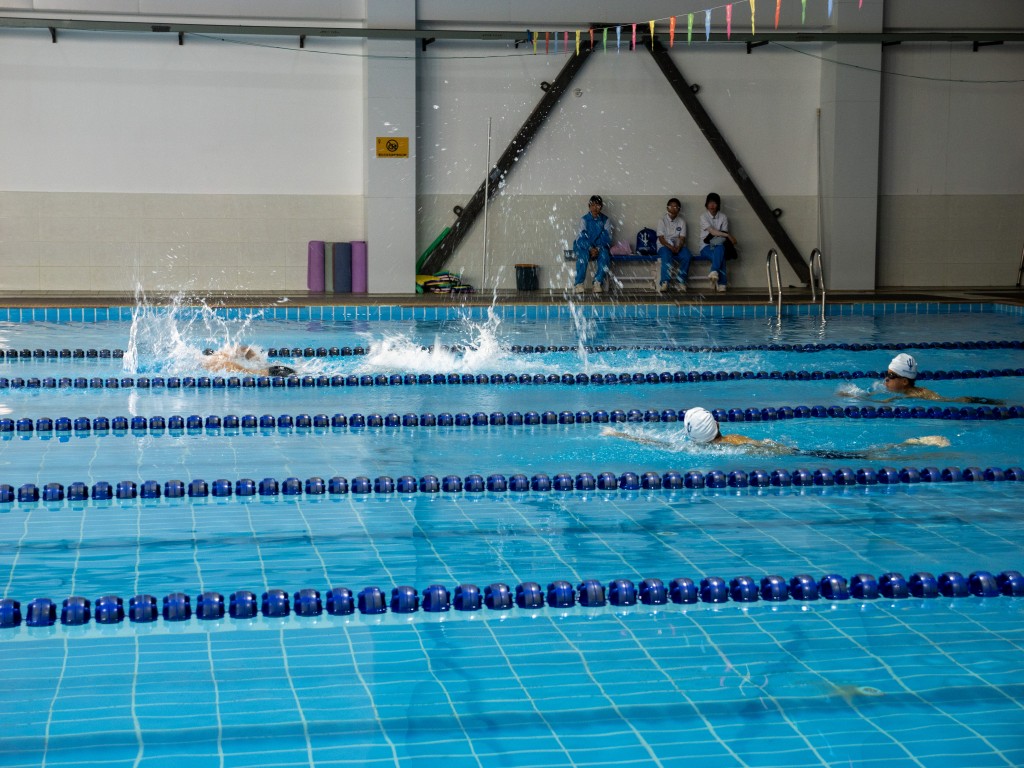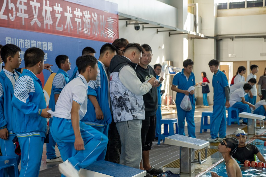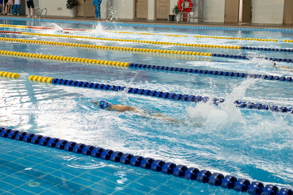 泳池之内,另有一番热血赛场。澄澈的池水泛起粼粼波光,与少年们跃动的身影相映成趣。发令哨声划破水面的宁静,参赛学子如游龙入水,双臂划开碧波,双腿蹬出浪花,在泳池中展开速度与耐力的较量。