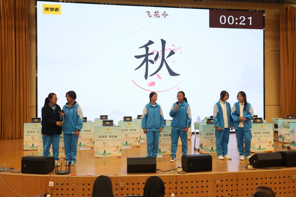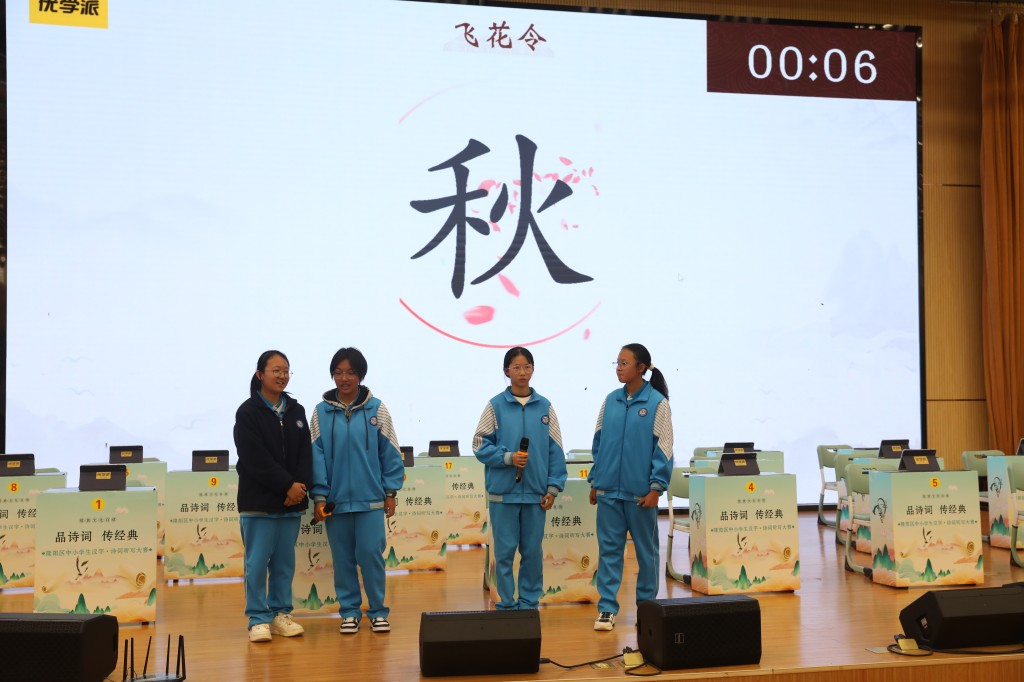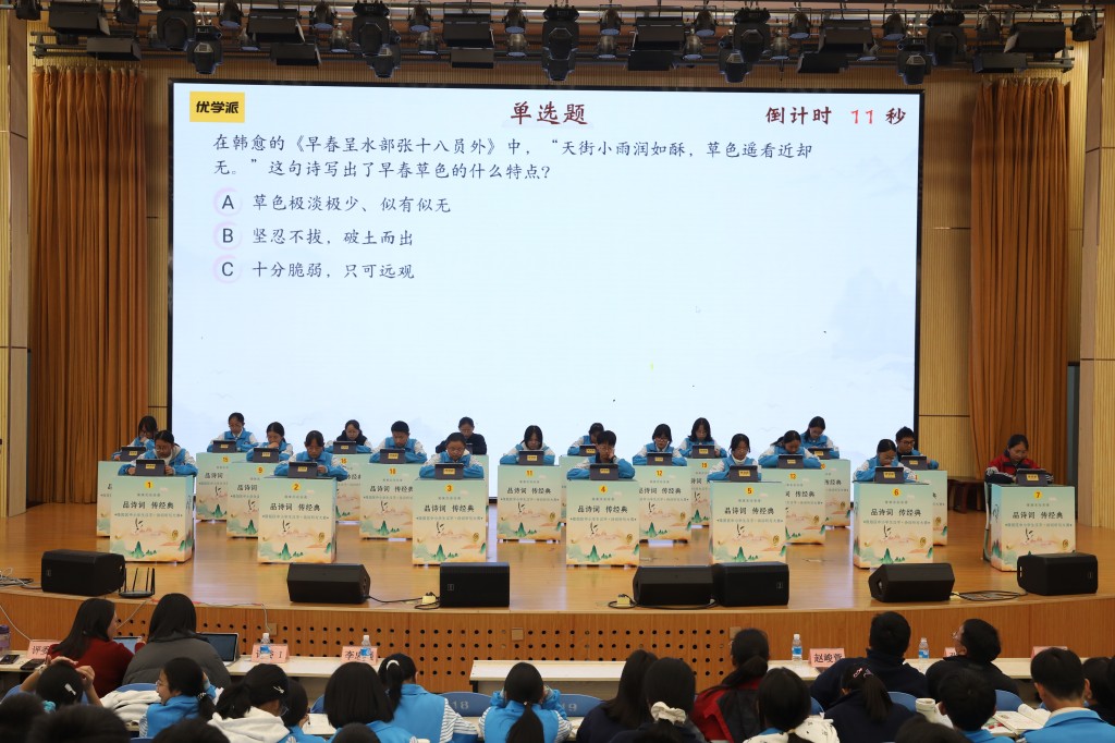 本次擂台赛以“弘扬经典,浸润书香”为核心,题目涵盖初中课内必背古诗词及课外积累篇目,设置诗词接龙、点字成诗、飞花令等七大题型,通过晋级赛与决赛两大阶段层层筛选,全方位考验选手的诗词积累与临场应变能力。中国汉字听写大会技术支持方、优学派公司提供的专业设备与题库,更让比赛兼具专业性与趣味性。