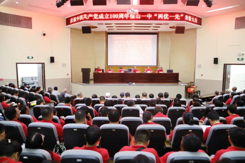 为庆祝中国共产党成立100周年,回顾党的百年历程,讴歌党的丰功伟绩,教育引导广大党员不忘初心、牢记使命、继续奋斗,展示广大党员干部团结、奉献、奋进的时代风貌。2021年6月29日,保山一中党委召开庆祝中国共产党成立100周年“两优一先”表彰大会,对涌现出来的优秀共产党员、优秀党务工作者、先进基层党支部和在党50周年党员进行表彰,让广大以党员以他们为楷模,提升党员带头模范作用,凝聚力量,扎实工作。