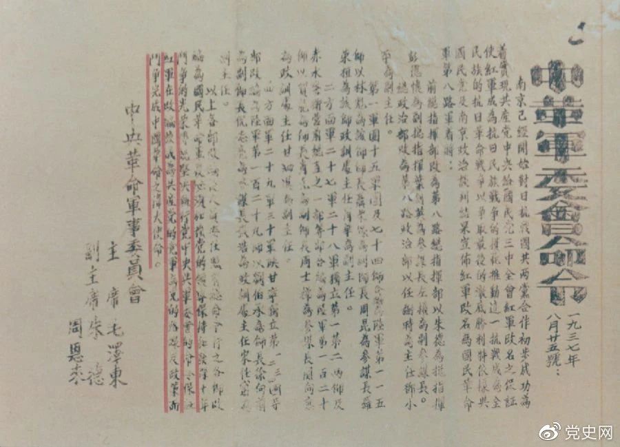 1937年8月25日,毛泽东和朱德、周恩来发出的关于红军改编为国民革命军第八路军的命令。 图片来源:中央党史和文献研究院