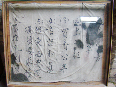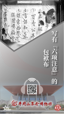 在井冈山革命博物馆里,珍藏着一块井冈山革命斗争时期红军战士使用过的一块包袱布。历经数十载岁月洗礼,深色的包袱布早已泛白,但上面的毛笔字迹却仍然遒劲有力,这是当年红军战士们根据记忆写下的“六项注意”: