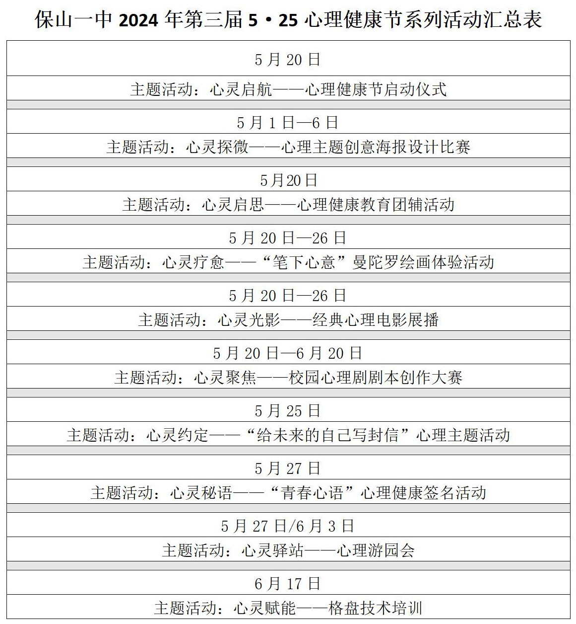 心理健康节是保山一中近两年来创建的一个品牌活动,在为期一个月的时间里,通过举办一系列丰富多彩的活动,让学生们在轻松愉快的氛围中了解心理健康知识,关注自我的成长和提升,增进彼此的交流与互动,以此推动我校心理健康教育的长足发展。