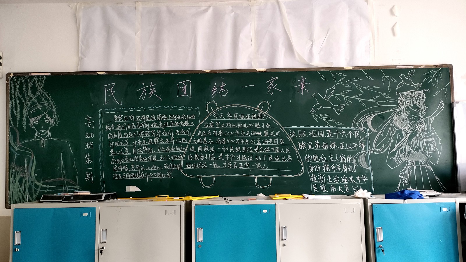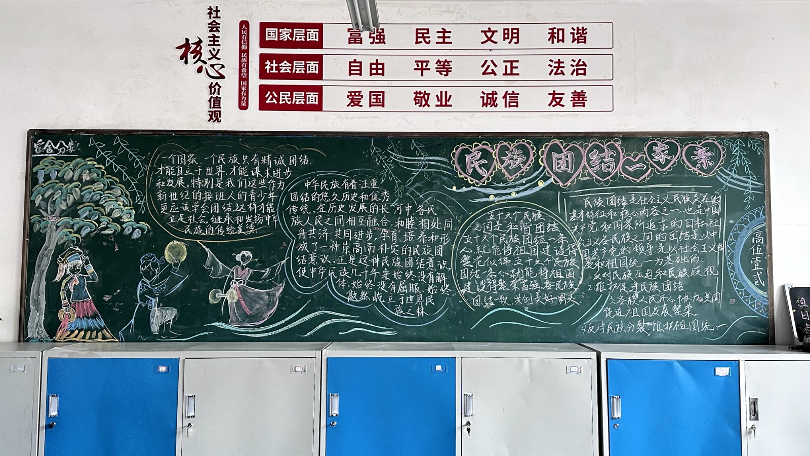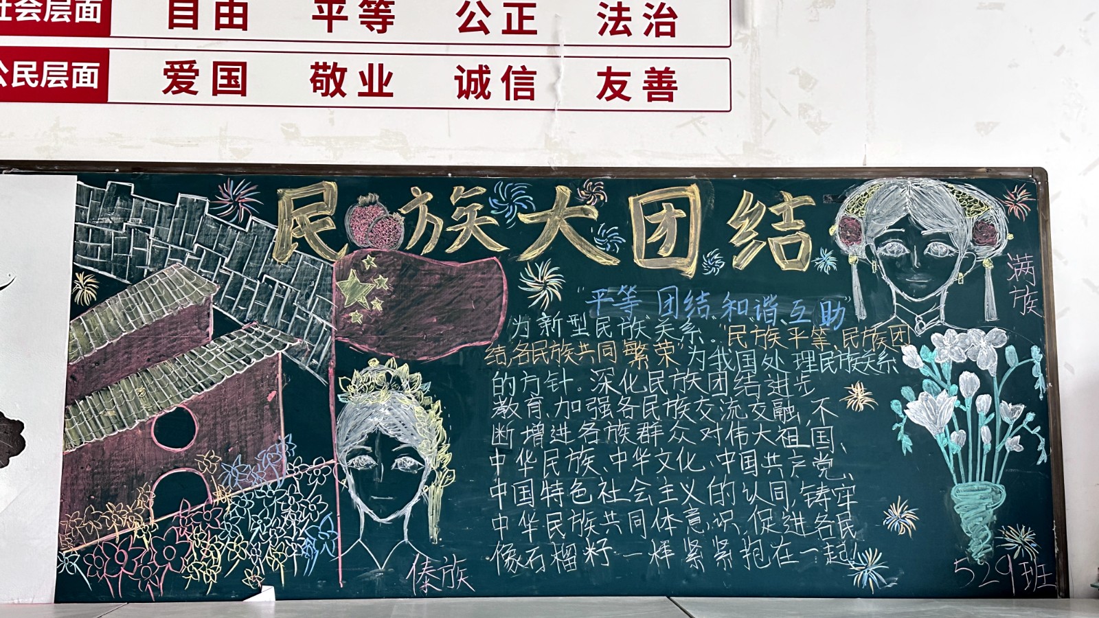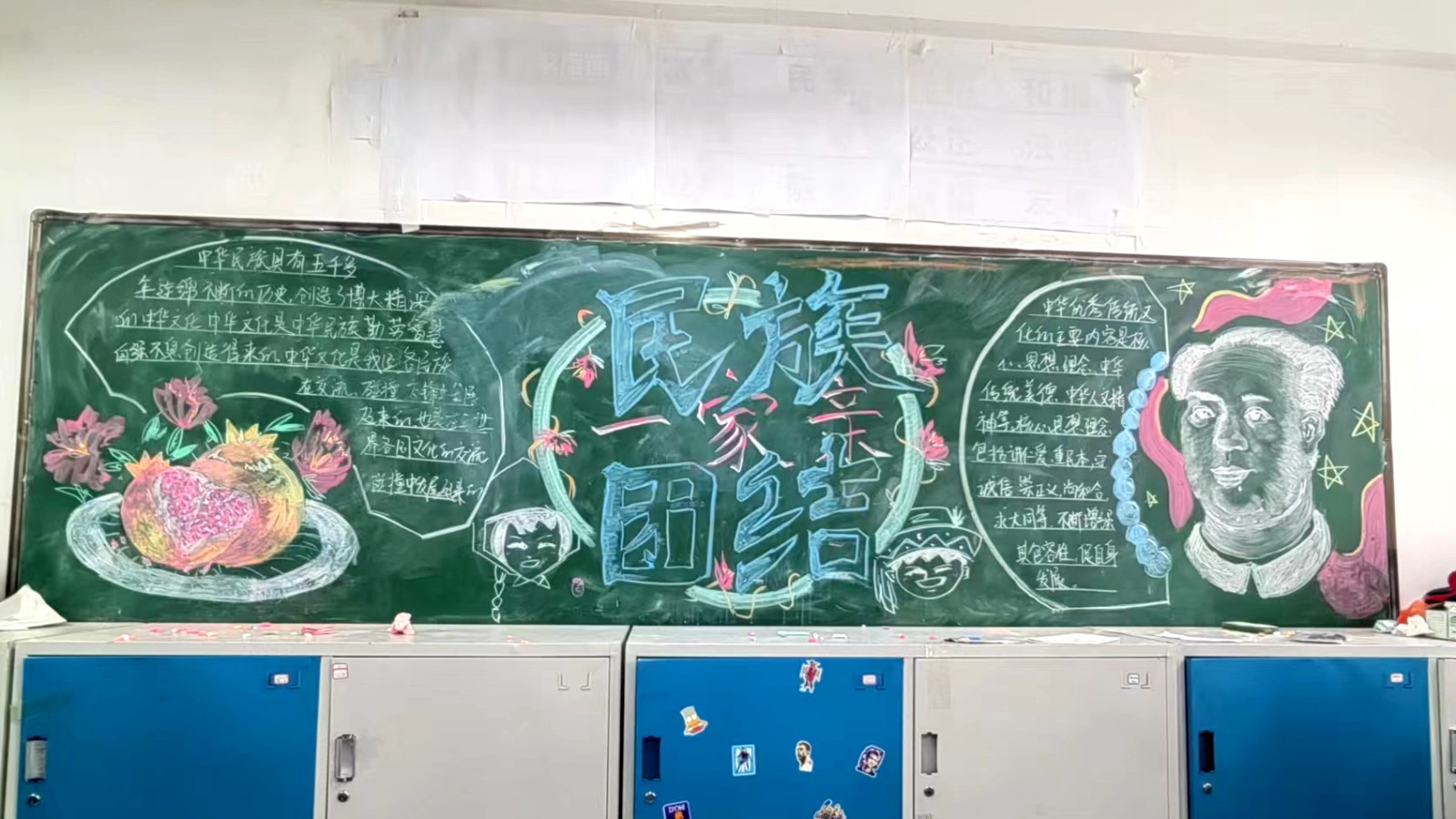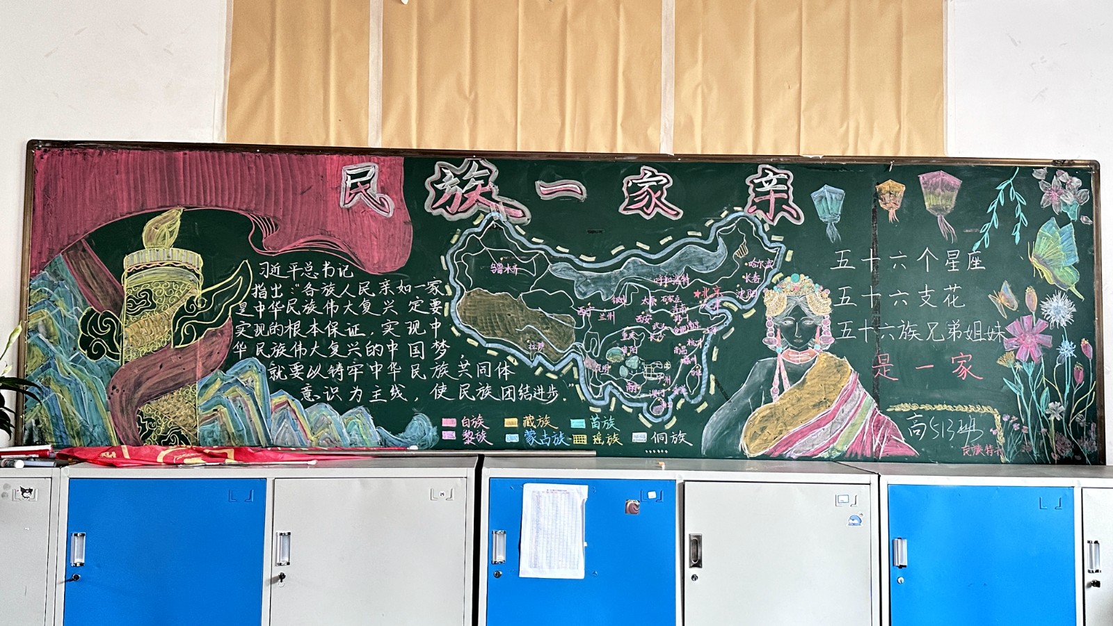 为学习宣传贯彻党的二十大精神,深入学习领会习近平总书记关于加强和改进民族工作的重要思想,通过扎实有效的民族团结进步教育,教育引导全校师生切实铸牢中华民族共同体意识,教育引导广大学生践行爱国主义,培育家国情怀,自觉投身于共同团结奋斗、共同繁荣发展的伟大实践,成长为德智体美劳全面发展的社会主义建设者和接班人。保山一中组织高一、高二年级以“民族团结进步教育”为主题开展创意板报设计展示,各个班级积极开展,同学们集思广益,用粉笔绘画和书写民族团结进步发展,用内心表达和传递爱国情怀。