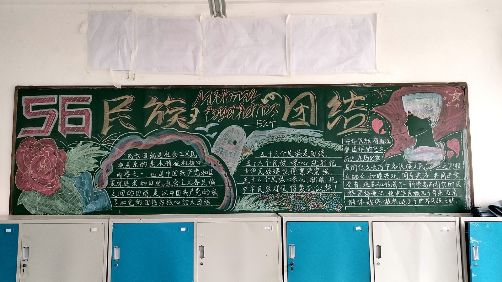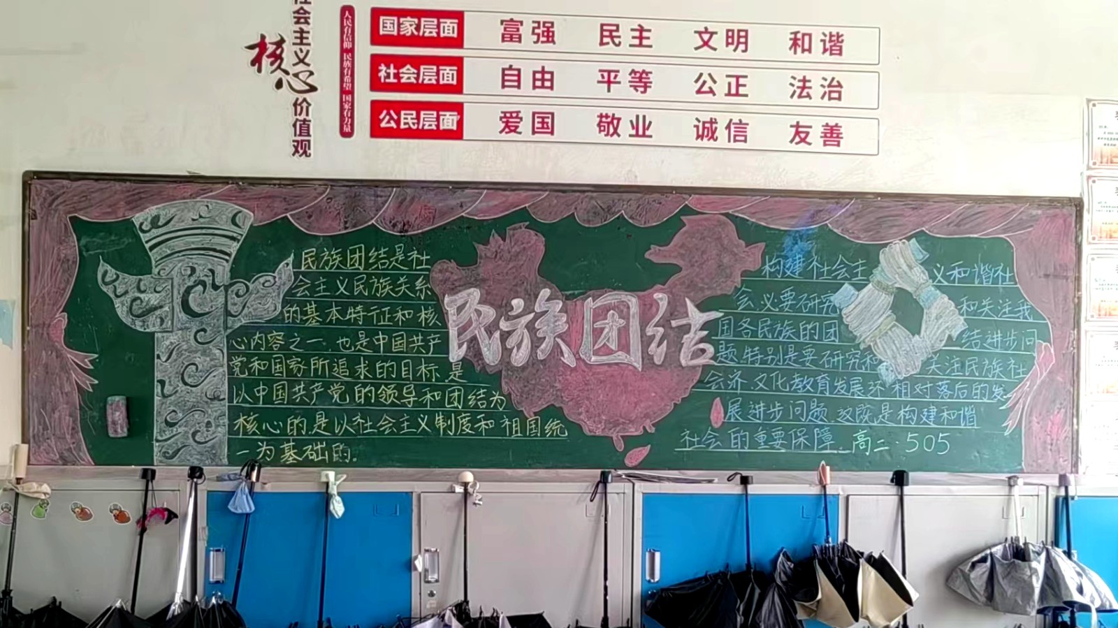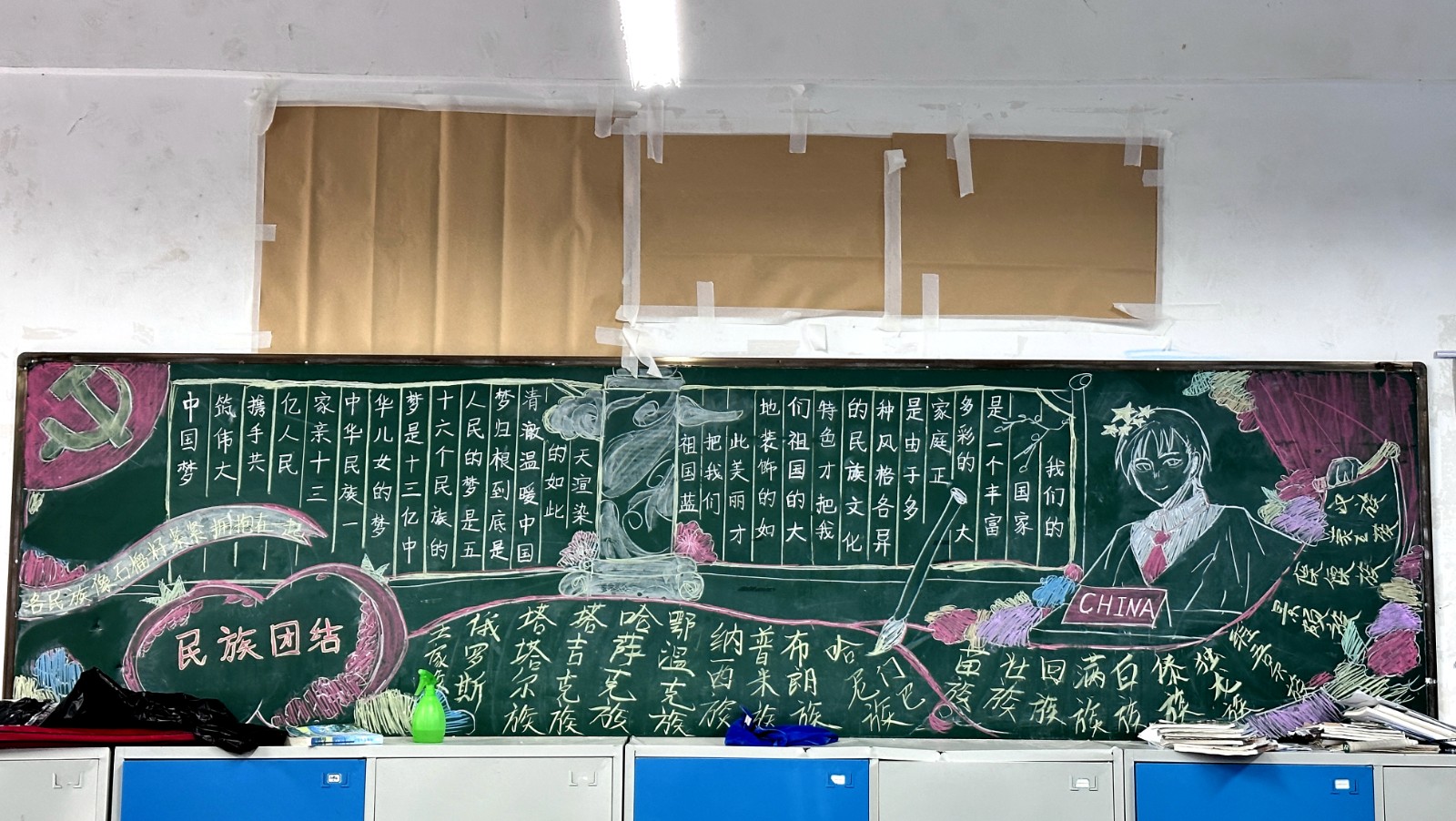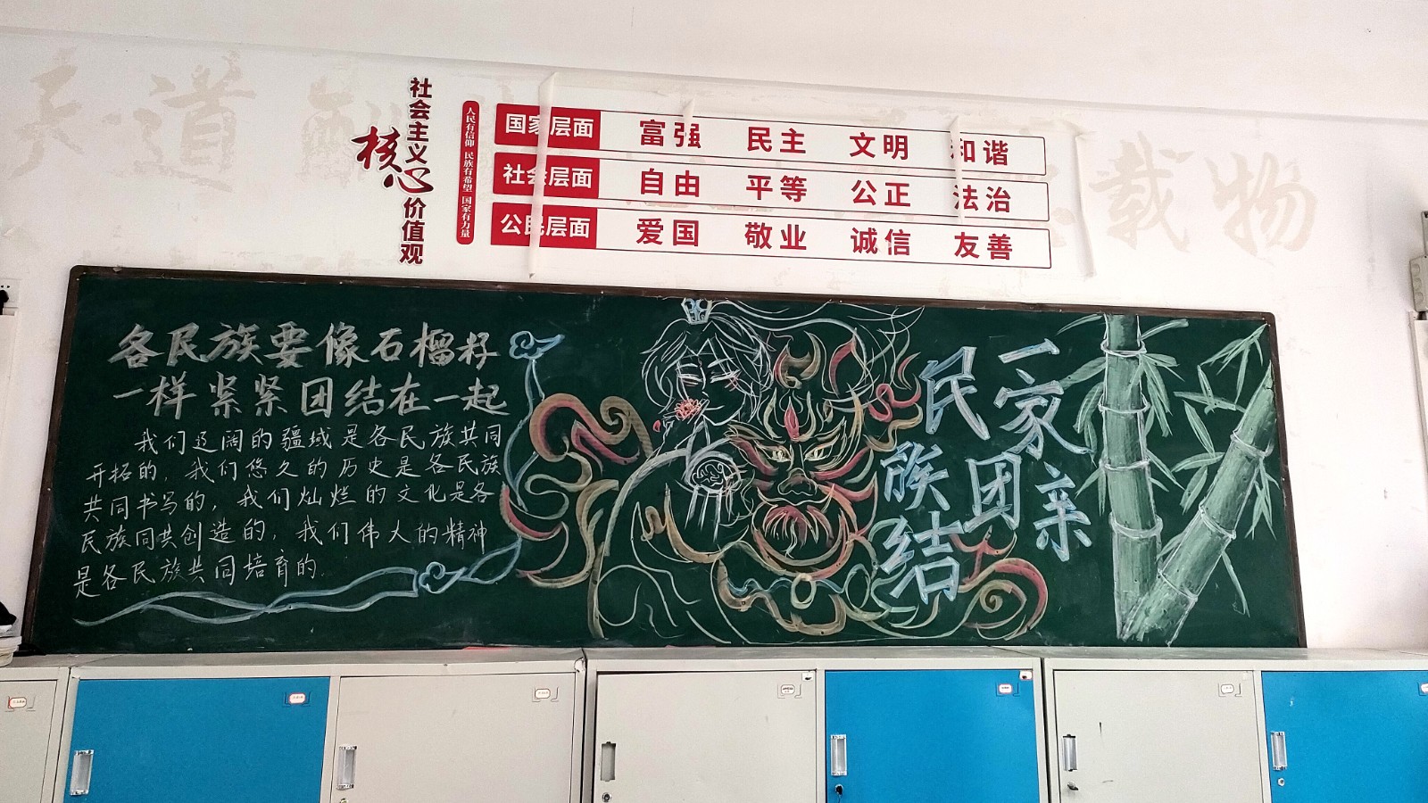 为学习宣传贯彻党的二十大精神,深入学习领会习近平总书记关于加强和改进民族工作的重要思想,通过扎实有效的民族团结进步教育,教育引导全校师生切实铸牢中华民族共同体意识,教育引导广大学生践行爱国主义,培育家国情怀,自觉投身于共同团结奋斗、共同繁荣发展的伟大实践,成长为德智体美劳全面发展的社会主义建设者和接班人。保山一中组织高一、高二年级以“民族团结进步教育”为主题开展创意板报设计展示,各个班级积极开展,同学们集思广益,用粉笔绘画和书写民族团结进步发展,用内心表达和传递爱国情怀。