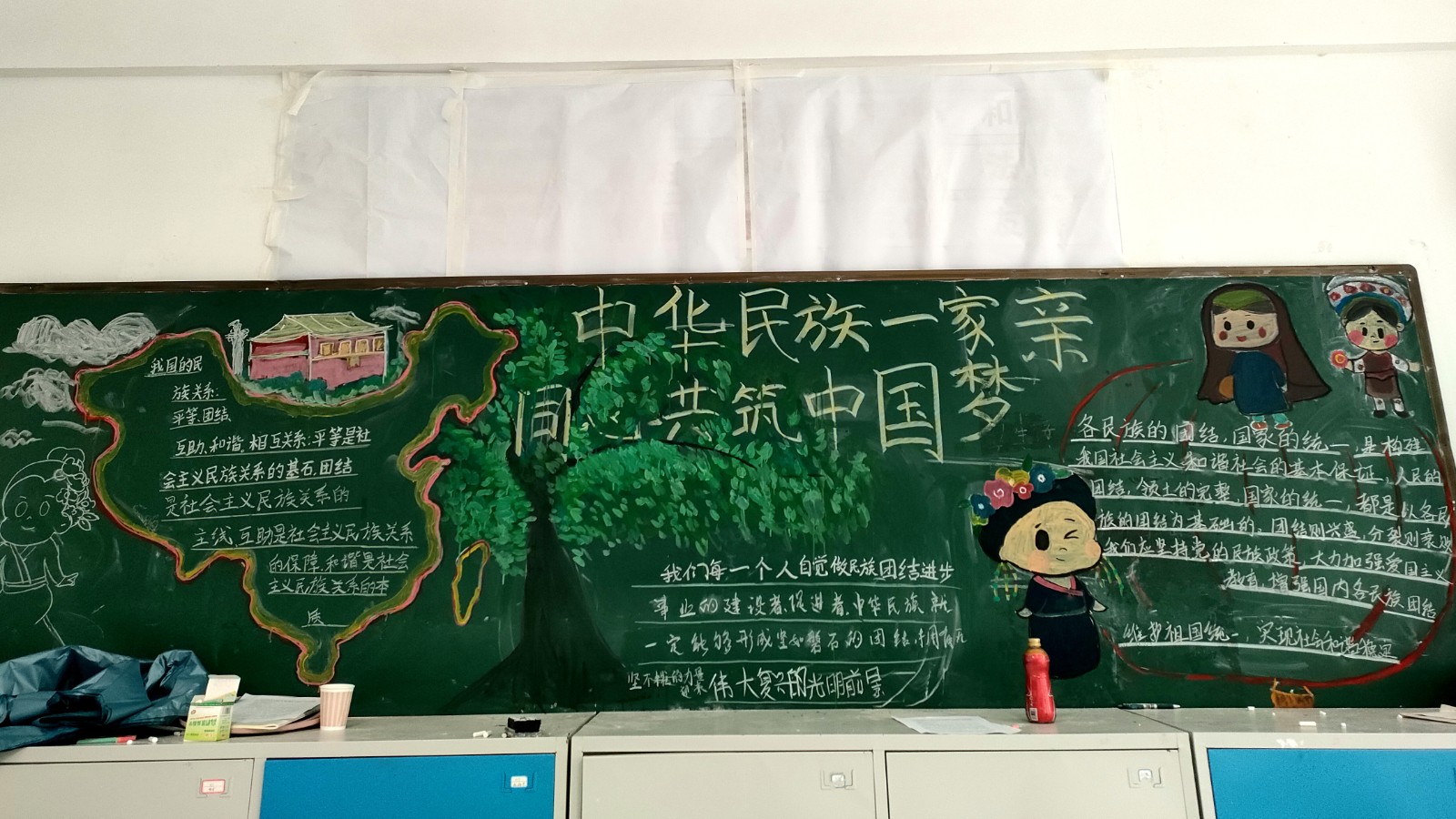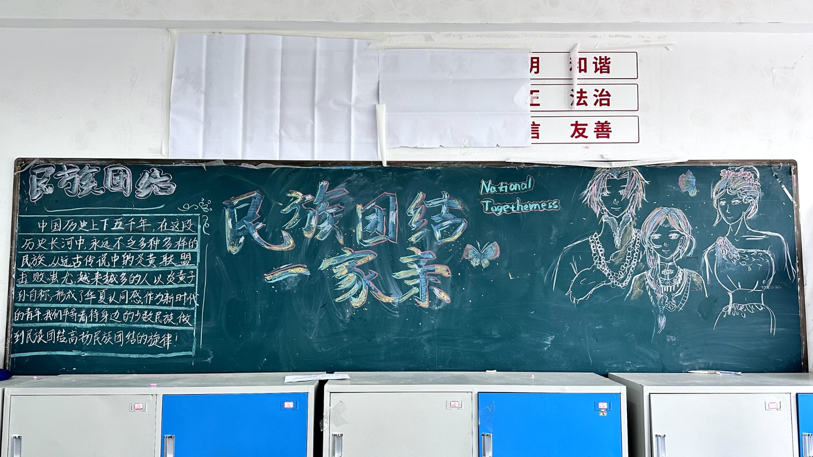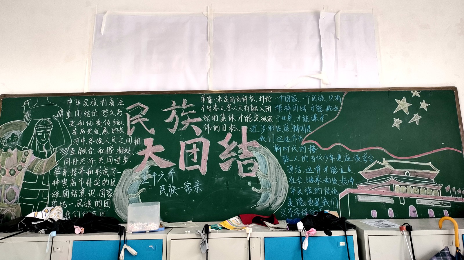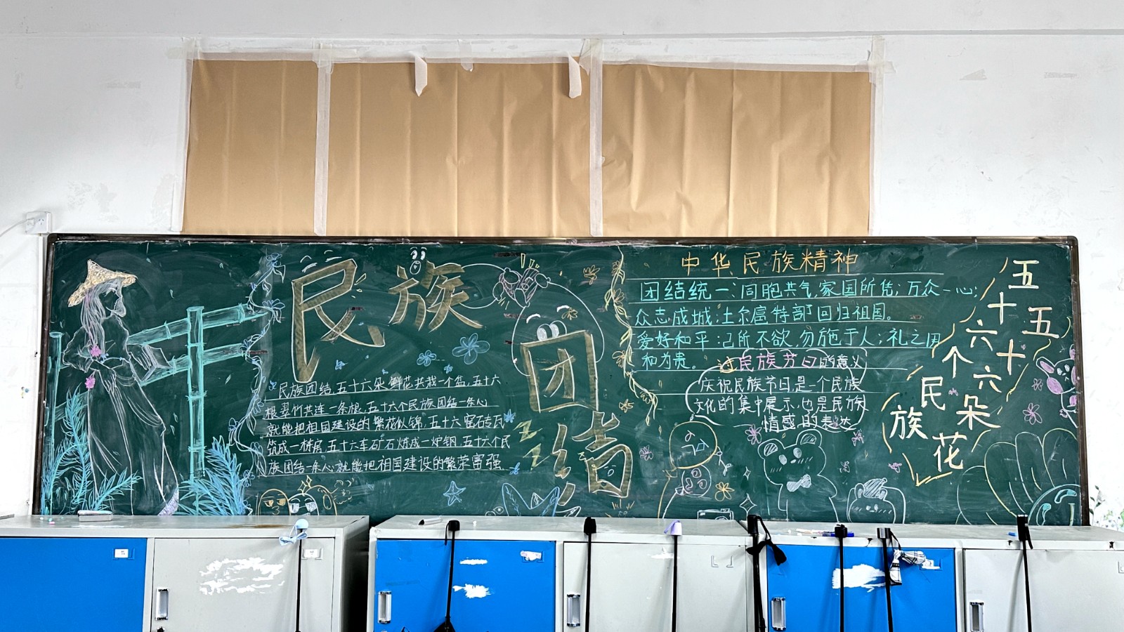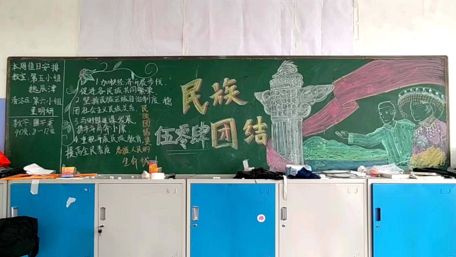 为学习宣传贯彻党的二十大精神,深入学习领会习近平总书记关于加强和改进民族工作的重要思想,通过扎实有效的民族团结进步教育,教育引导全校师生切实铸牢中华民族共同体意识,教育引导广大学生践行爱国主义,培育家国情怀,自觉投身于共同团结奋斗、共同繁荣发展的伟大实践,成长为德智体美劳全面发展的社会主义建设者和接班人。保山一中组织高一、高二年级以“民族团结进步教育”为主题开展创意板报设计展示,各个班级积极开展,同学们集思广益,用粉笔绘画和书写民族团结进步发展,用内心表达和传递爱国情怀。