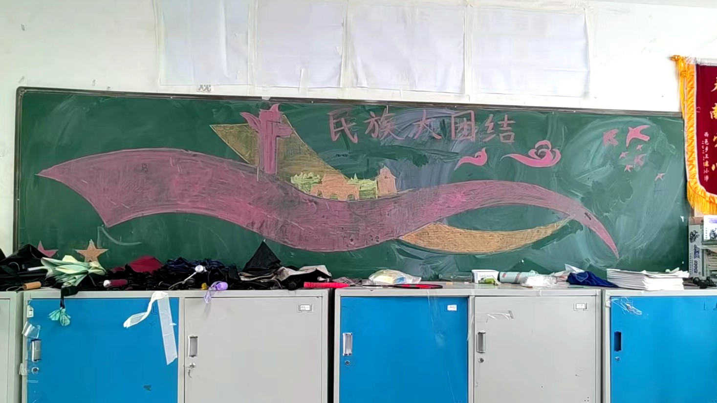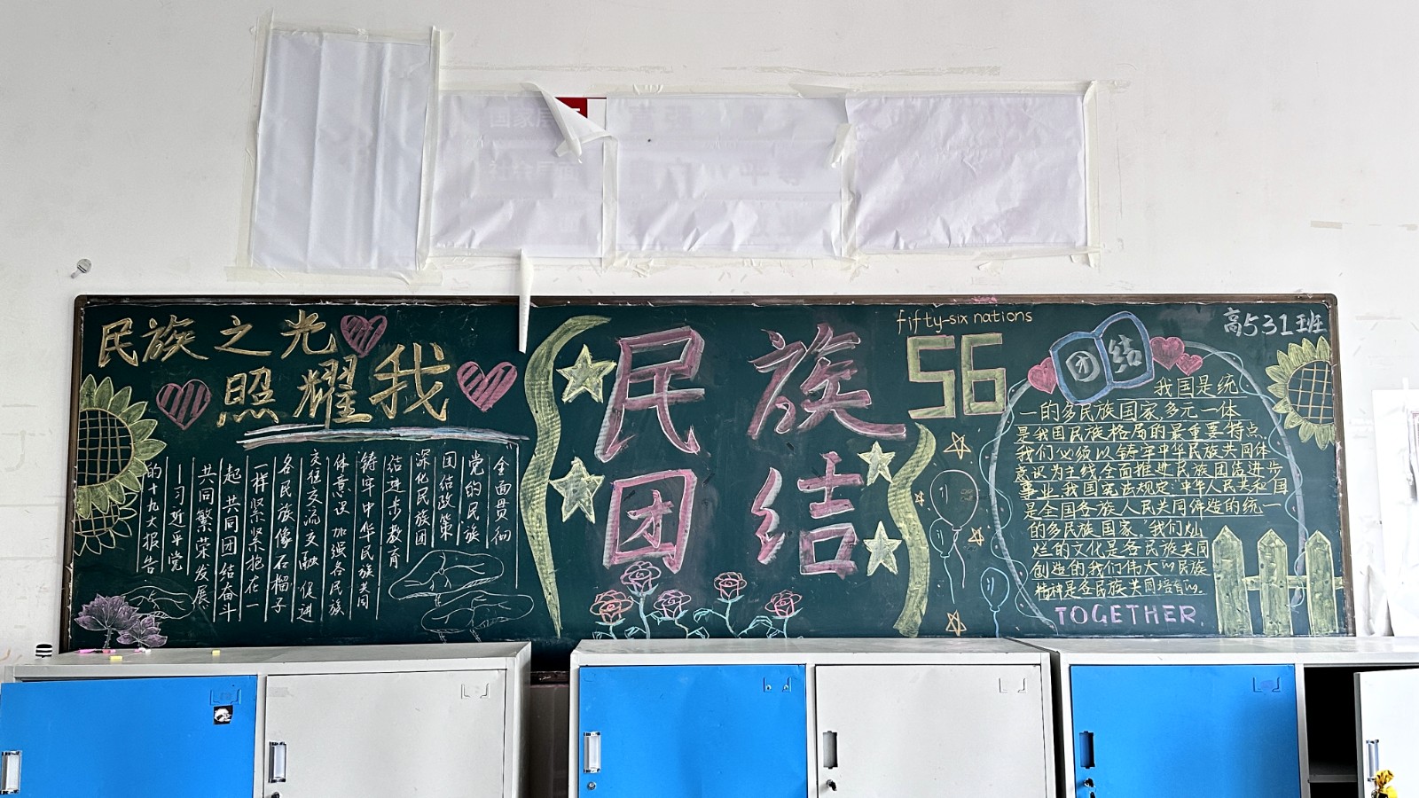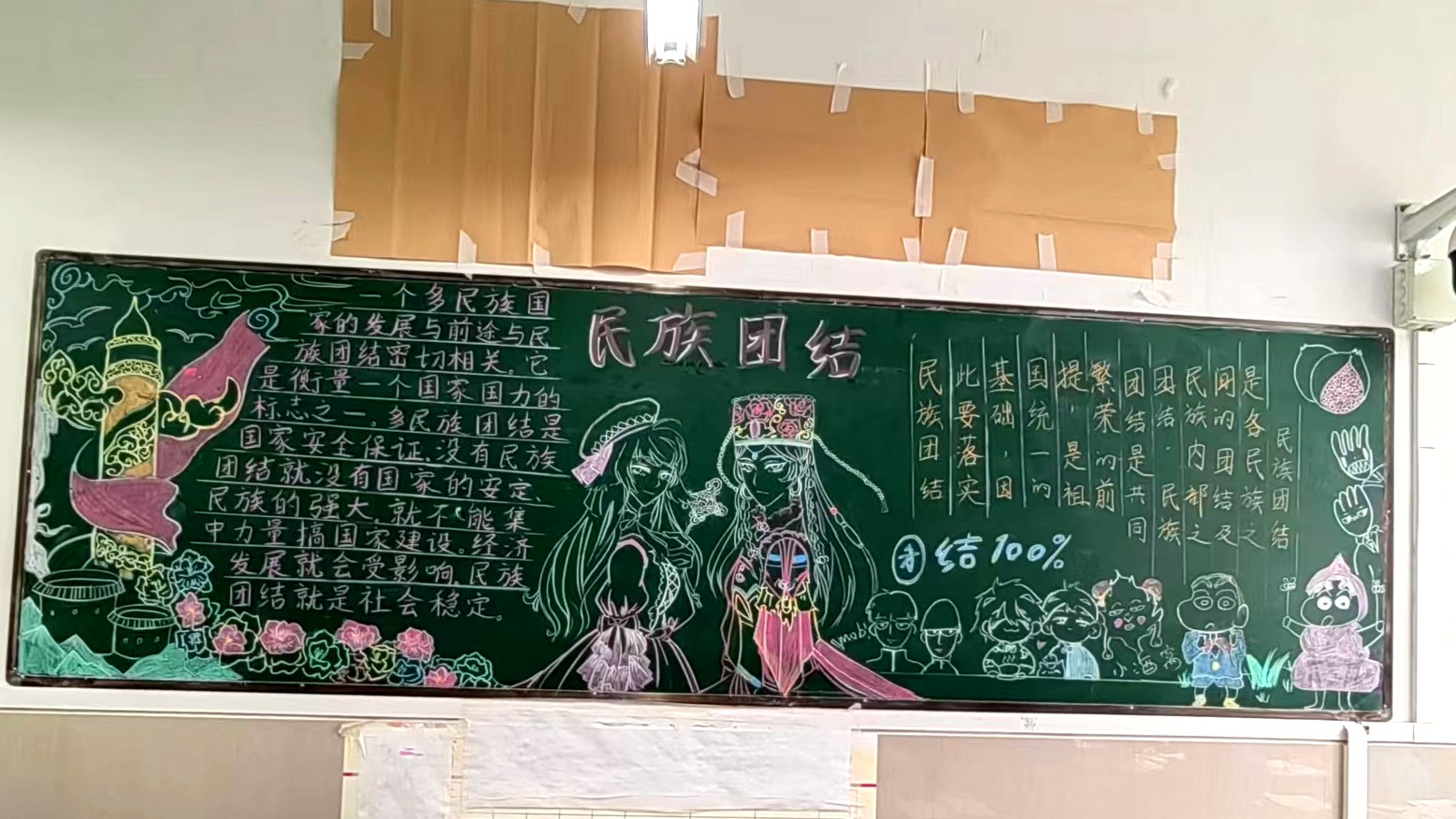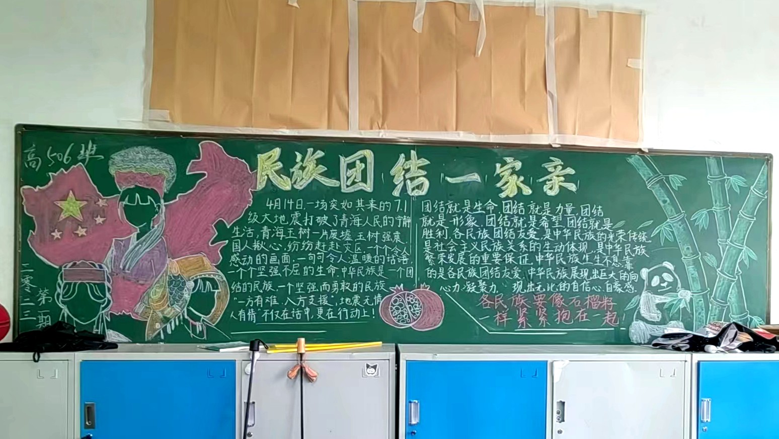 为学习宣传贯彻党的二十大精神,深入学习领会习近平总书记关于加强和改进民族工作的重要思想,通过扎实有效的民族团结进步教育,教育引导全校师生切实铸牢中华民族共同体意识,教育引导广大学生践行爱国主义,培育家国情怀,自觉投身于共同团结奋斗、共同繁荣发展的伟大实践,成长为德智体美劳全面发展的社会主义建设者和接班人。保山一中组织高一、高二年级以“民族团结进步教育”为主题开展创意板报设计展示,各个班级积极开展,同学们集思广益,用粉笔绘画和书写民族团结进步发展,用内心表达和传递爱国情怀。