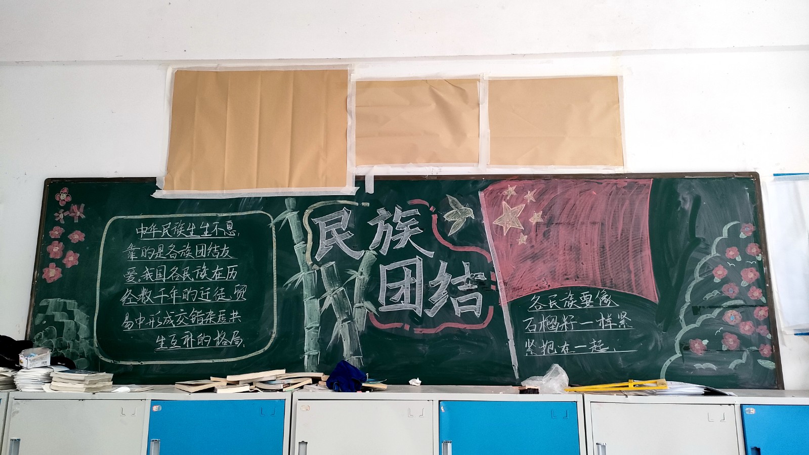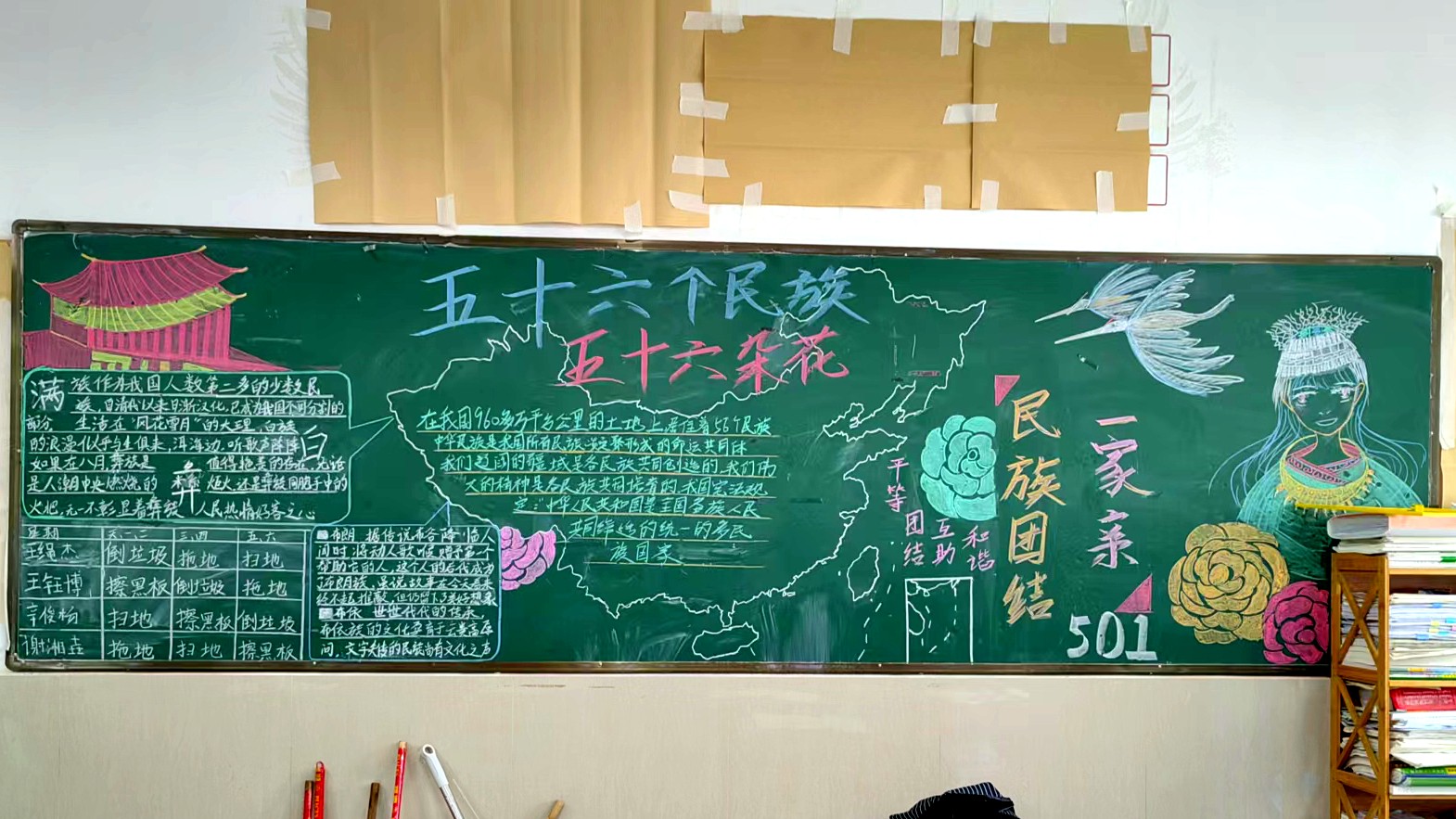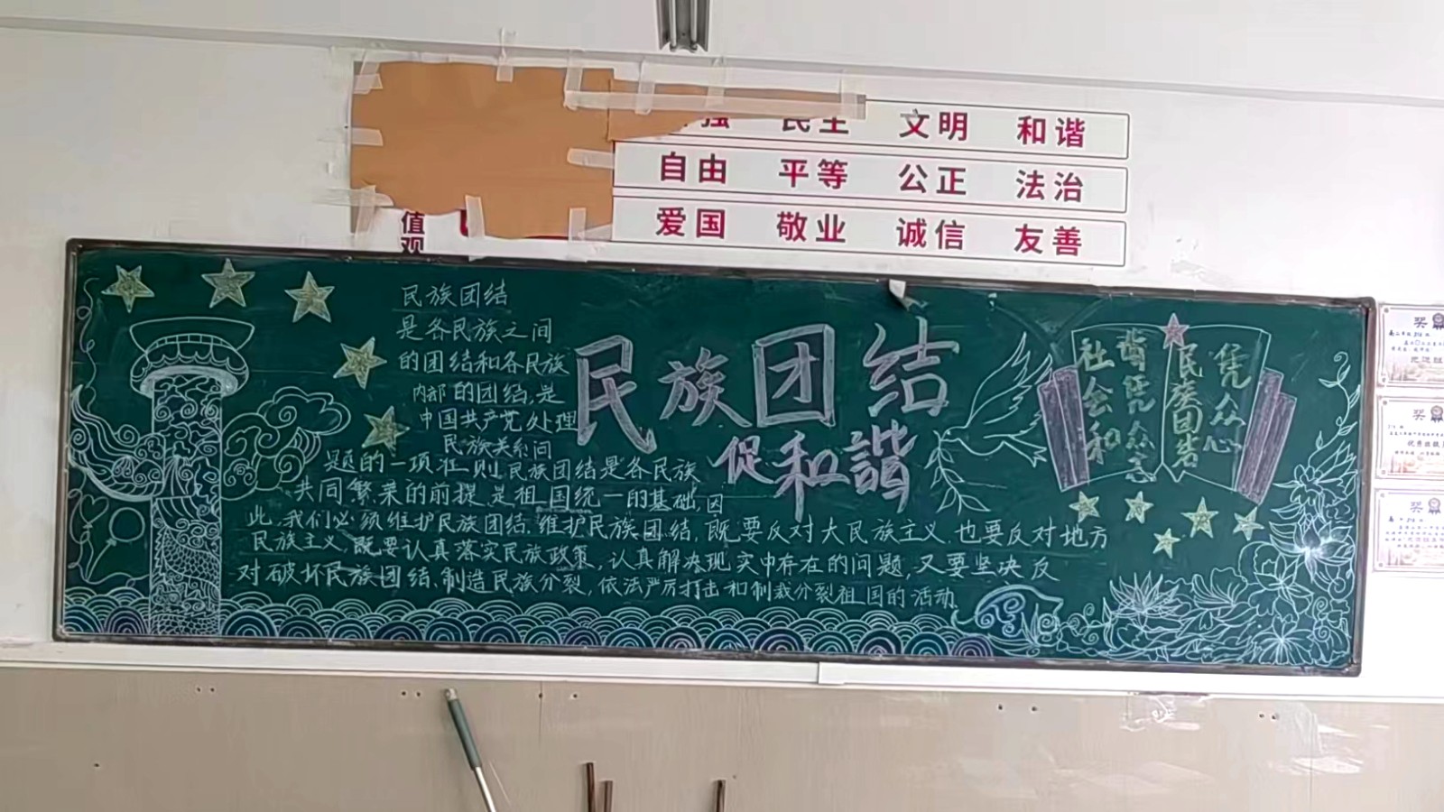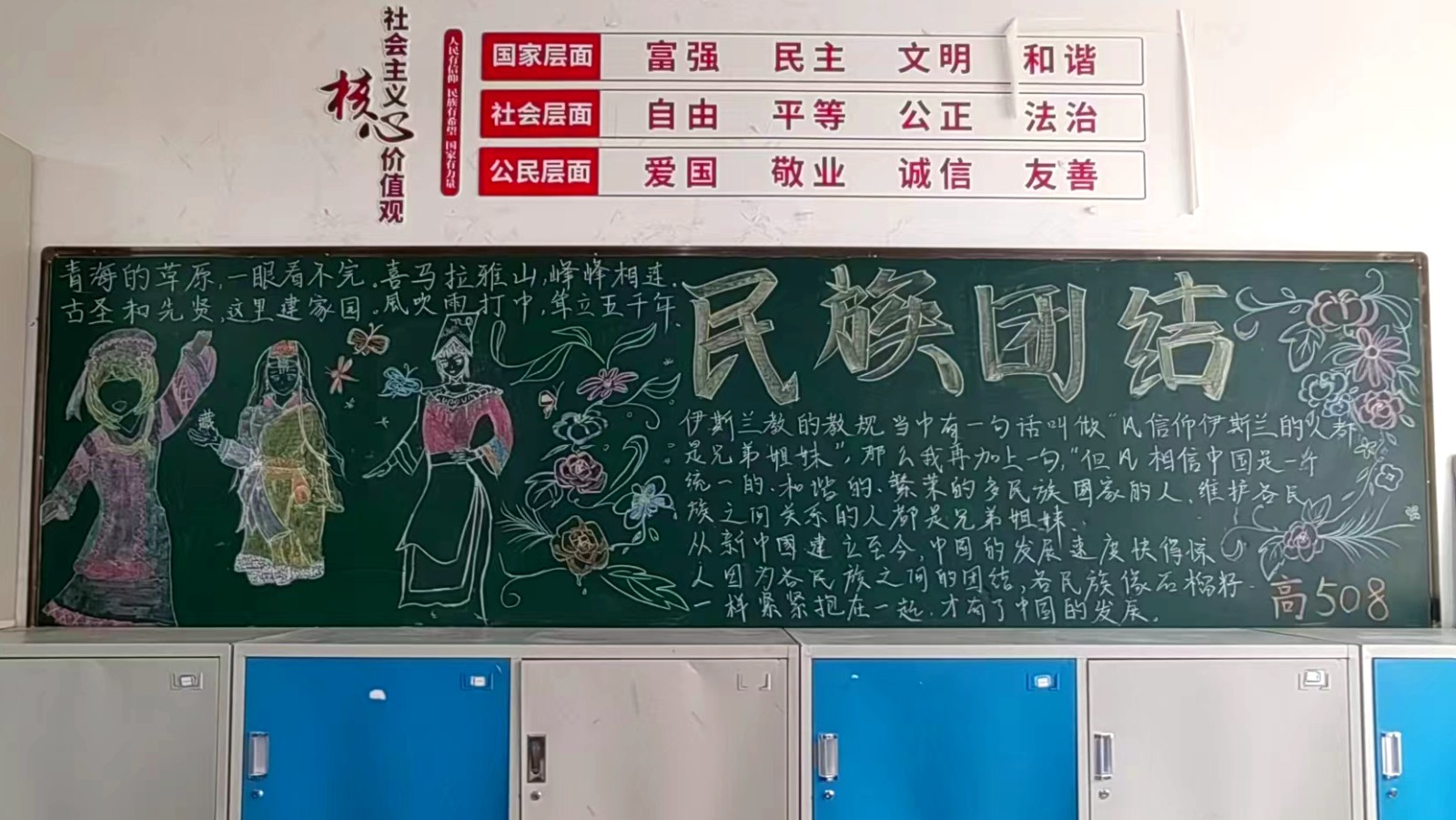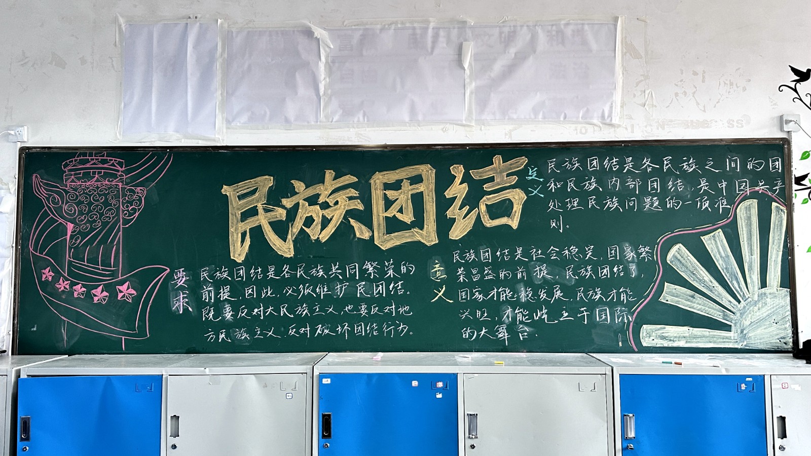 为学习宣传贯彻党的二十大精神,深入学习领会习近平总书记关于加强和改进民族工作的重要思想,通过扎实有效的民族团结进步教育,教育引导全校师生切实铸牢中华民族共同体意识,教育引导广大学生践行爱国主义,培育家国情怀,自觉投身于共同团结奋斗、共同繁荣发展的伟大实践,成长为德智体美劳全面发展的社会主义建设者和接班人。保山一中组织高一、高二年级以“民族团结进步教育”为主题开展创意板报设计展示,各个班级积极开展,同学们集思广益,用粉笔绘画和书写民族团结进步发展,用内心表达和传递爱国情怀。