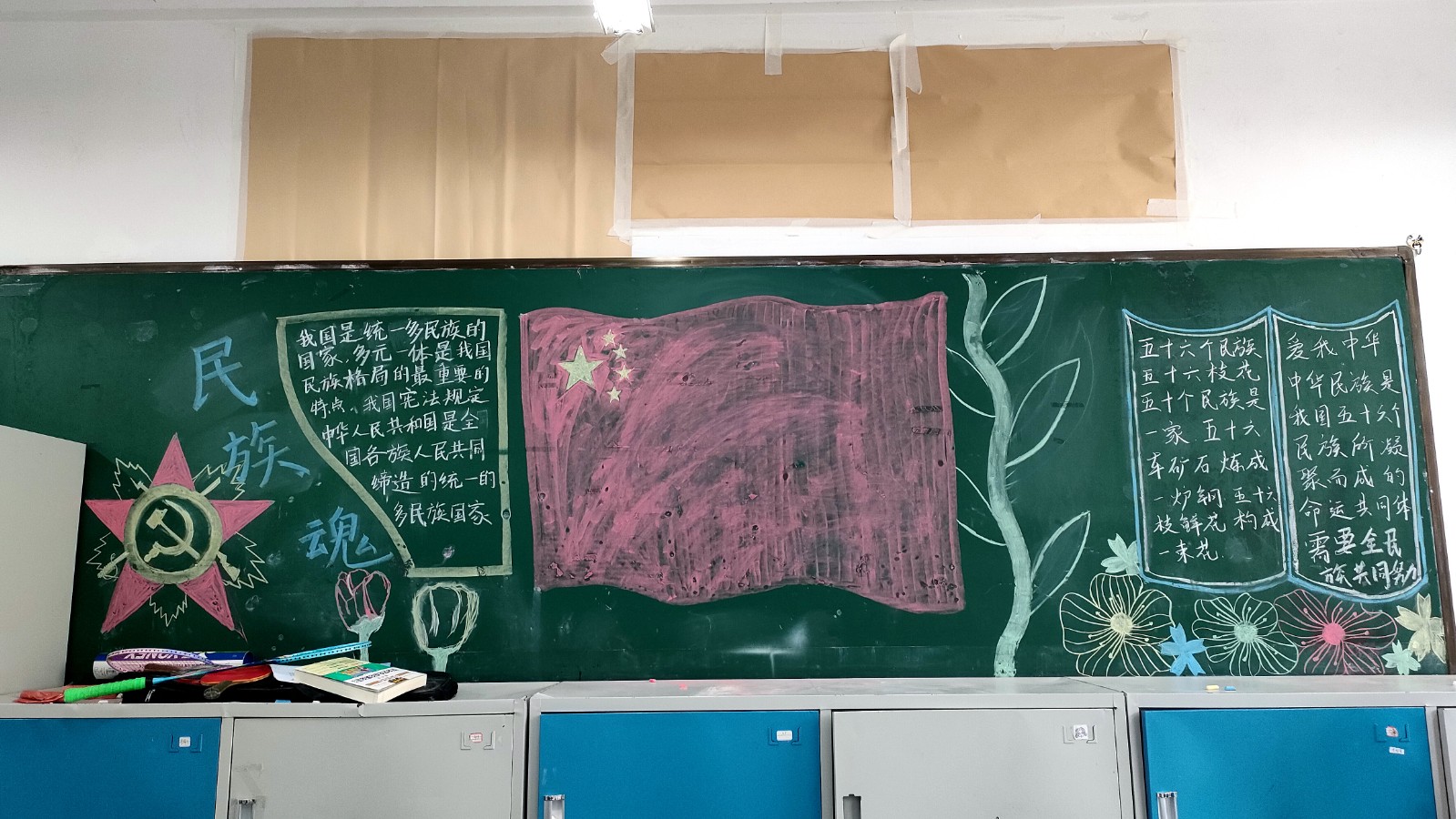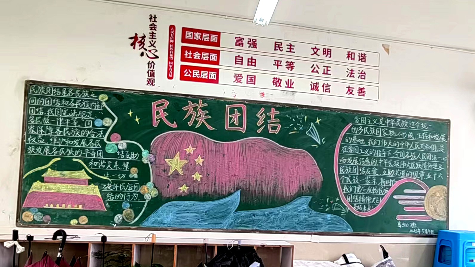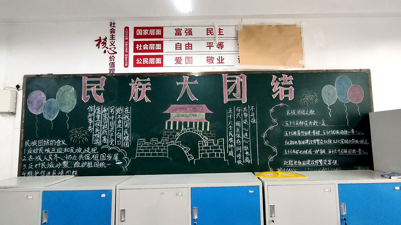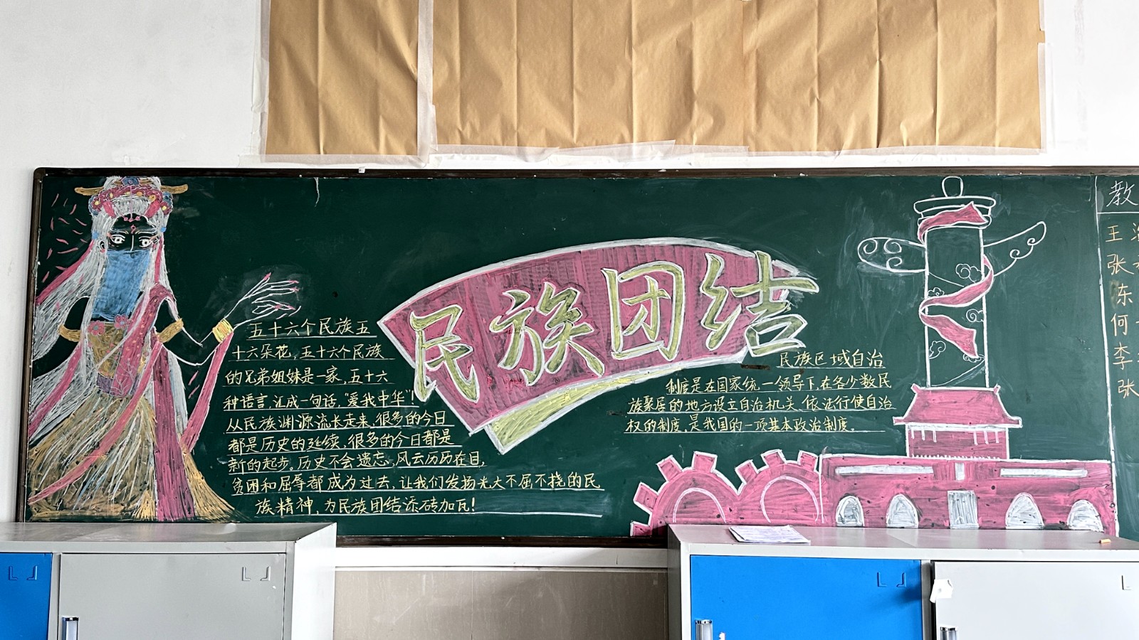 为学习宣传贯彻党的二十大精神,深入学习领会习近平总书记关于加强和改进民族工作的重要思想,通过扎实有效的民族团结进步教育,教育引导全校师生切实铸牢中华民族共同体意识,教育引导广大学生践行爱国主义,培育家国情怀,自觉投身于共同团结奋斗、共同繁荣发展的伟大实践,成长为德智体美劳全面发展的社会主义建设者和接班人。保山一中组织高一、高二年级以“民族团结进步教育”为主题开展创意板报设计展示,各个班级积极开展,同学们集思广益,用粉笔绘画和书写民族团结进步发展,用内心表达和传递爱国情怀。