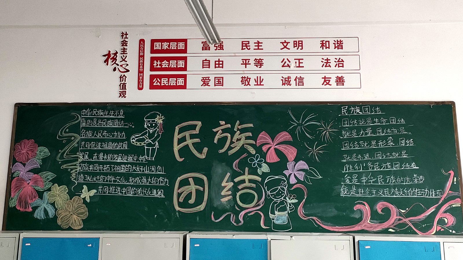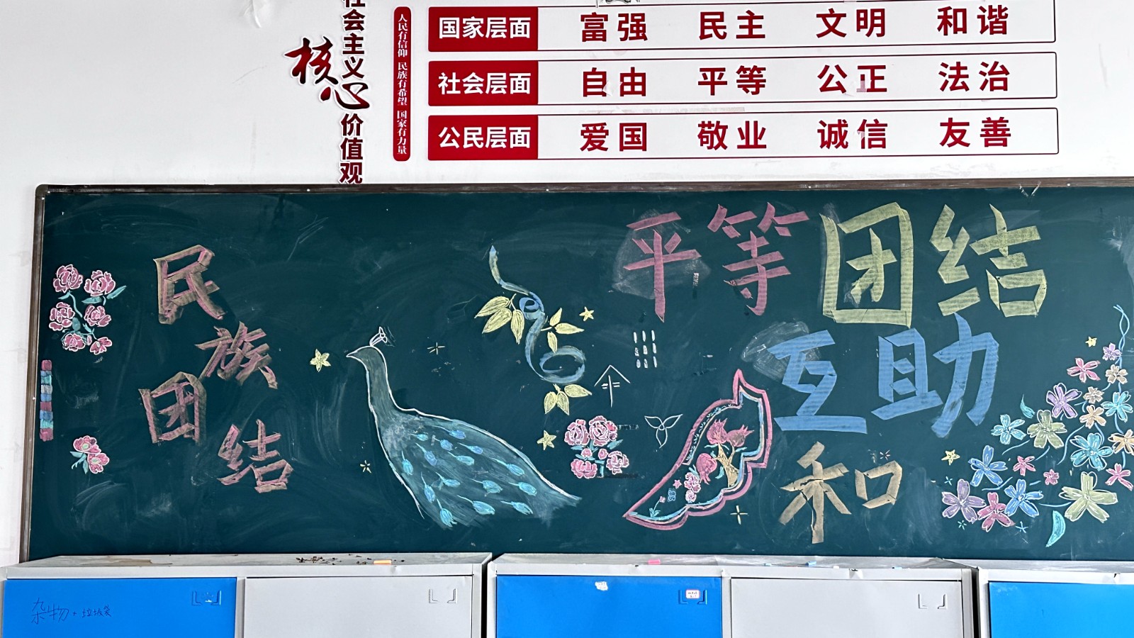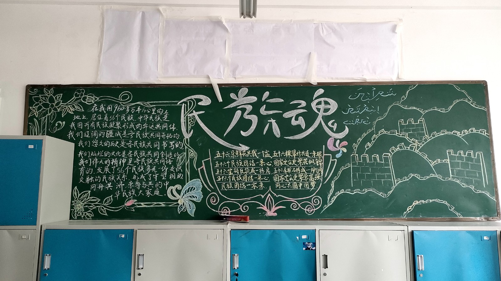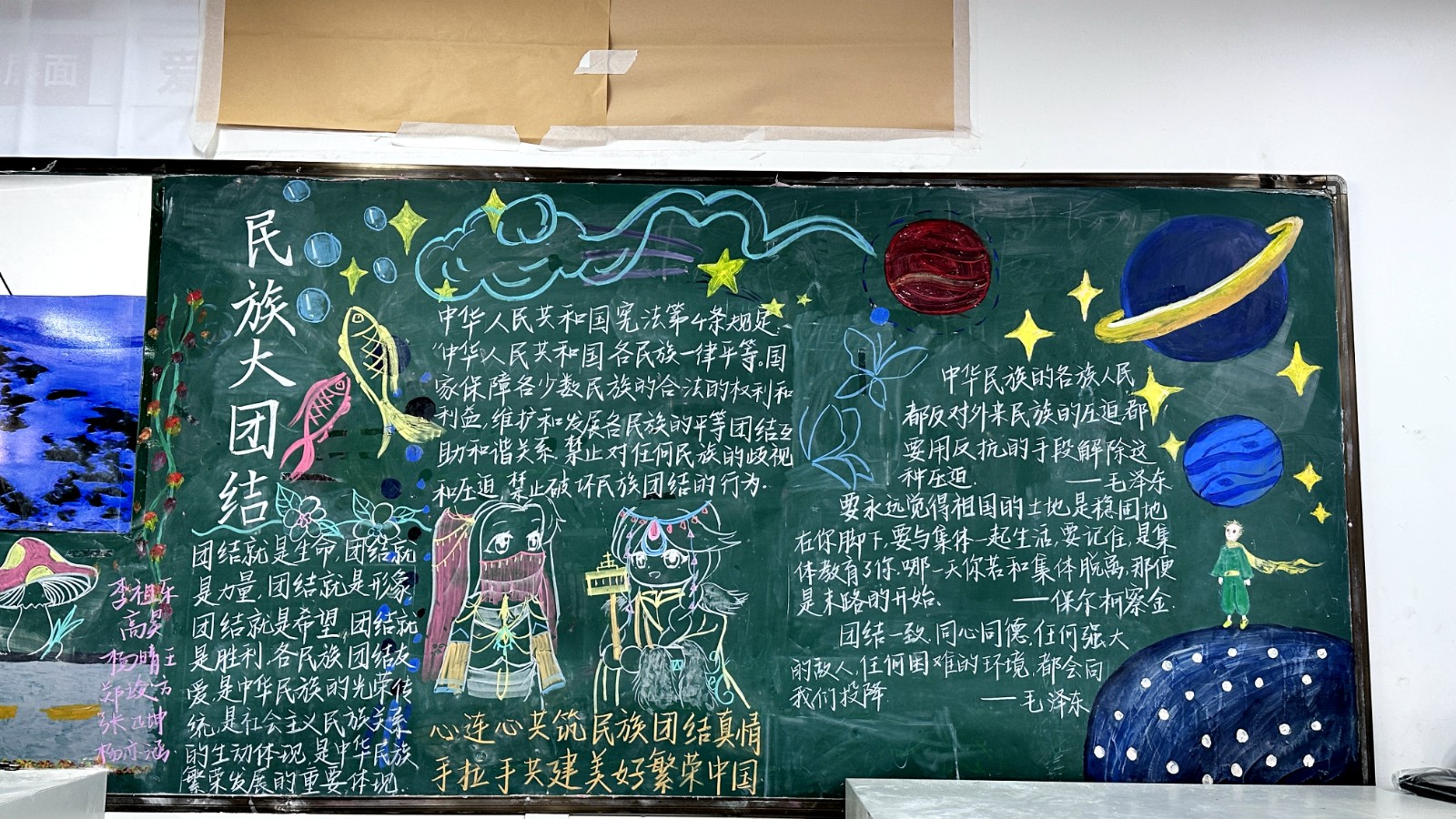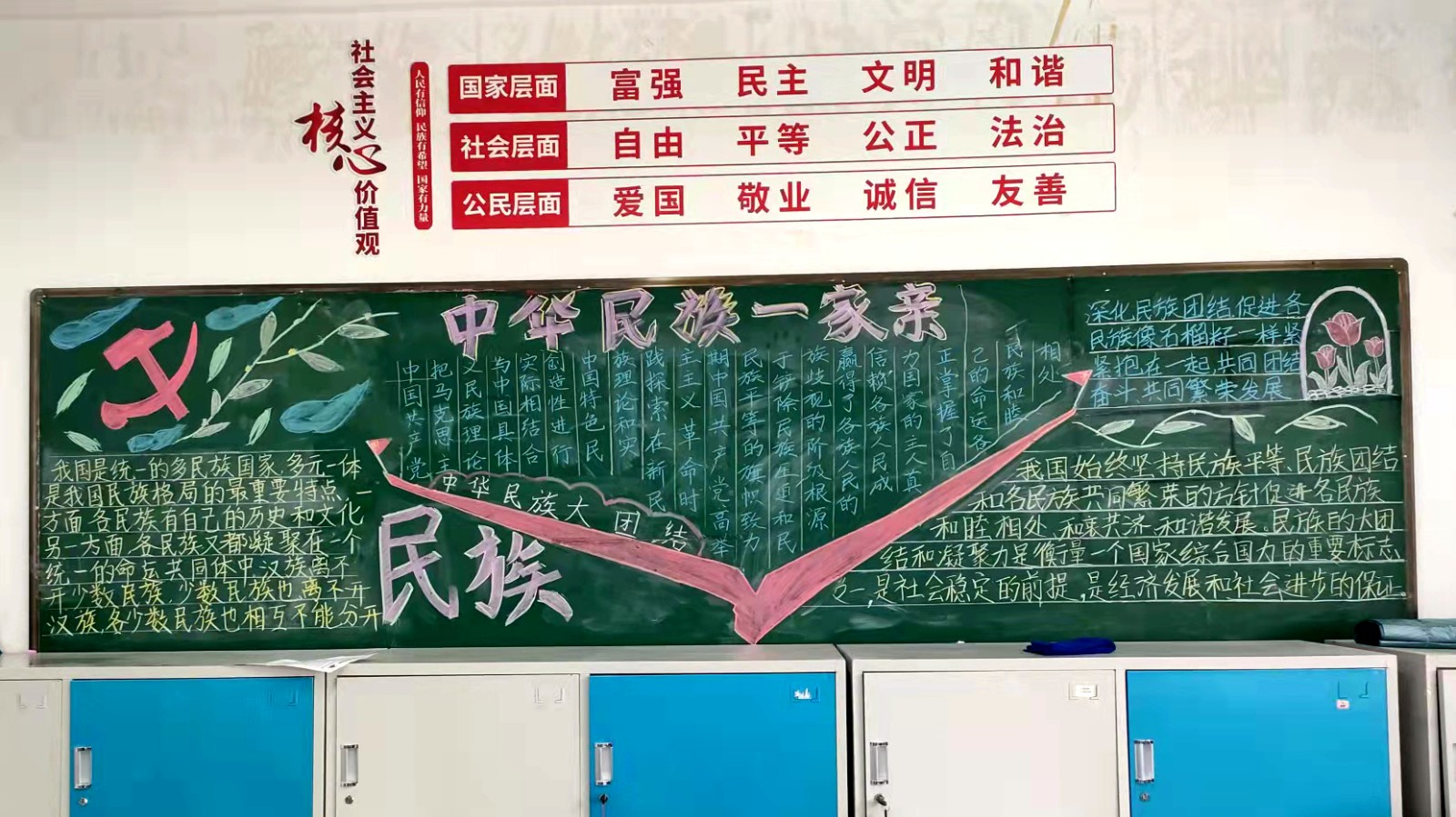 为学习宣传贯彻党的二十大精神,深入学习领会习近平总书记关于加强和改进民族工作的重要思想,通过扎实有效的民族团结进步教育,教育引导全校师生切实铸牢中华民族共同体意识,教育引导广大学生践行爱国主义,培育家国情怀,自觉投身于共同团结奋斗、共同繁荣发展的伟大实践,成长为德智体美劳全面发展的社会主义建设者和接班人。保山一中组织高一、高二年级以“民族团结进步教育”为主题开展创意板报设计展示,各个班级积极开展,同学们集思广益,用粉笔绘画和书写民族团结进步发展,用内心表达和传递爱国情怀。