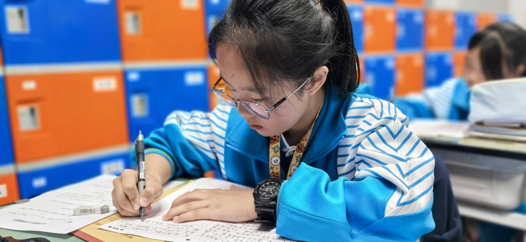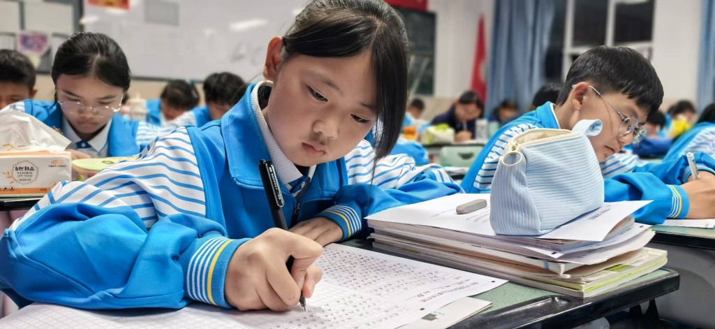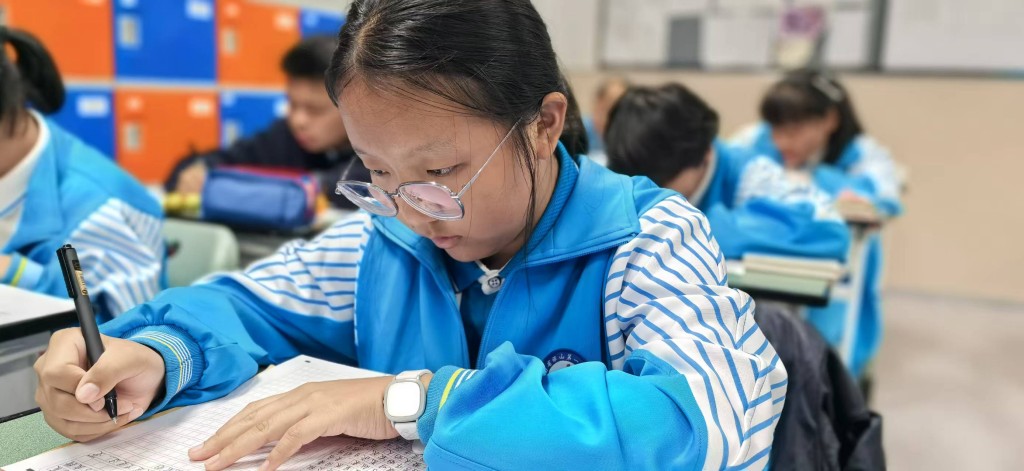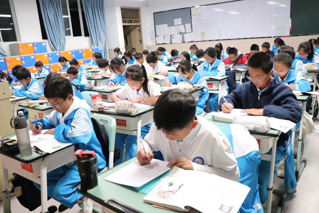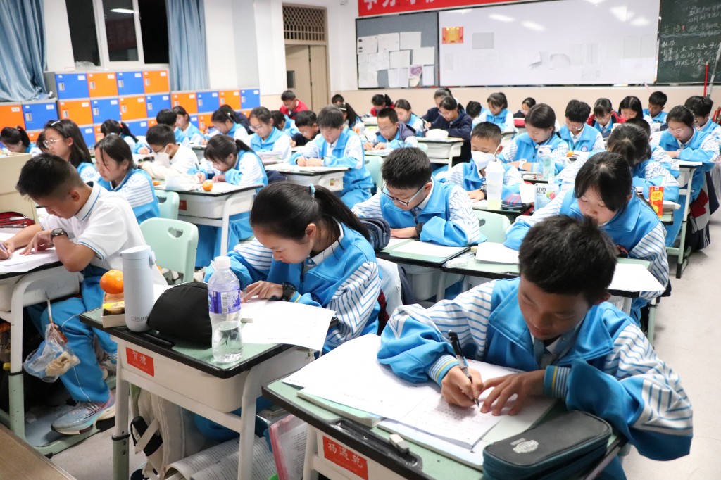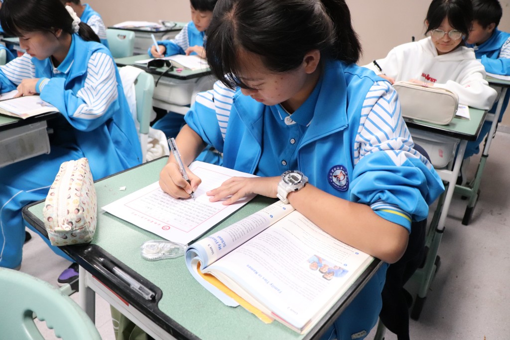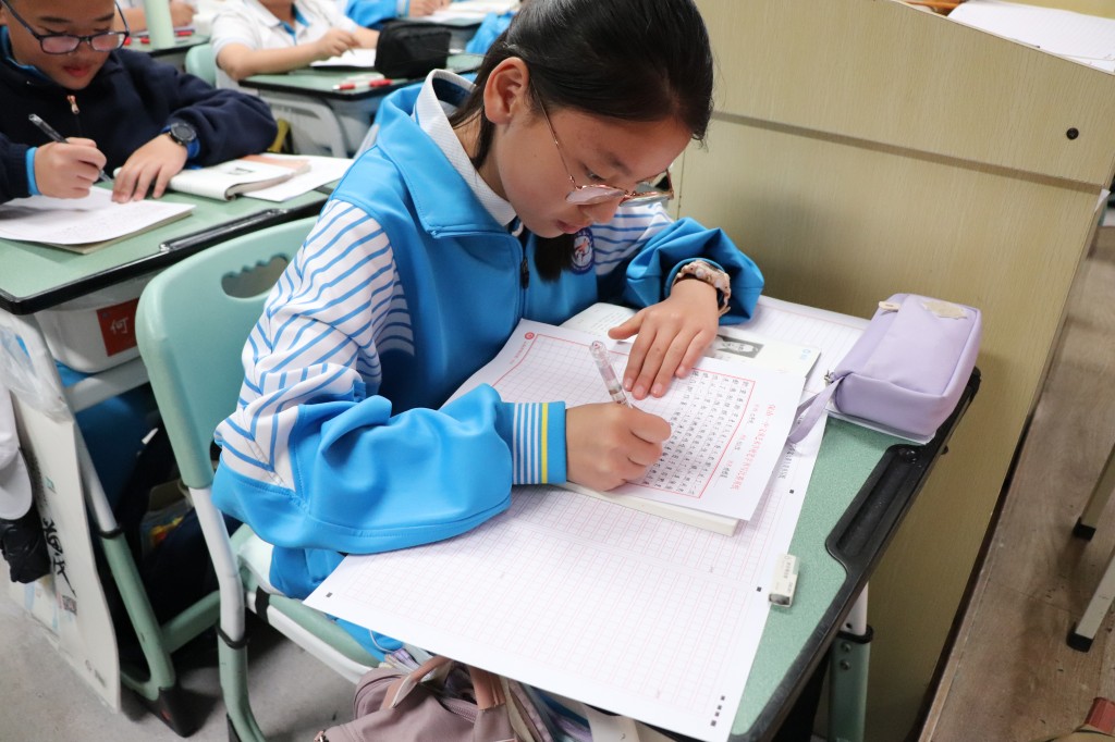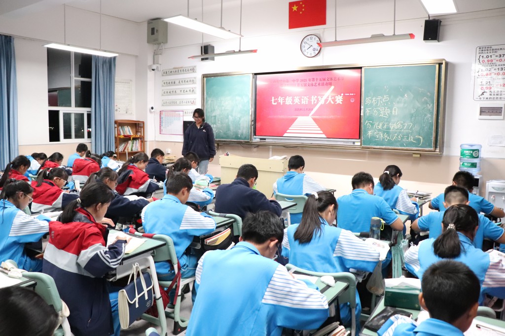 在英文书写赛场,别有一番国际风情。同学们以笔为媒,用流畅优美的英文字体,搭建起通往世界的桥梁。你瞧,同学们专注地书写着每一个单词,字迹工整清晰,规范美观,严谨而细致。