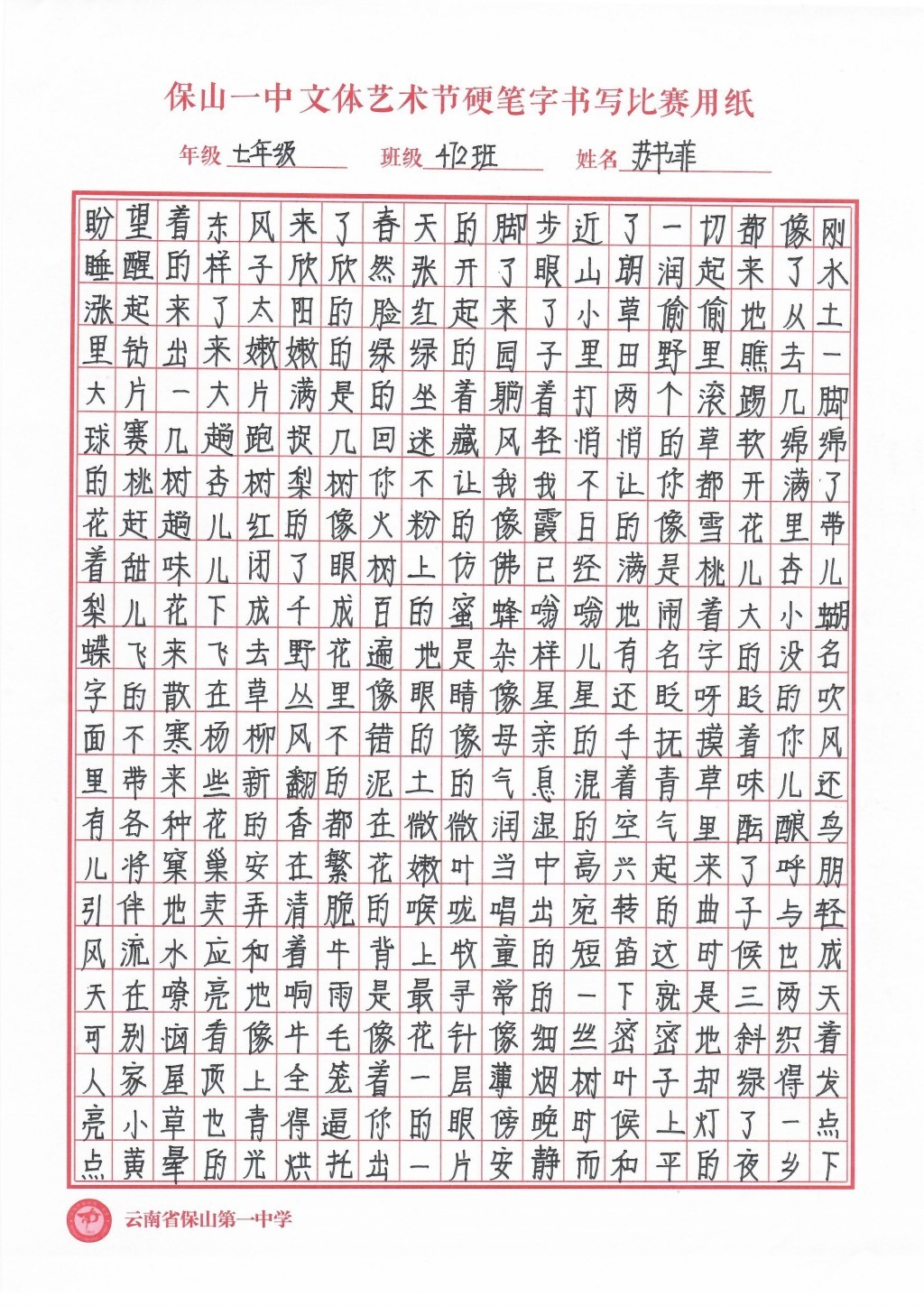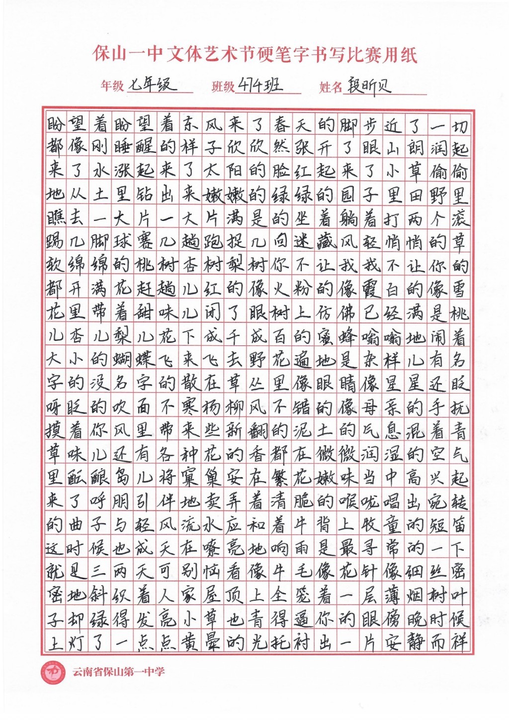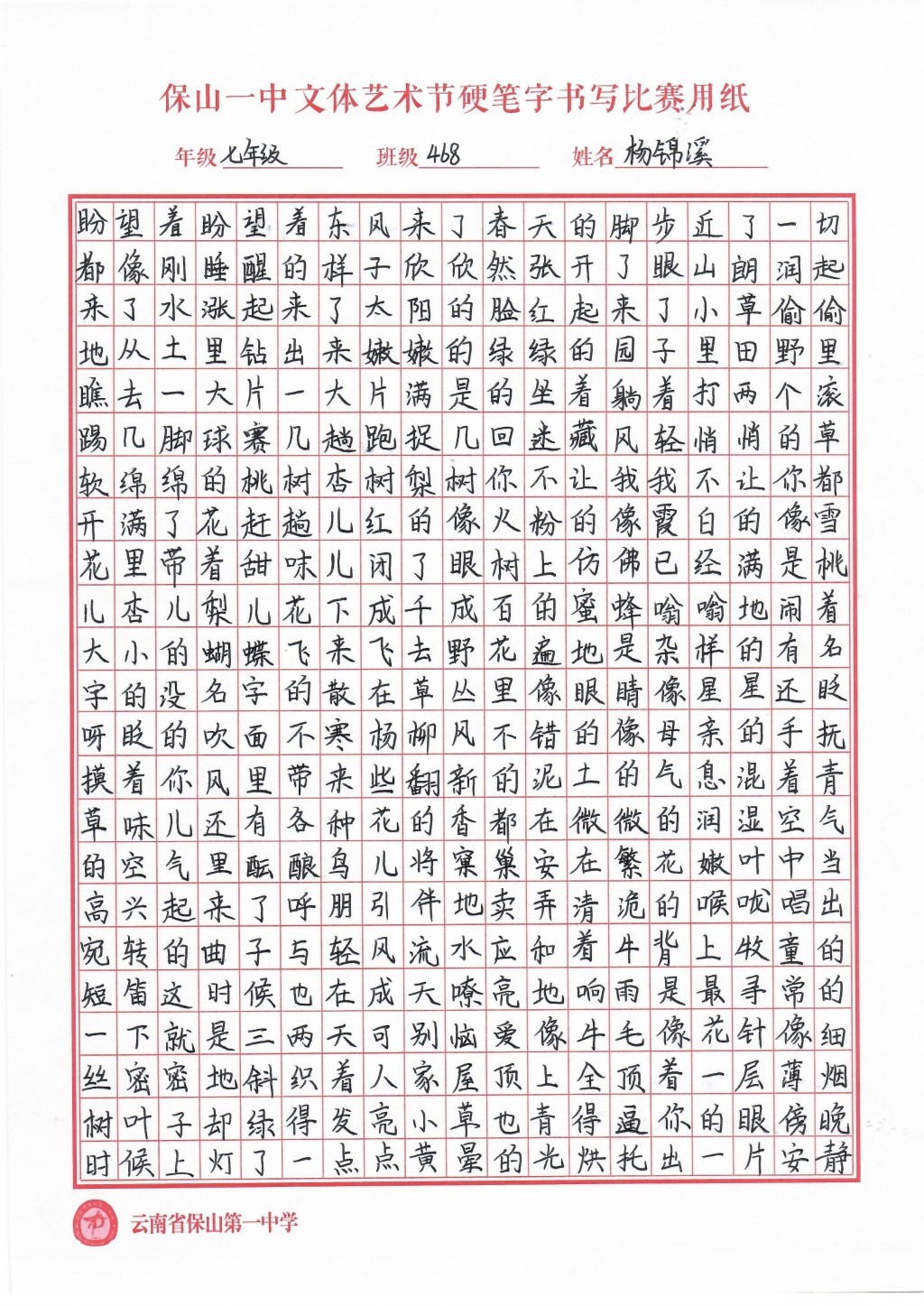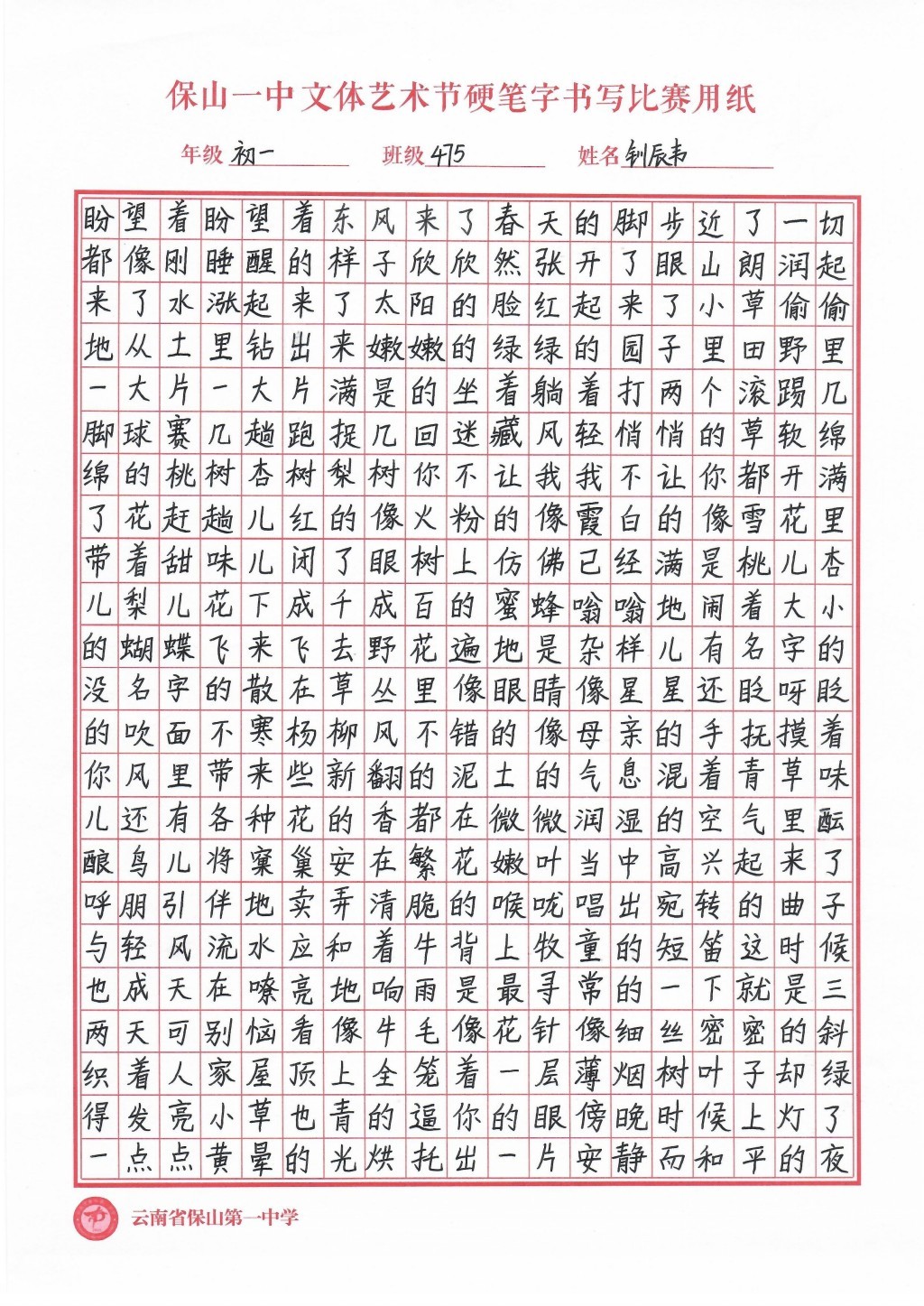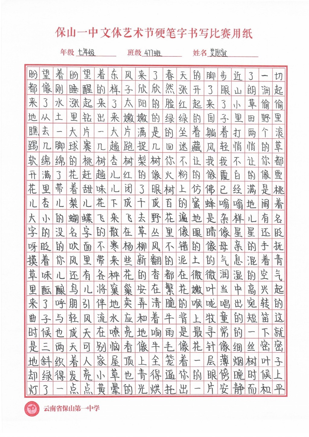 汉字书写大赛 一等奖