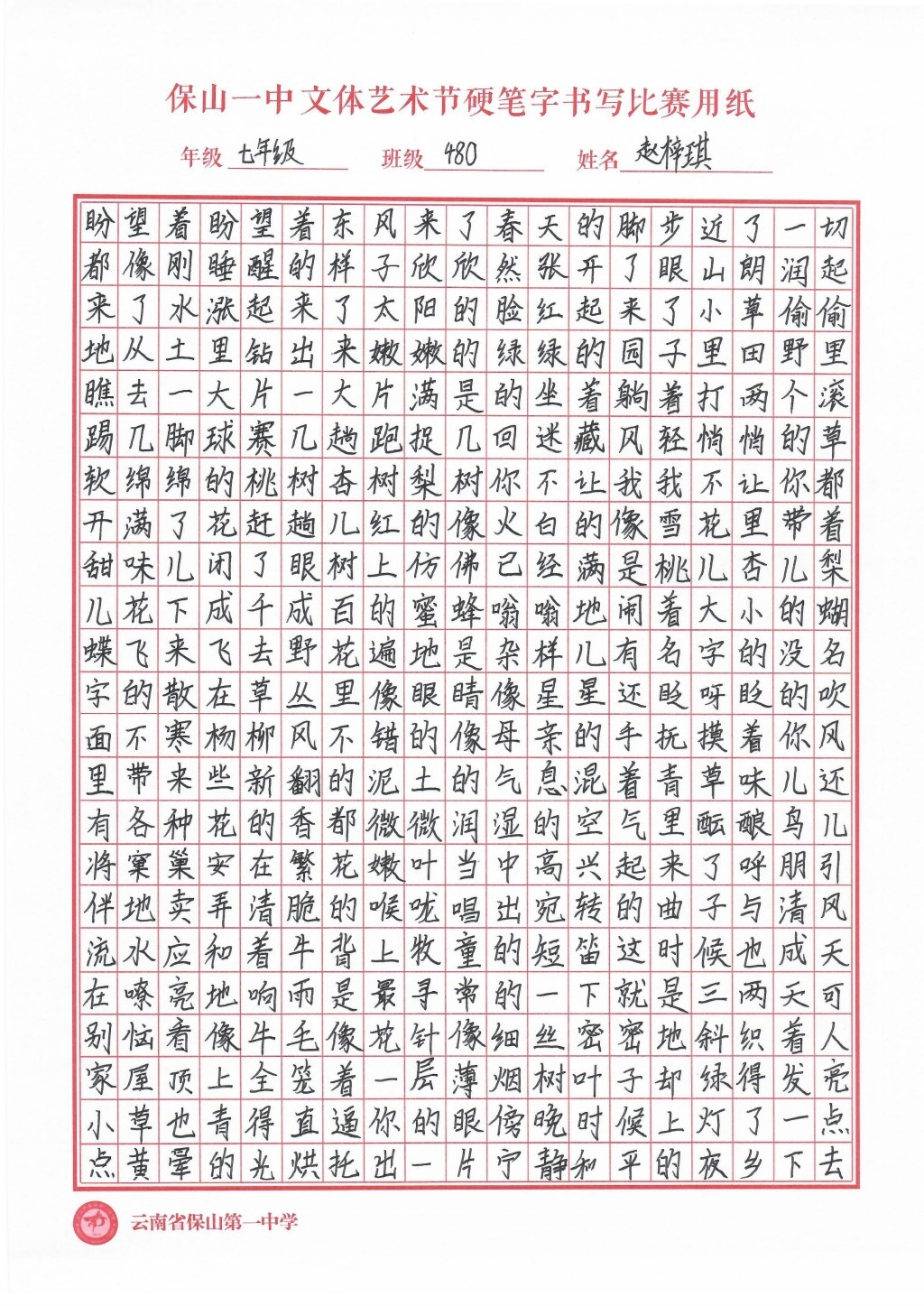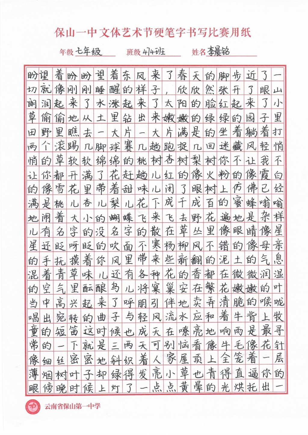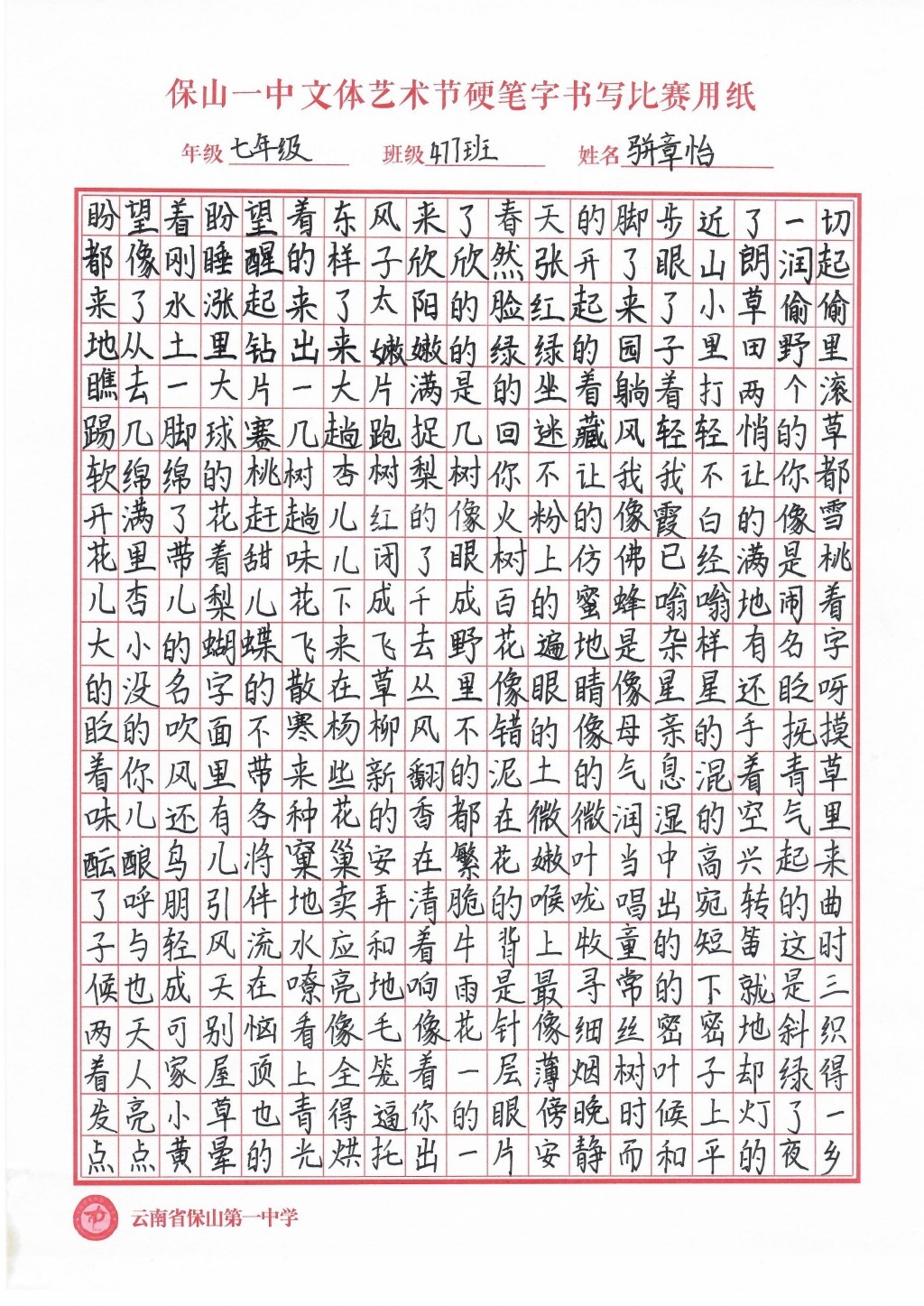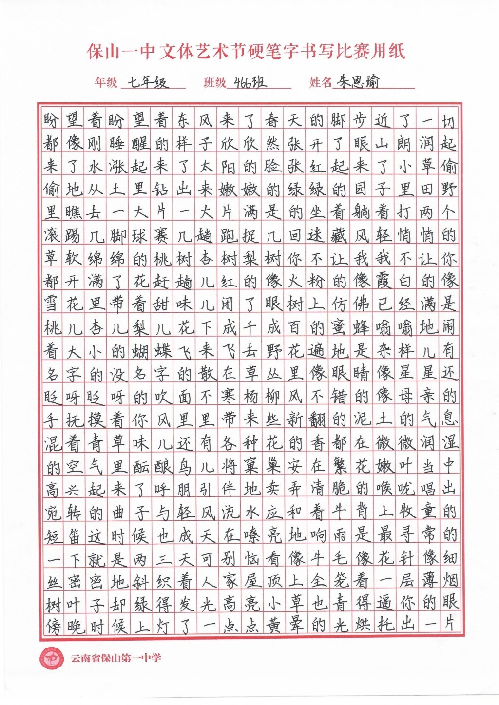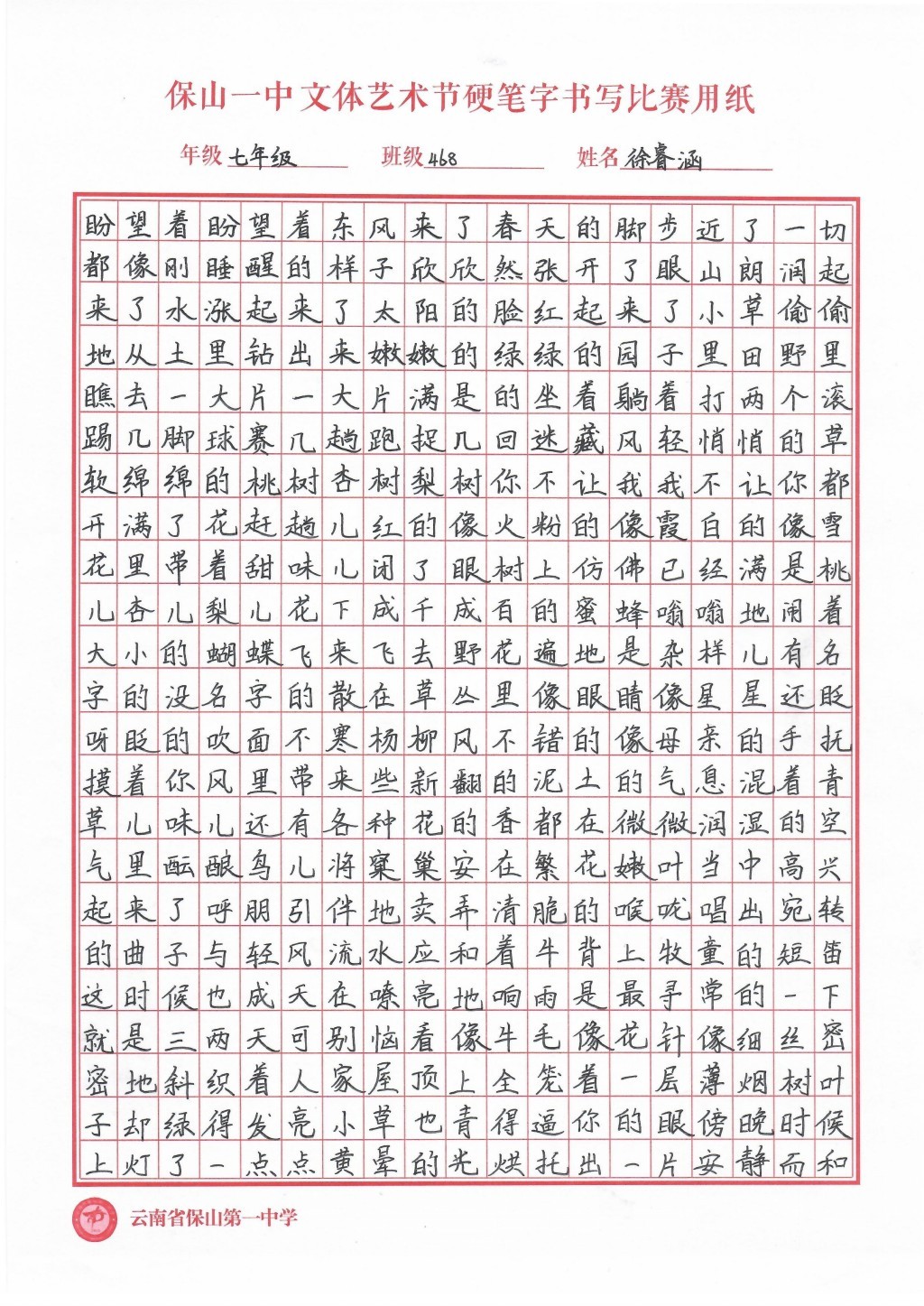 汉字书写大赛 一等奖