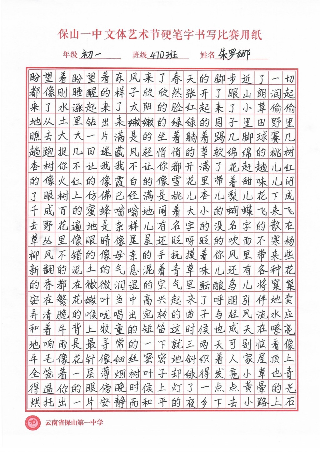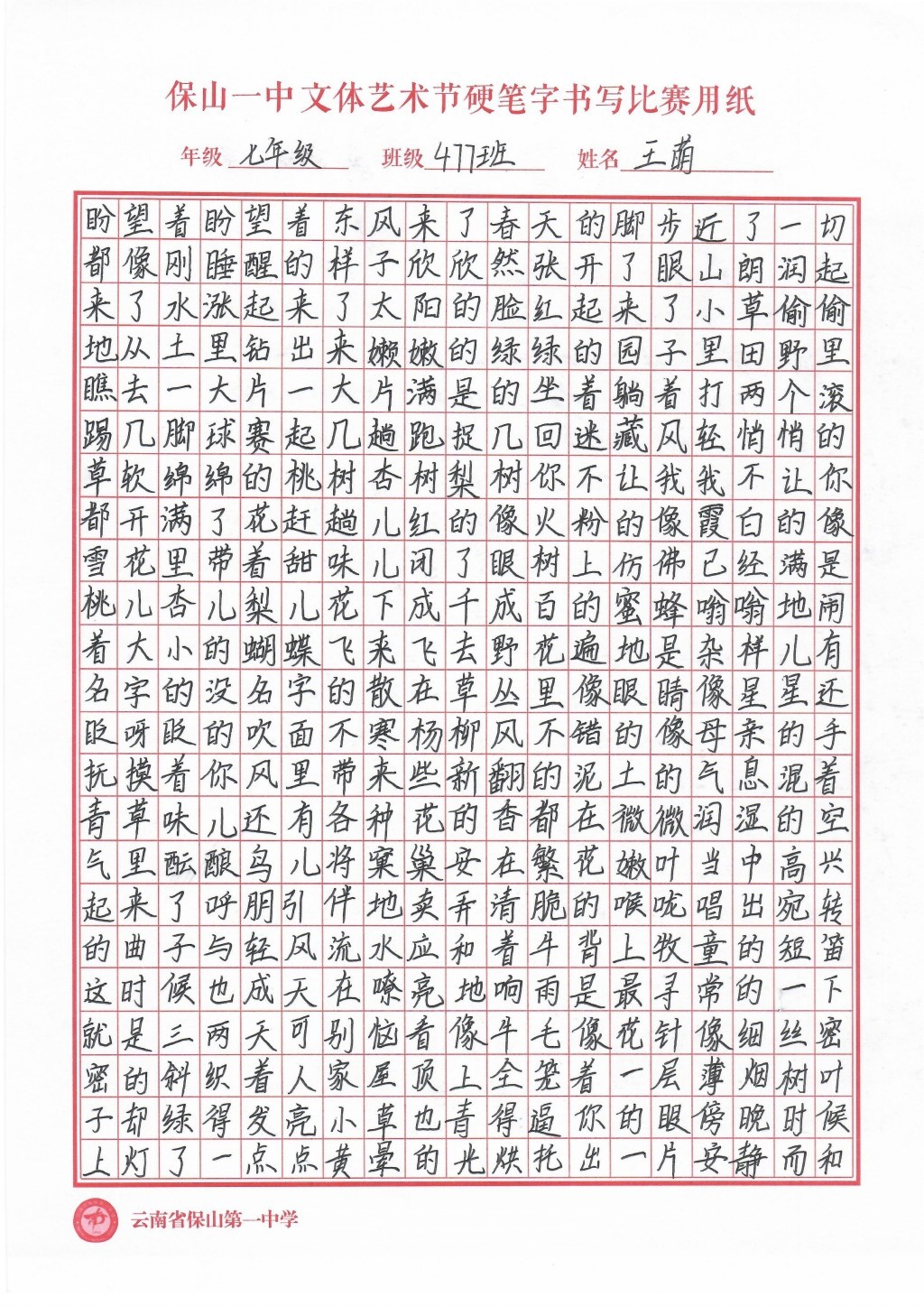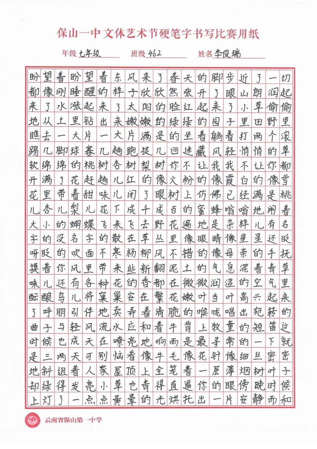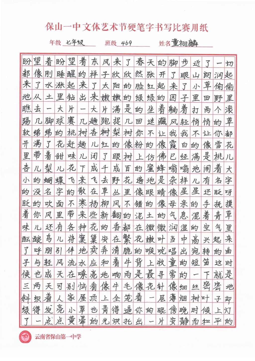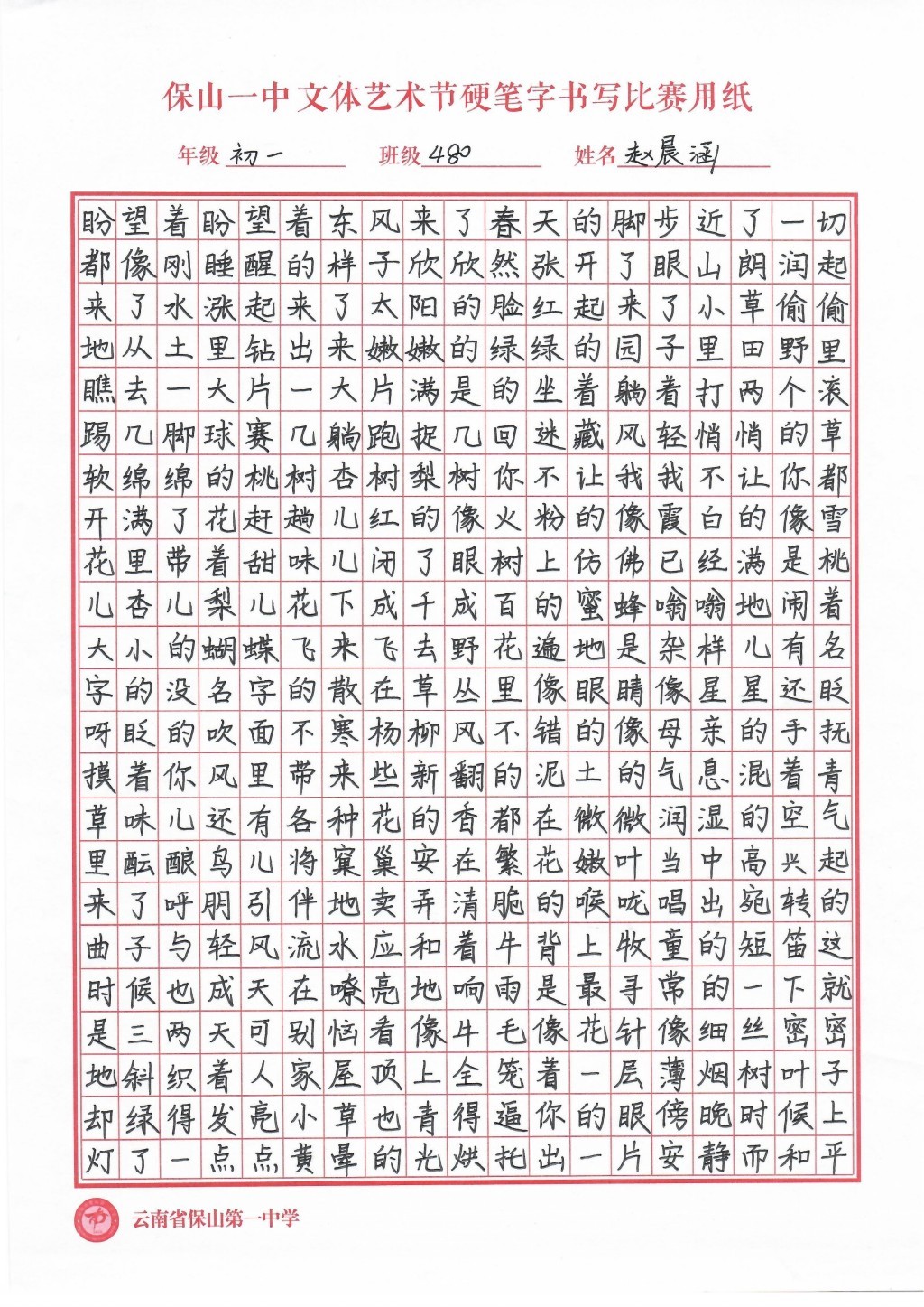 汉字书写大赛 一等奖
