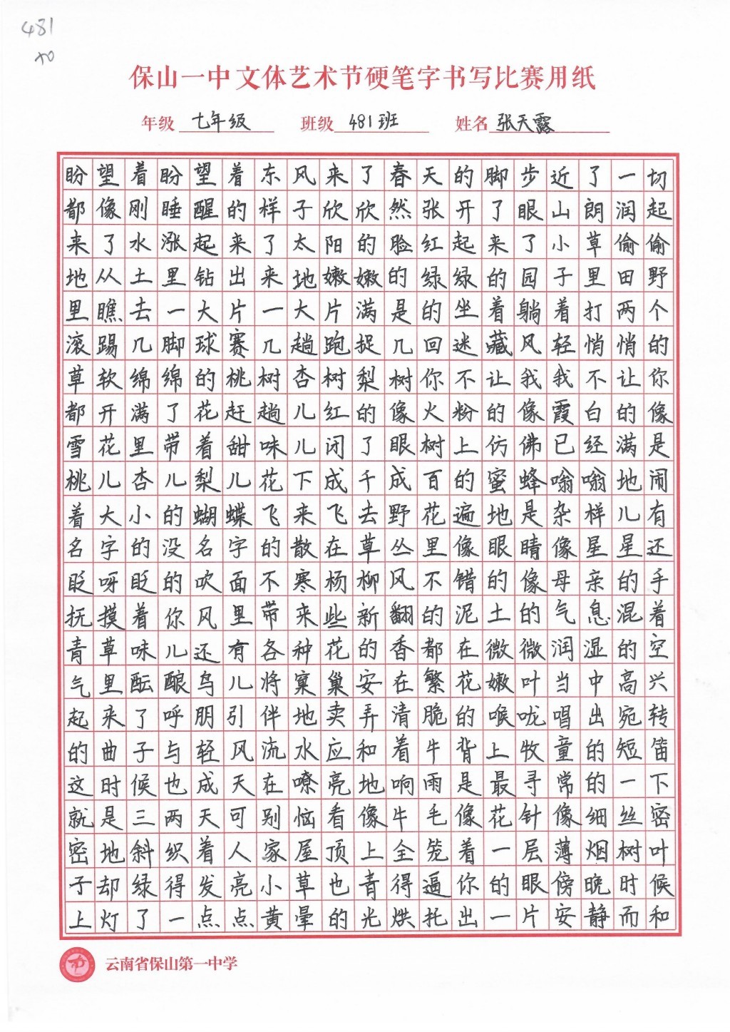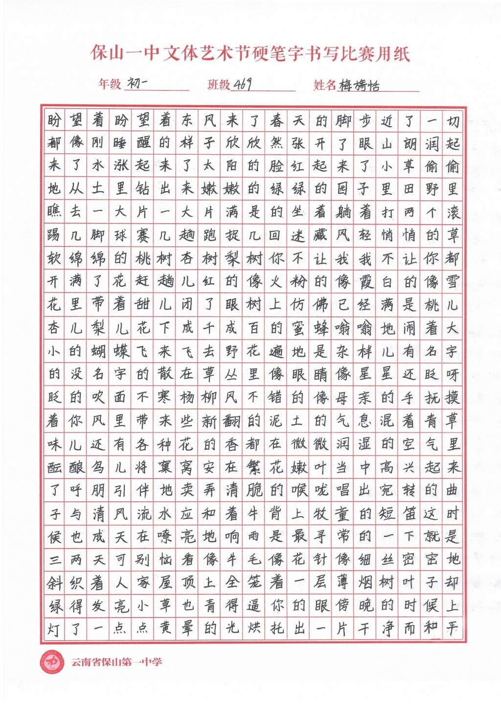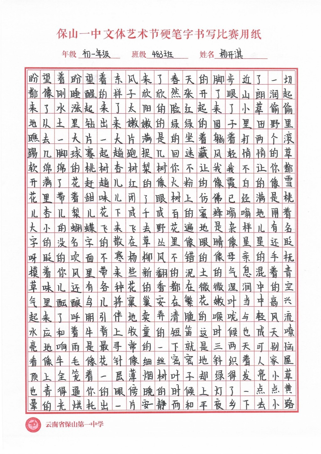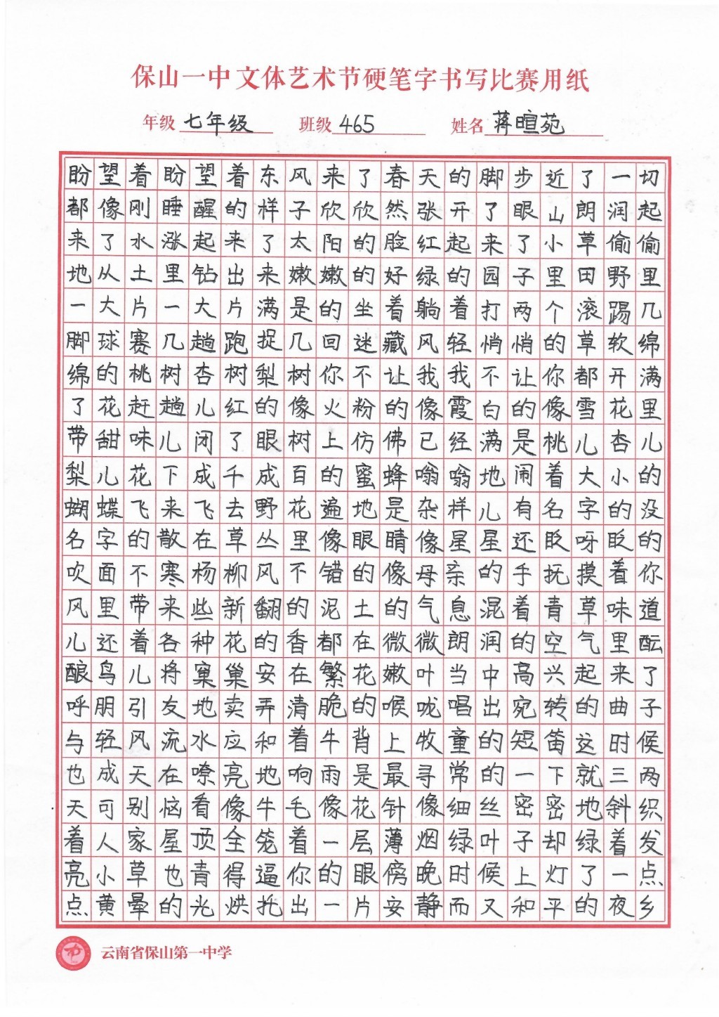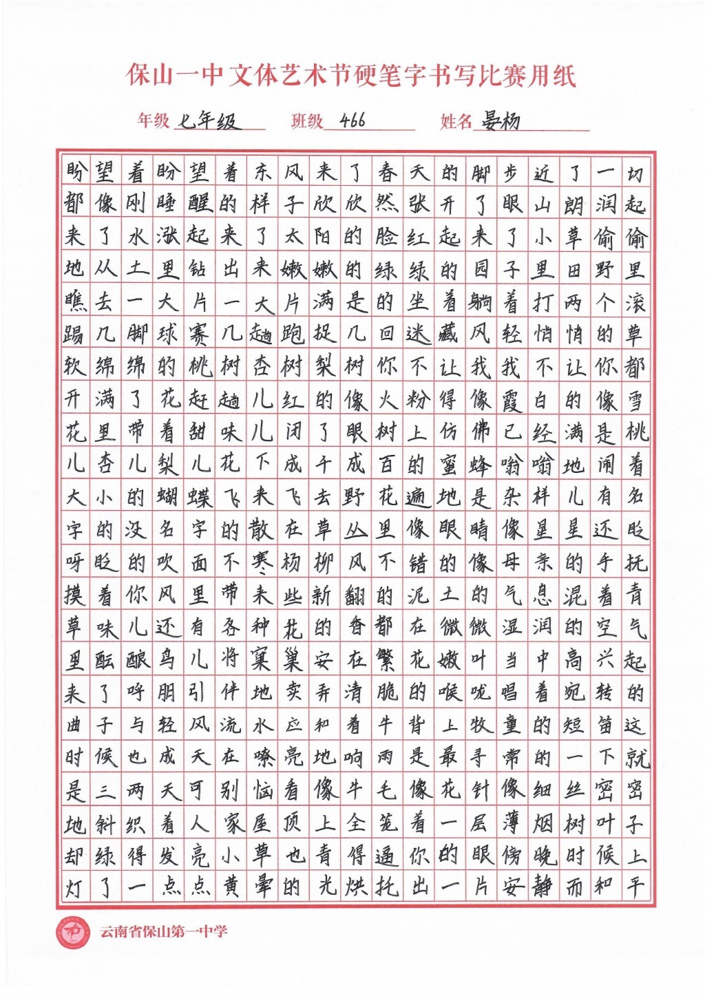 汉字书写大赛 一等奖